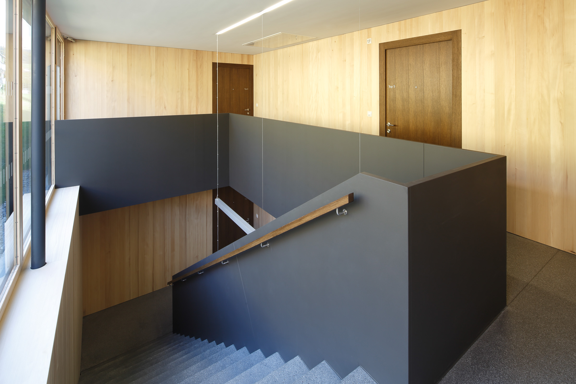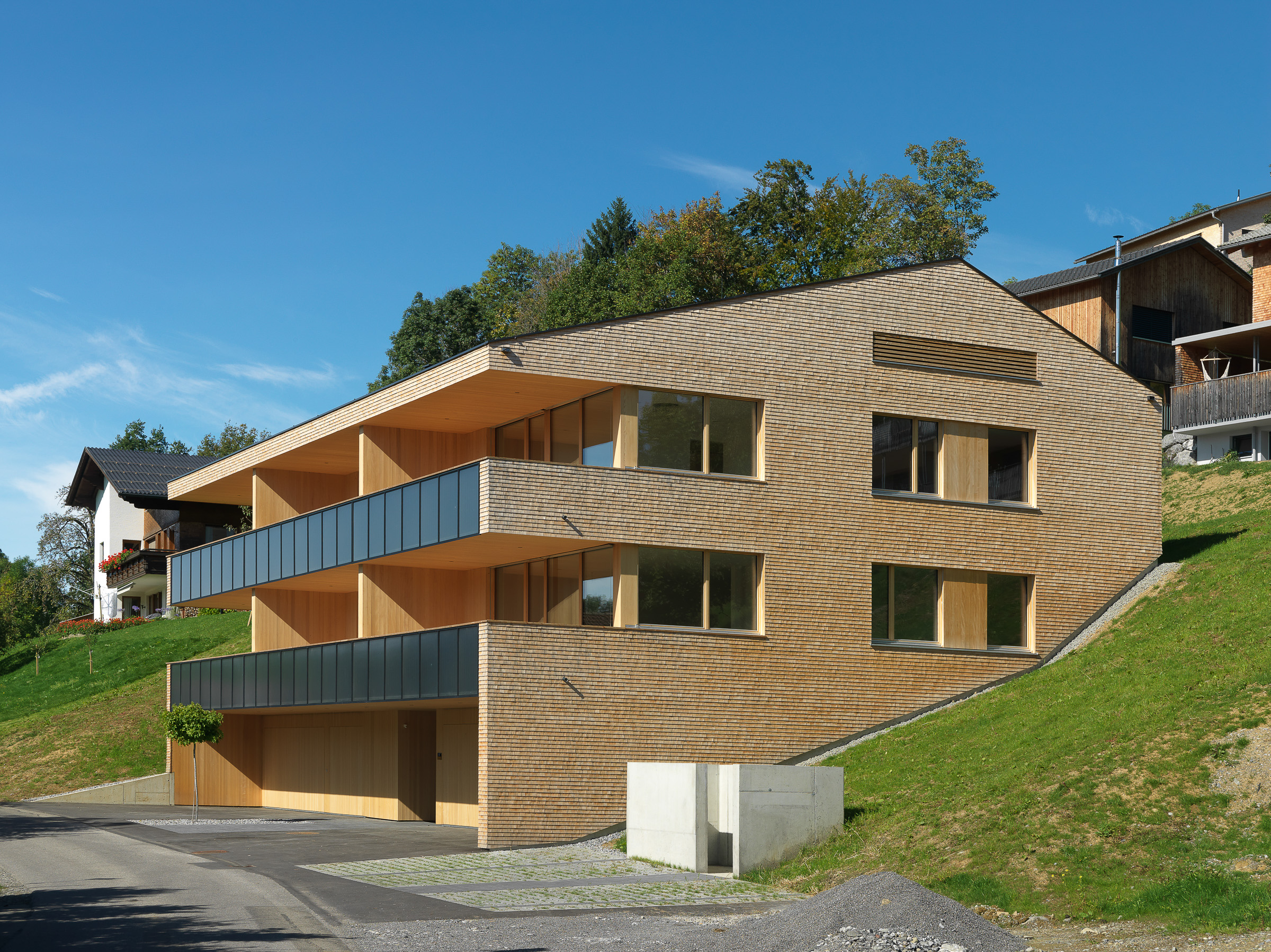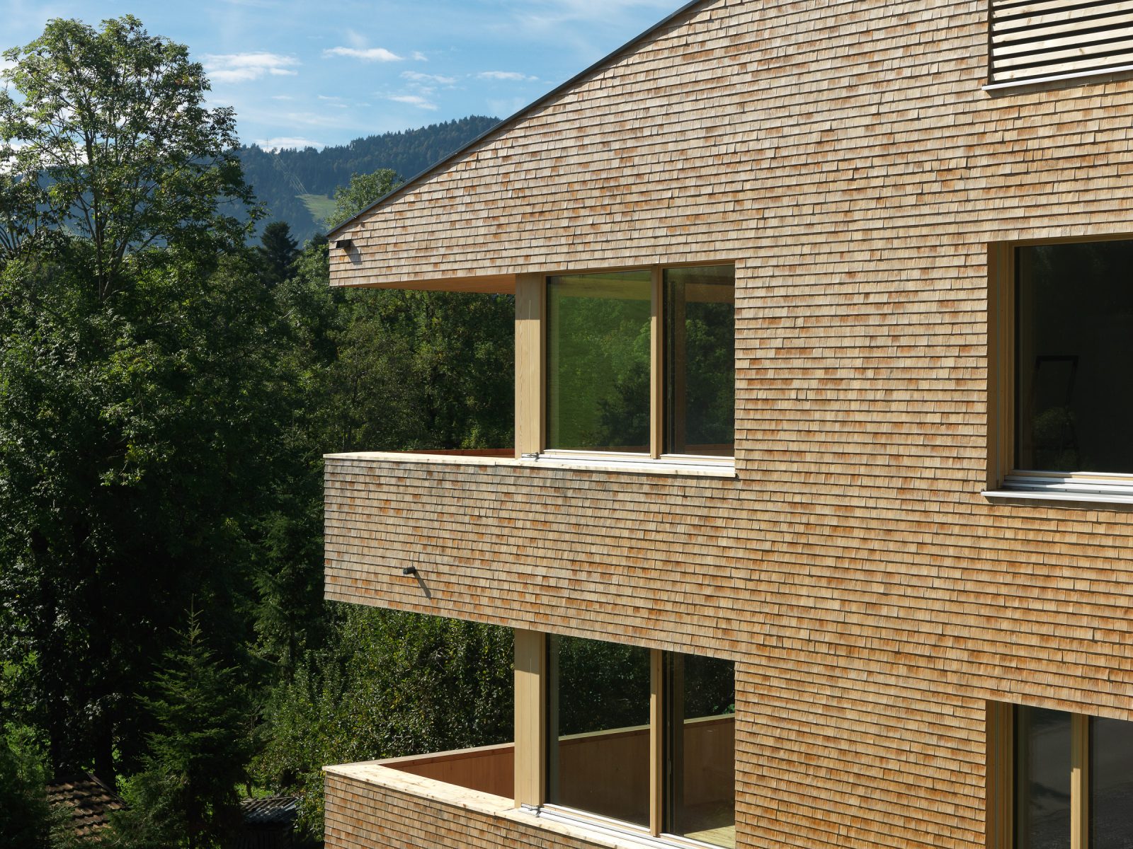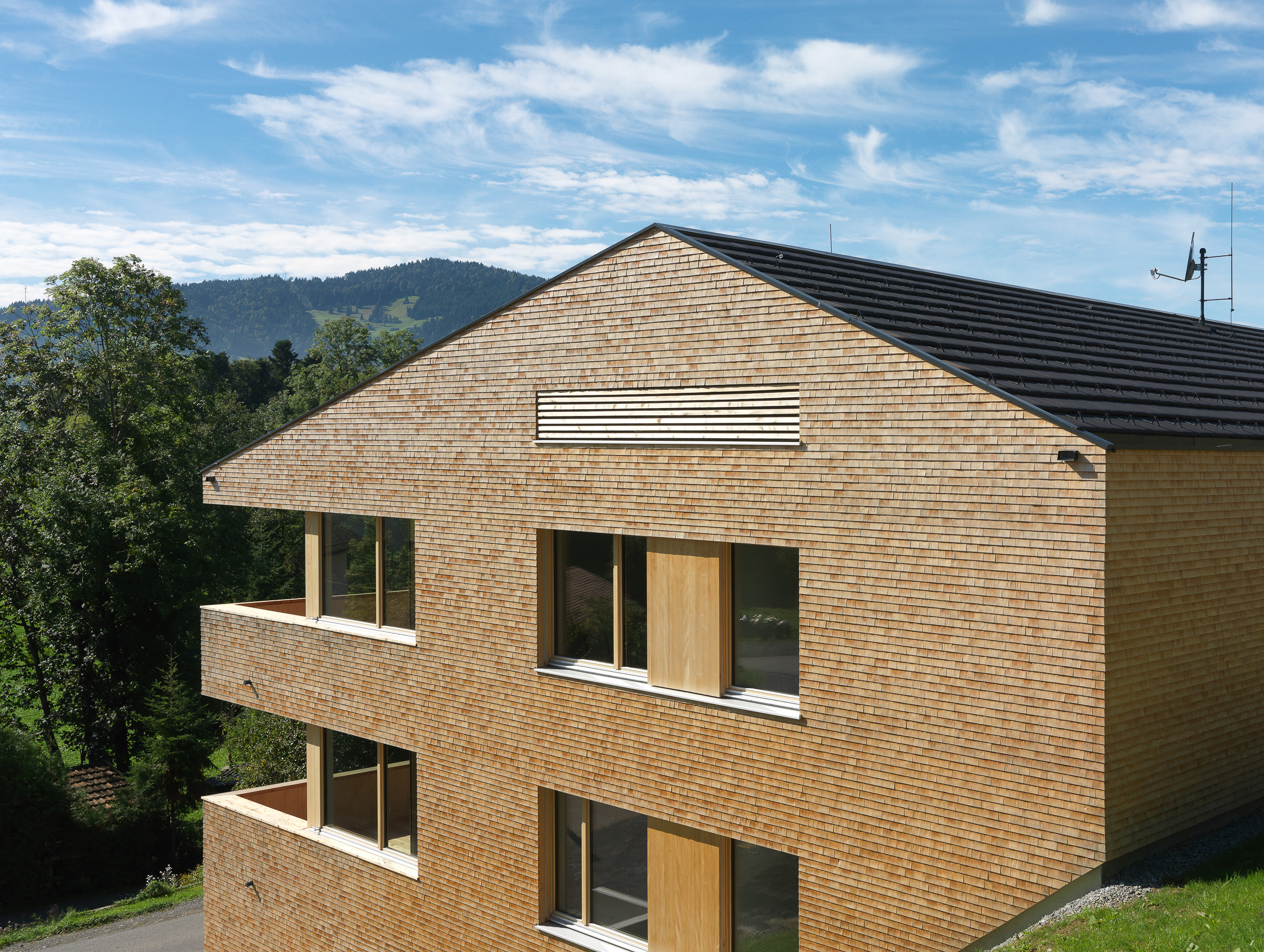 In den Details zeigt sich das Qualitätsbewusstsein des Bauträgers: Die Fassaden sind mit kleinteiligen Holzschindeln eingedeckt, die Lüftungsanlage ist im unbeheizten Dachboden untergebracht – die dafür notwendige Nachströmöffnung gliedert sich sowohl vom Material wie von den Dimensionen in die Fassade ein. Die Garagenfronten sind bündig eingebaut, das asymmetrische Dach erhält dank der innenliegenden Rinne eine elegante Erscheinung. Selbst die thermischen Kollektoren sind in die Brüstungen der Fassade integriert, während die Photovoltaik-Module flächenbündig in die Dachhaut integriert sind: zeitgemäße Technik ist in die Gestaltung integriert, statt als Fremdkörper am Volumen angehängt zu sein. Und auch dort, wo sonst meistens gespart wird, zeigt sich das Haus von einer herausragenden Qualität: Die Treppenhäuser erfüllen mit schwarz durchgefärbtem Beton und getäferten Wänden hohe Standards. Eine sinnvolle Investition in die Zukunft der Region, denn die neuen Bewohner von Langenegg bringen nicht nur die Sehnsucht nach dem Landleben mit – sie sind auch vertraut mit den Annehmlichkeiten des modernen Lebens.