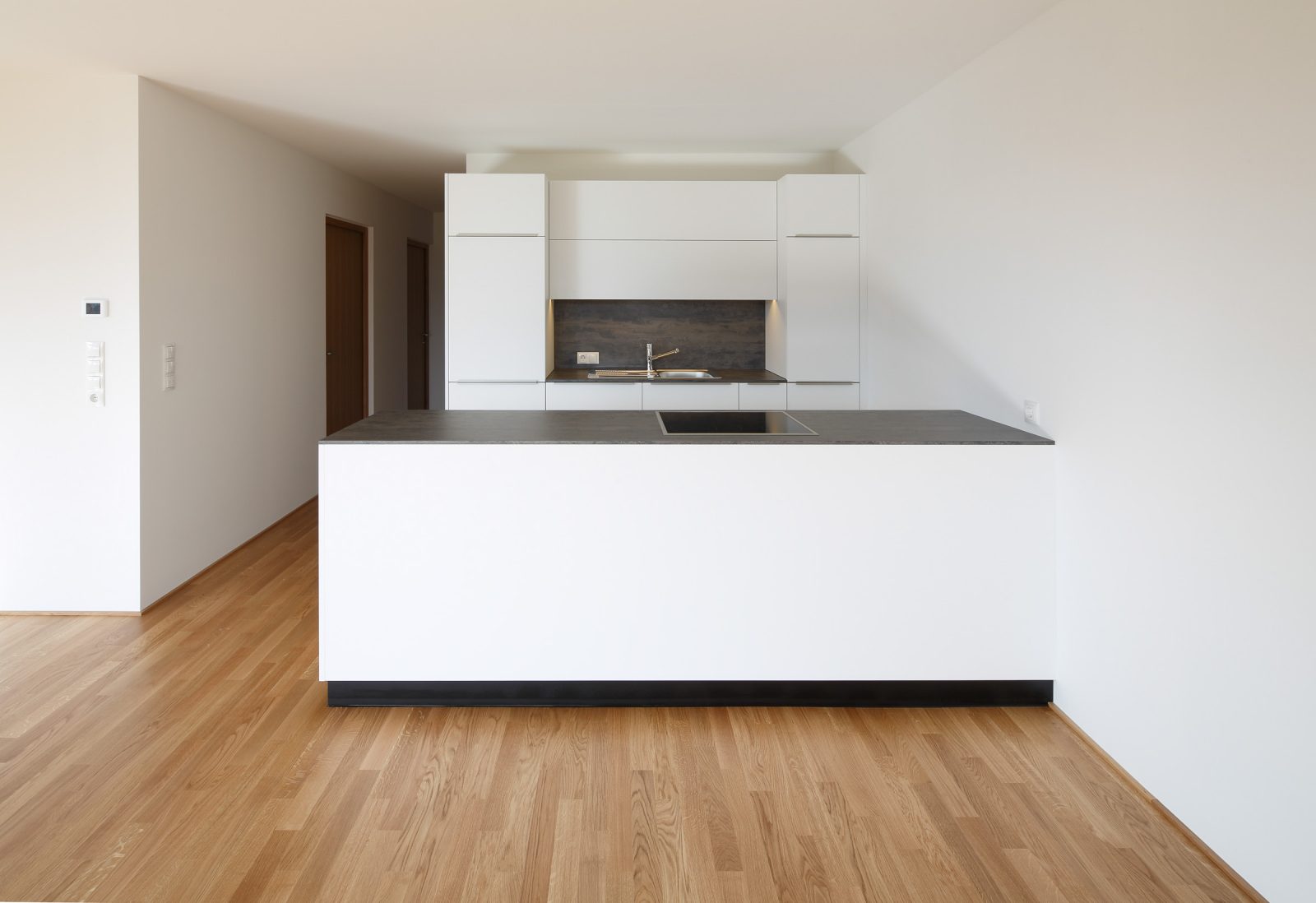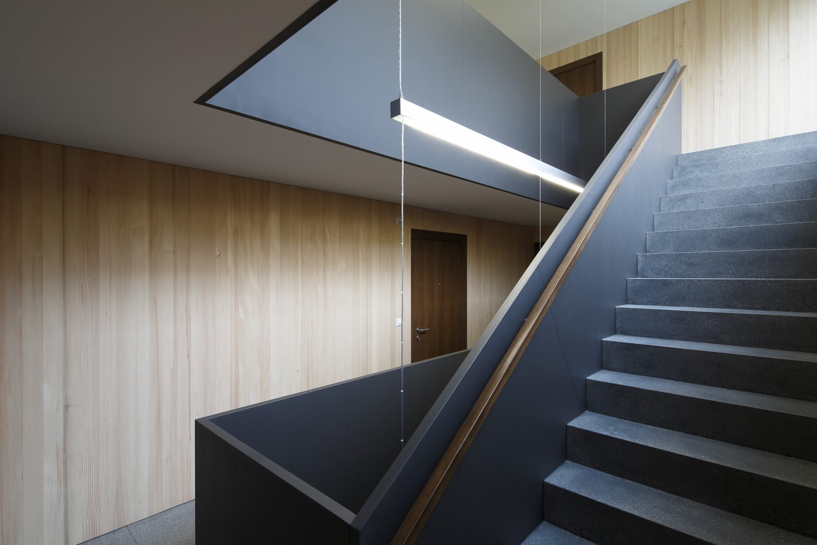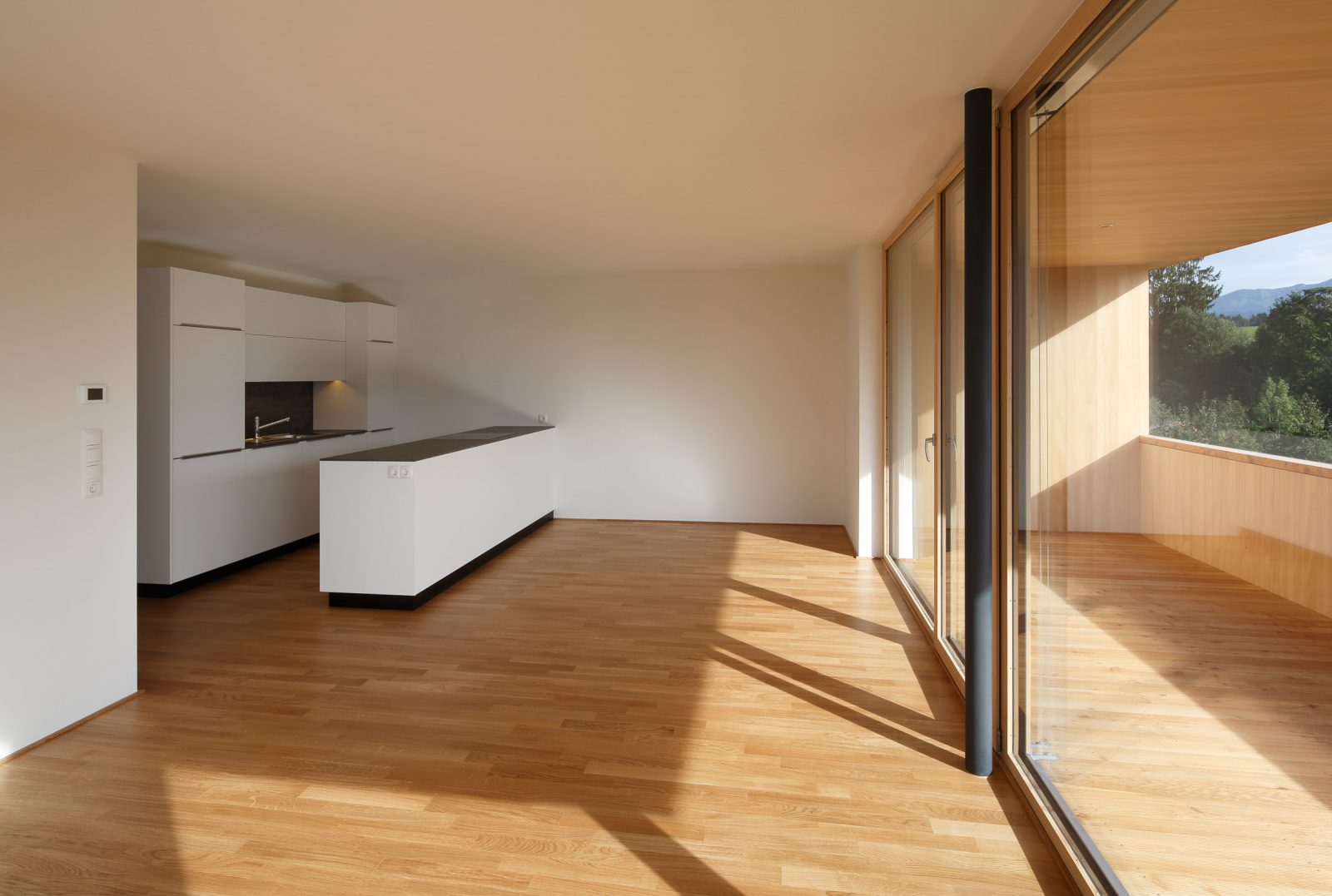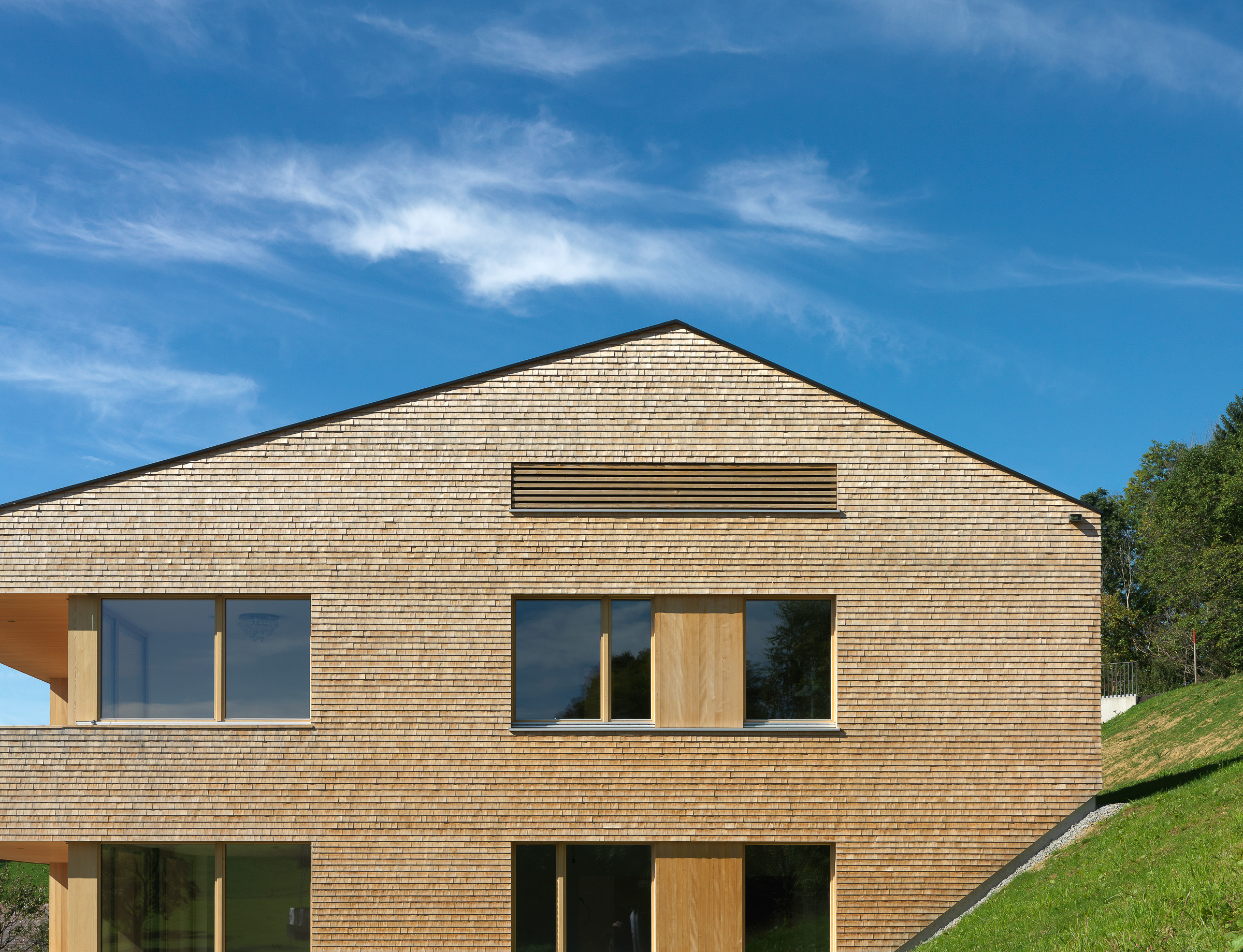 In den Details zeigt sich das Qualitätsbewusstsein des Bauträgers: Die Fassaden sind mit kleinteiligen Holzschindeln eingedeckt, die Lüftungsanlage ist im unbeheizten Dachboden untergebracht – die dafür notwendige Nachströmöffnung gliedert sich sowohl vom Material wie von den Dimensionen in die Fassade ein. Die Garagenfronten sind bündig eingebaut, das asymmetrische Dach erhält dank der innenliegenden Rinne eine elegante Erscheinung. Selbst die thermischen Kollektoren sind in die Brüstungen der Fassade integriert, während die Photovoltaik-Module flächenbündig in die Dachhaut integriert sind: zeitgemäße Technik ist in die Gestaltung integriert, statt als Fremdkörper am Volumen angehängt zu sein. Und auch dort, wo sonst meistens gespart wird, zeigt sich das Haus von einer herausragenden Qualität: Die Treppenhäuser erfüllen mit schwarz durchgefärbtem Beton und getäferten Wänden hohe Standards. Eine sinnvolle Investition in die Zukunft der Region, denn die neuen Bewohner von Langenegg bringen nicht nur die Sehnsucht nach dem Landleben mit – sie sind auch vertraut mit den Annehmlichkeiten des modernen Lebens.