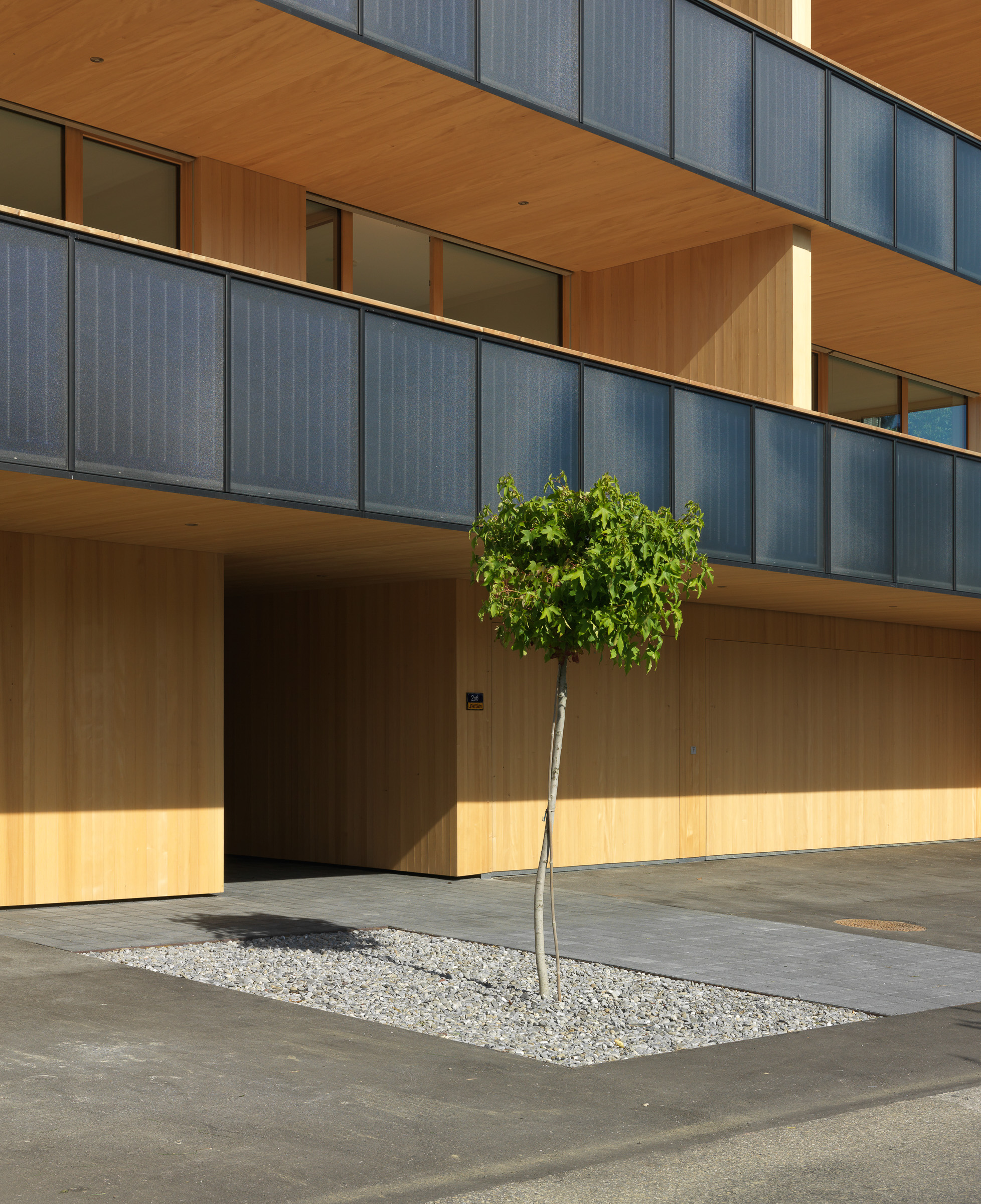 Die Konstruktion erfolgte in Mischbauweise: die Decken aus Stahlbeton stehen auf Metallstützen, während die Fassaden aus hochgedämmten Holzelementen erstellt wurden. Die Mischbauweise ist effizient und sie erlaubt es, die Stärken der einzelnen Materialien zu nutzen. Die Wohnungen sind effizient als Dreispänner organisiert. Zwischen den beiden Dreizimmerwohnungen an den Enden liegt eine einseitig orientierte Zweizimmerwohnung. Innerhalb der Wohnungen steht ebenfalls Effizienz an oberster Stelle. Durchgehende, großzügige Balkone entschädigen für die Enge der Zimmer – an diesem Ort möchte man seine Zeit ohnehin lieber draußen verbringen.