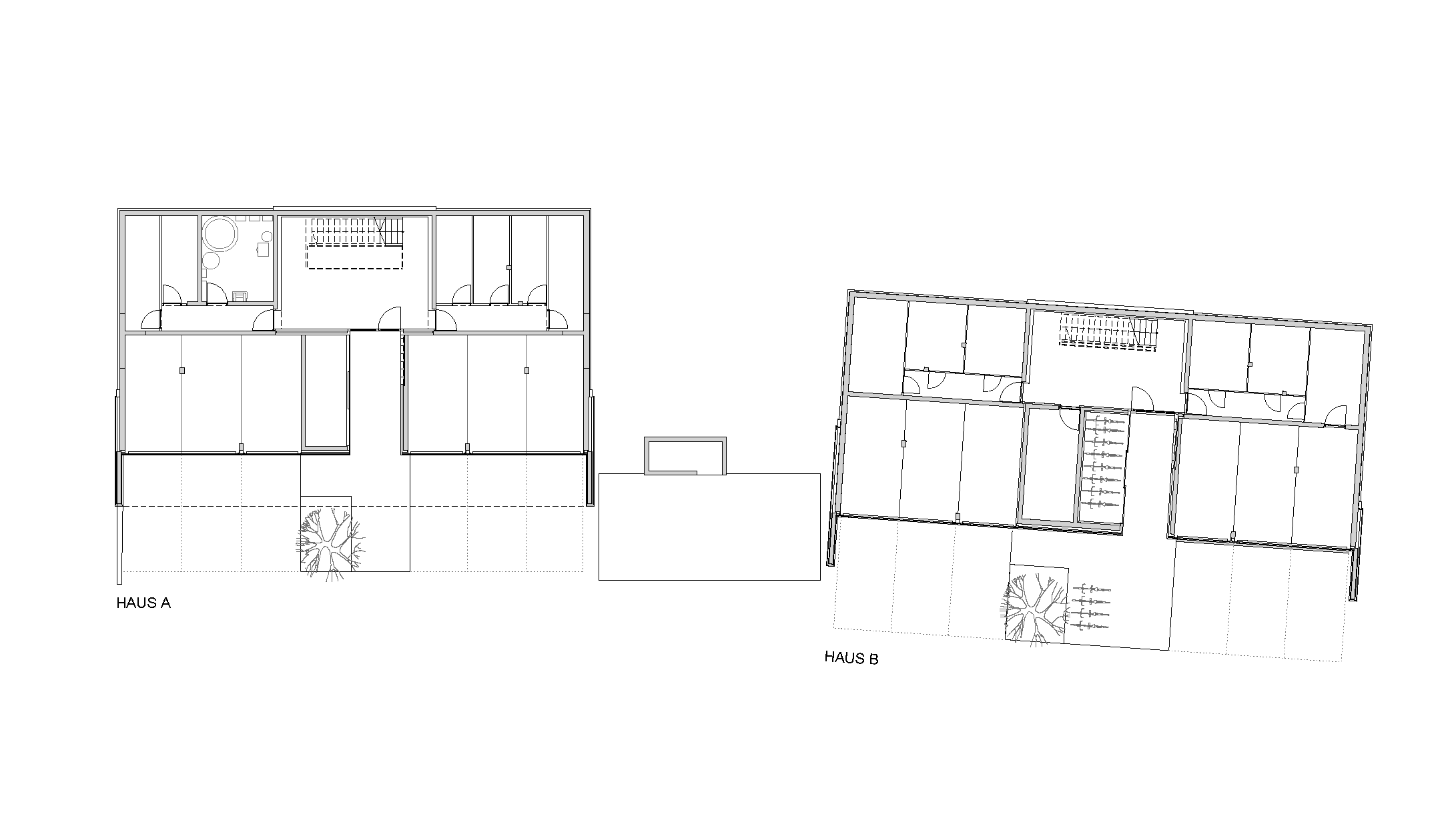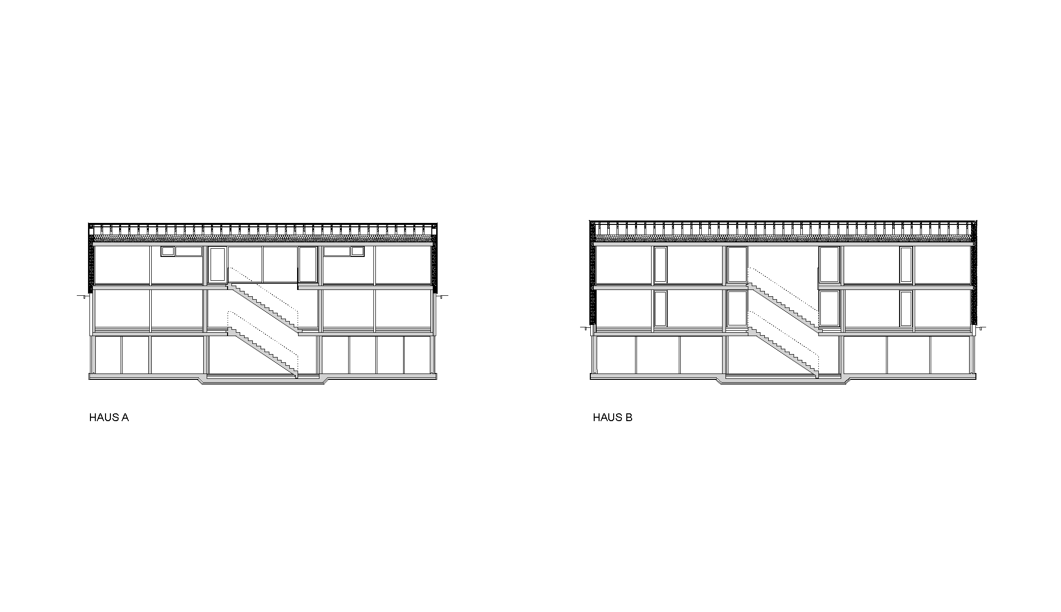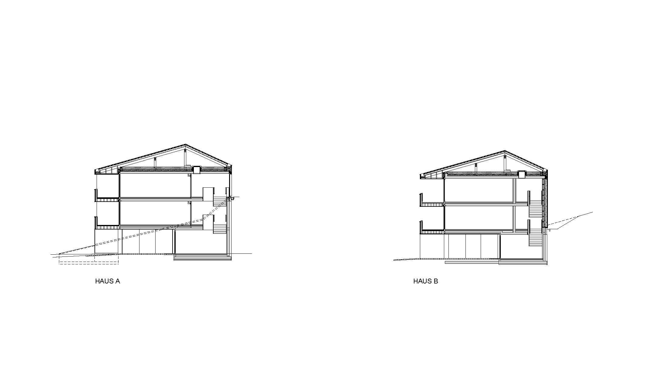 Das steile Grundstück ist lang und schmal. Es war anspruchsvoll, die beiden Häuser auf dieser Parzelle einzupassen: Die einzige Möglichkeit lag darin, die zwei Volumen parallel zum Hang zu stellen. Im Schnitt ist ersichtlich, wie tief der Sockel aus Beton in den Hang hineinreicht; das Haus steht fast bis zum 2. Obergeschoss in der Erde. Der Sockel beherbergt die Erschließung, Kellerräume und die Garagen für die Fahrzeuge. Um dennoch Licht in das rückwärtige Treppenhaus zu holen, ist sein Abschluss im 2. OG verglast.