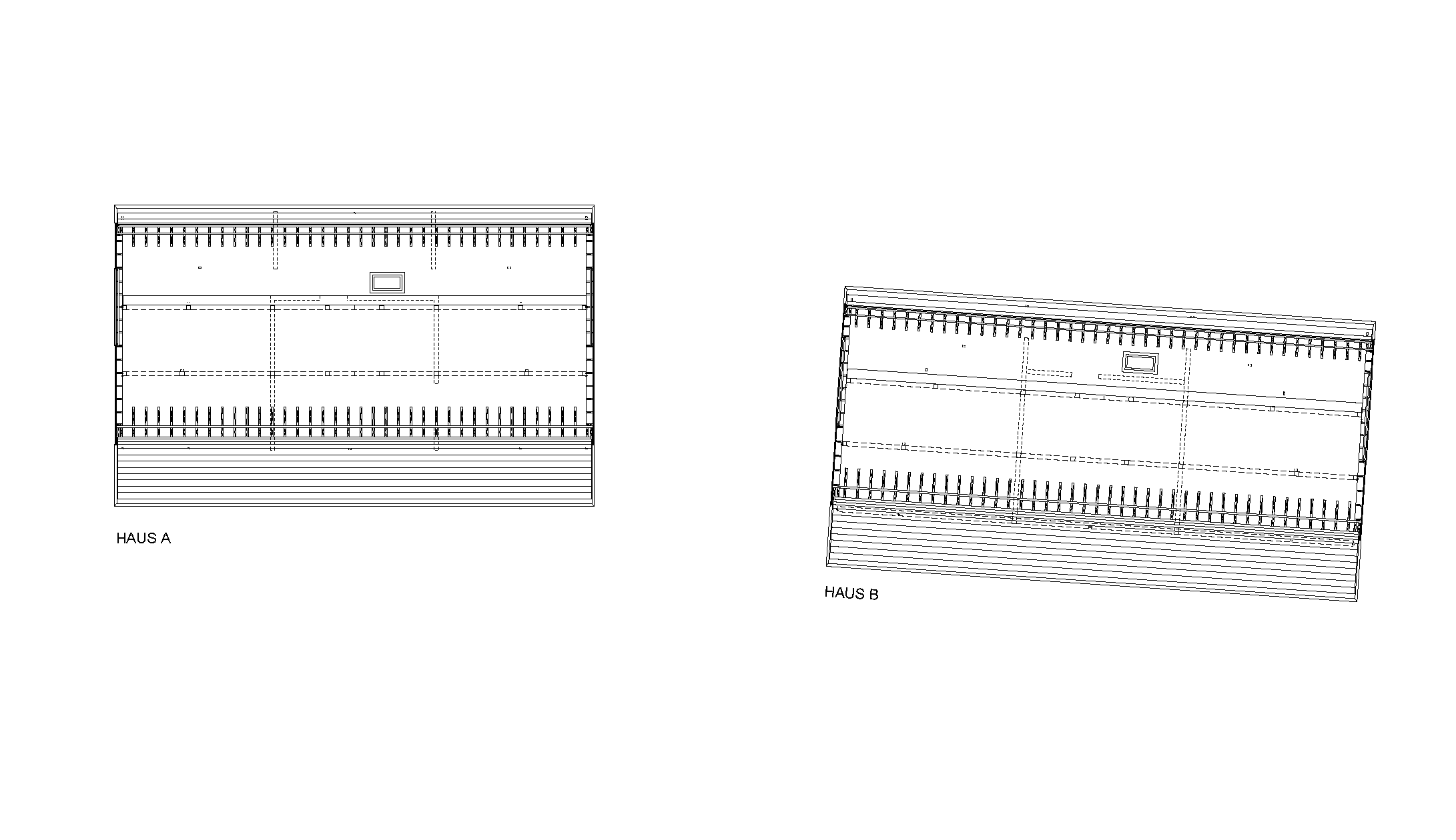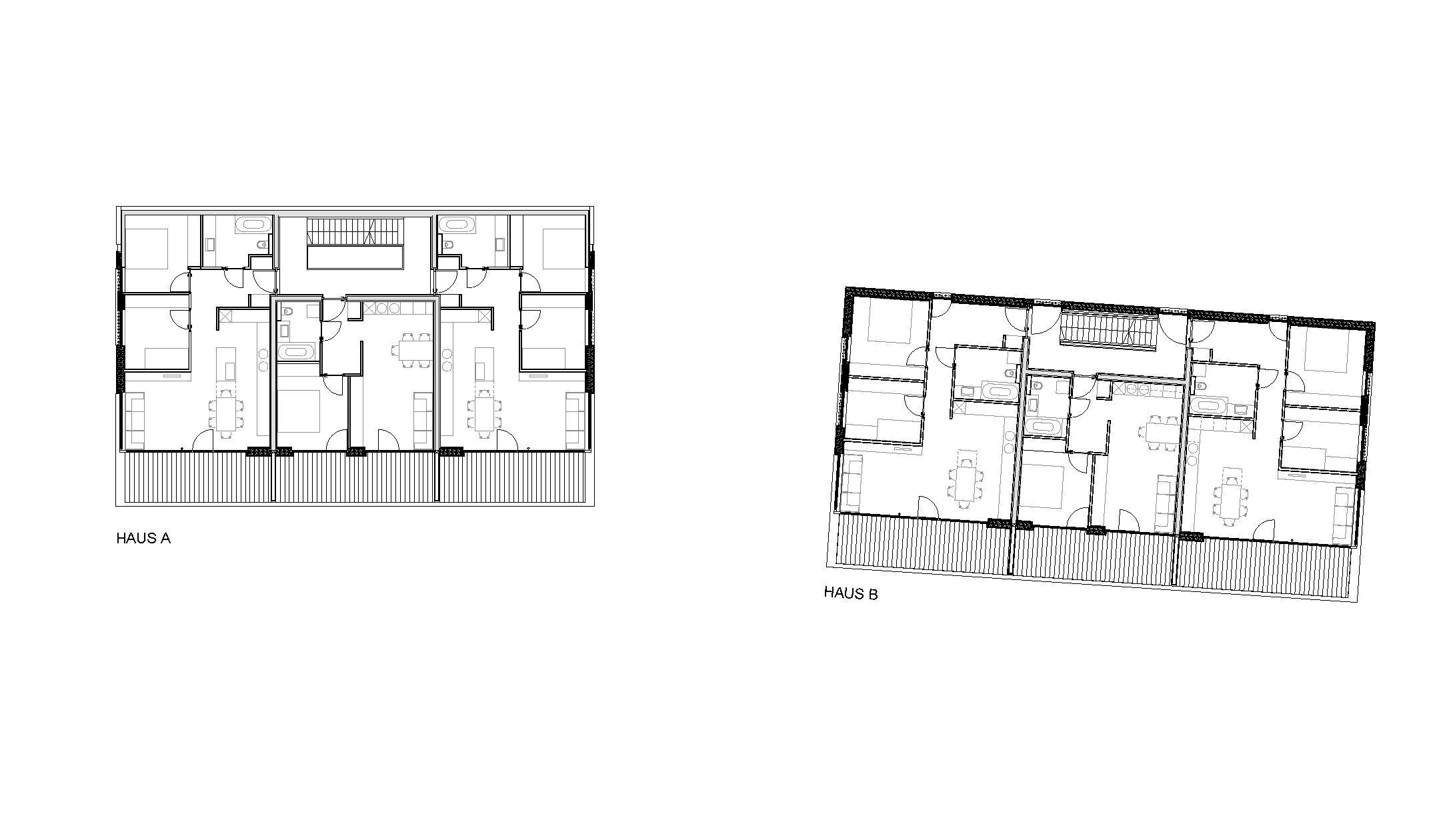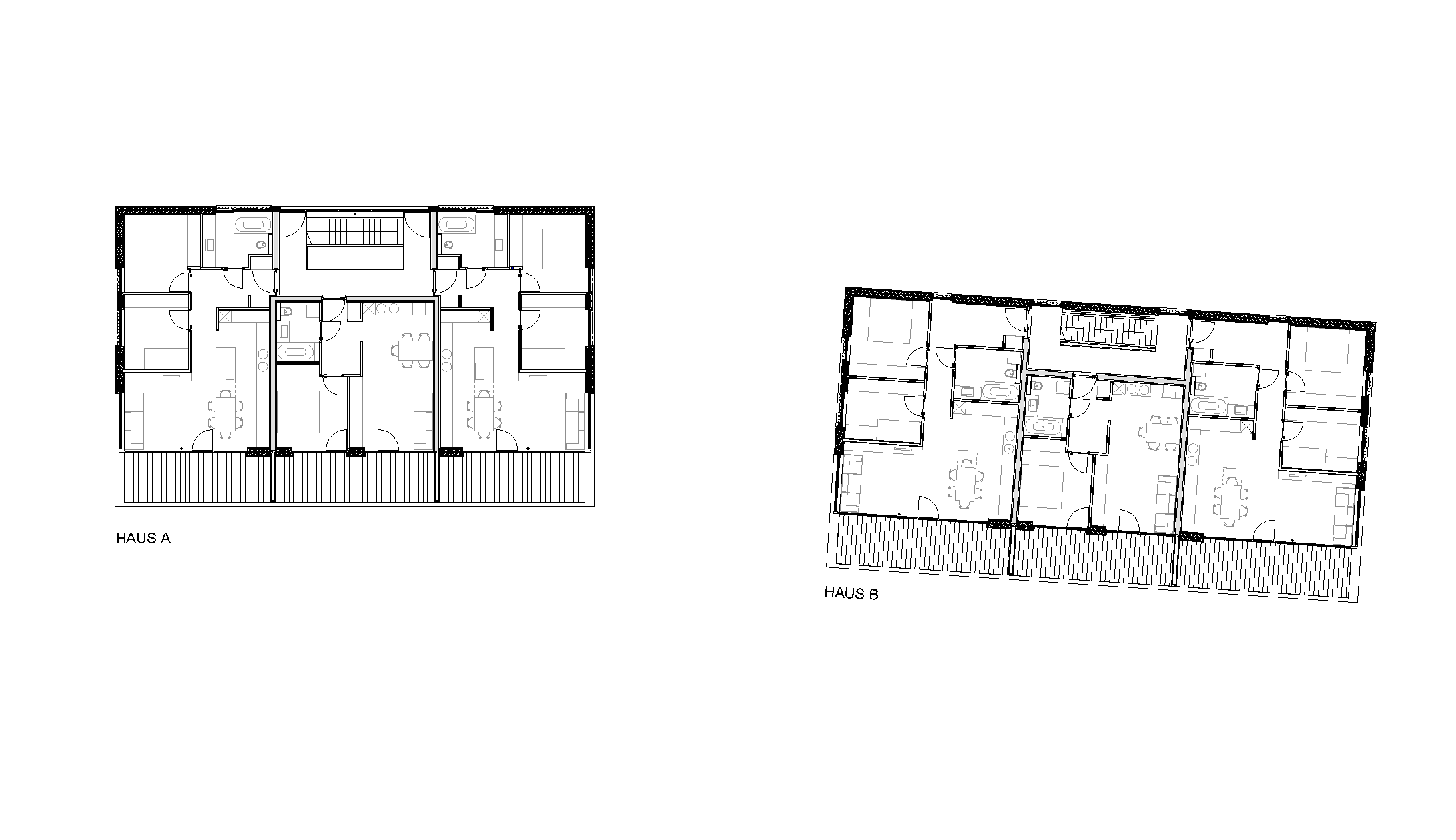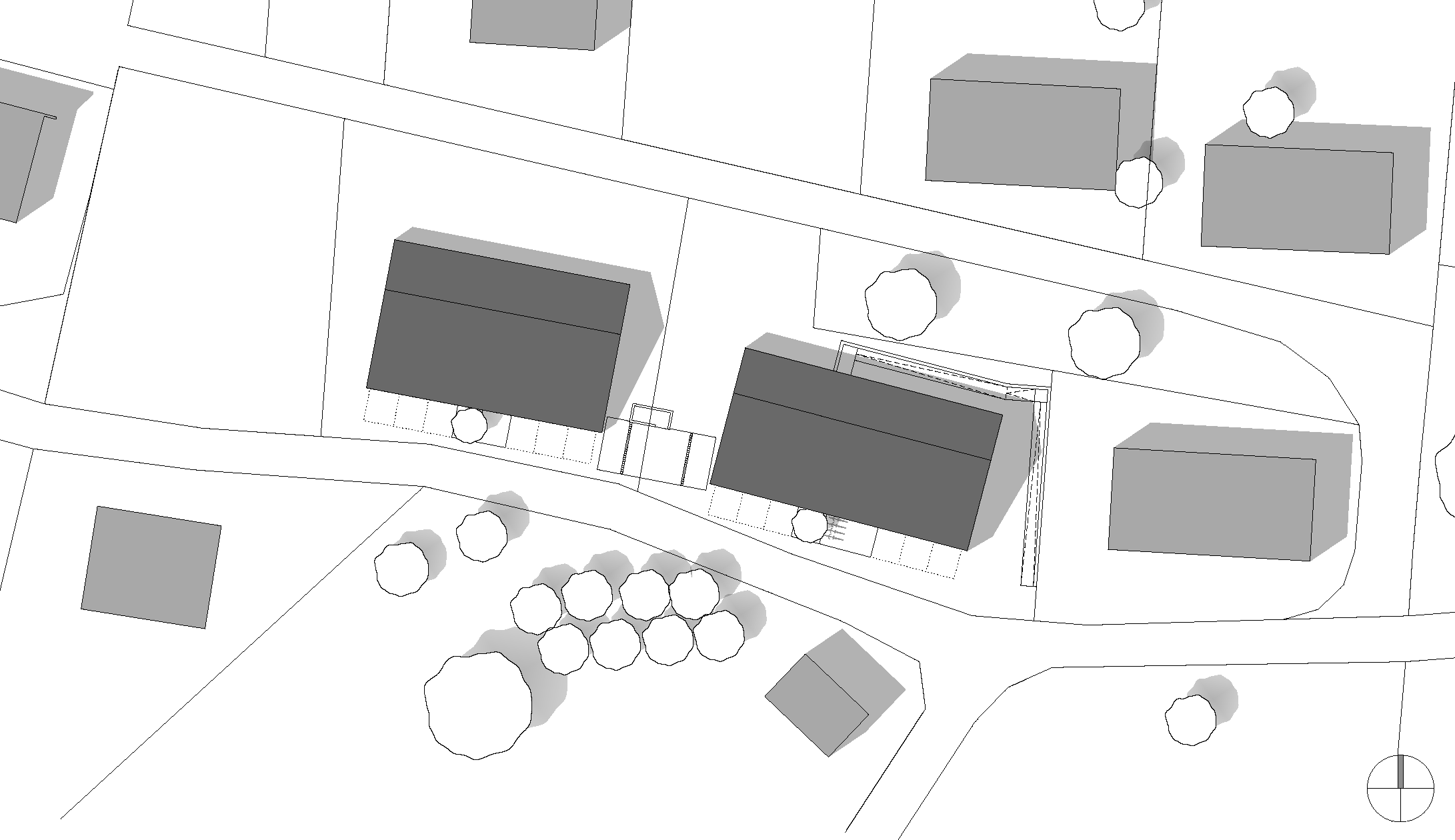 Das steile Grundstück ist lang und schmal. Es war anspruchsvoll, die beiden Häuser auf dieser Parzelle einzupassen: Die einzige Möglichkeit lag darin, die zwei Volumen parallel zum Hang zu stellen. Im Schnitt ist ersichtlich, wie tief der Sockel aus Beton in den Hang hineinreicht; das Haus steht fast bis zum 2. Obergeschoss in der Erde. Der Sockel beherbergt die Erschließung, Kellerräume und die Garagen für die Fahrzeuge. Um dennoch Licht in das rückwärtige Treppenhaus zu holen, ist sein Abschluss im 2. OG verglast.