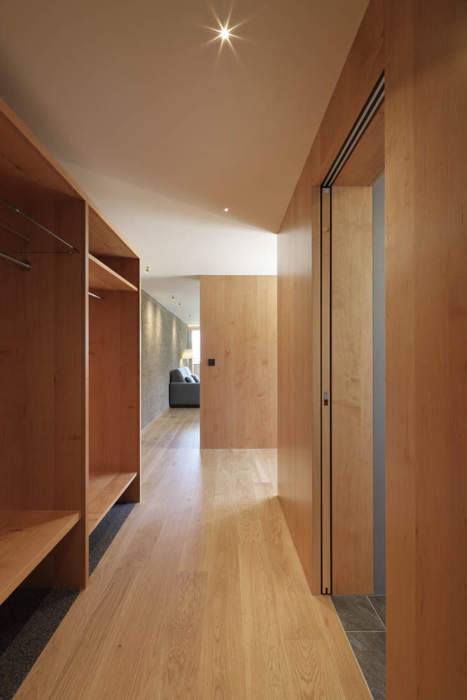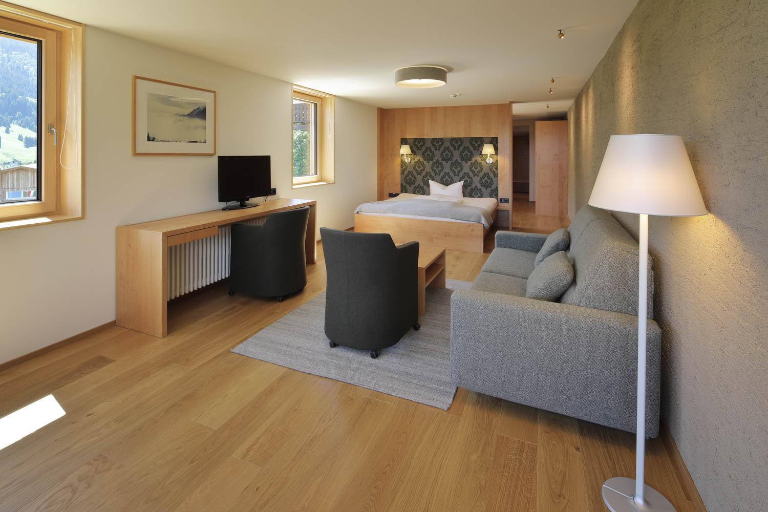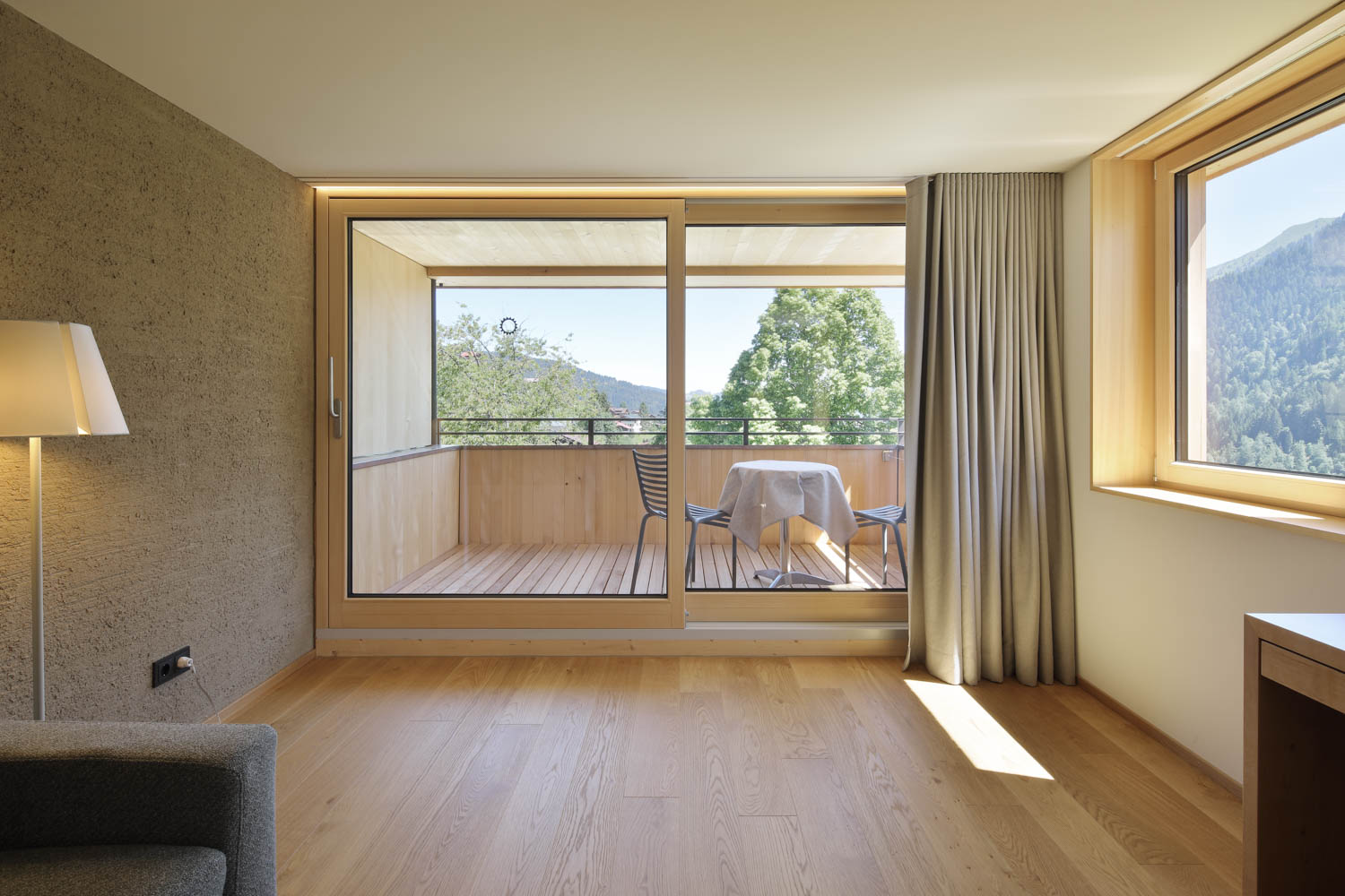 Bei der Gestaltung der Innenräume legte die Bauherrenfamilie ebenfalls besonderen Wert auf eine handwerkliche Ausführung der Arbeiten und die Wahl möglichst naturbelassener, regionaler Materialien. Die Zimmer wurden mit Lehmputzen, Täfer und Lattendecken aus Weißtanne sowie Eichen- und Schieferböden ausgekleidet und mit Möbeln aus Vollholz, Naturleder, Filz und Bio-Baumwolle eingerichtet.