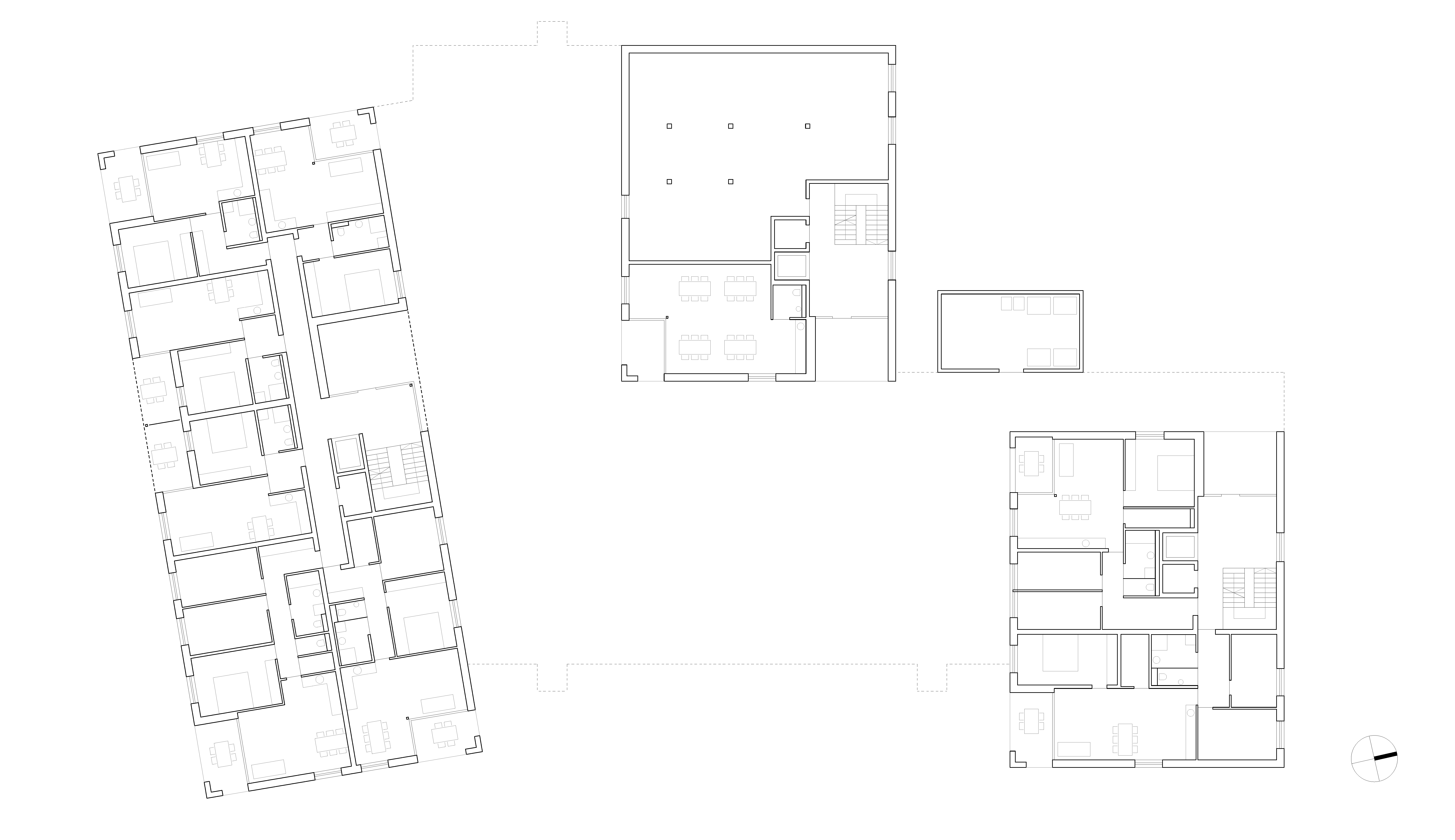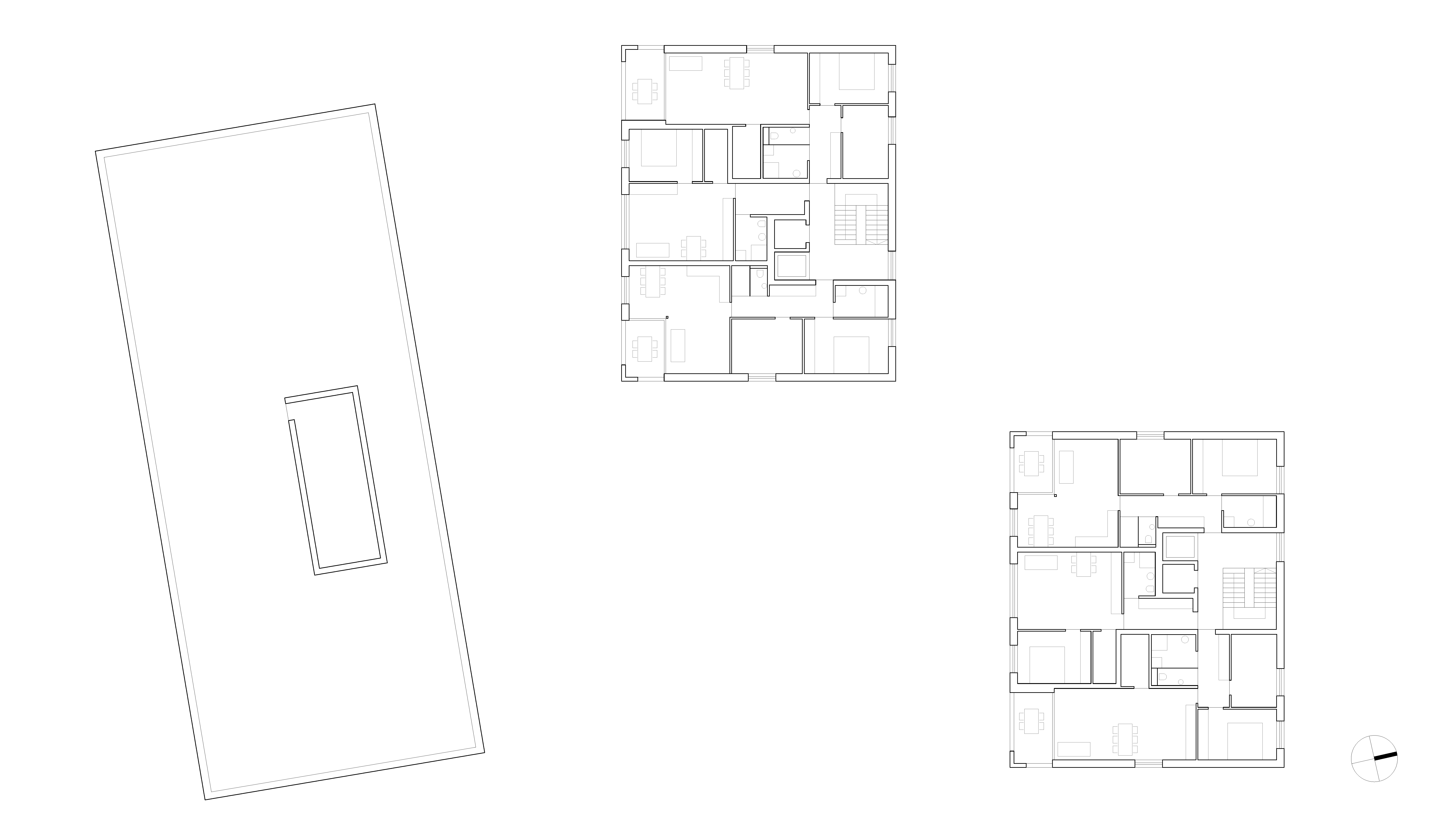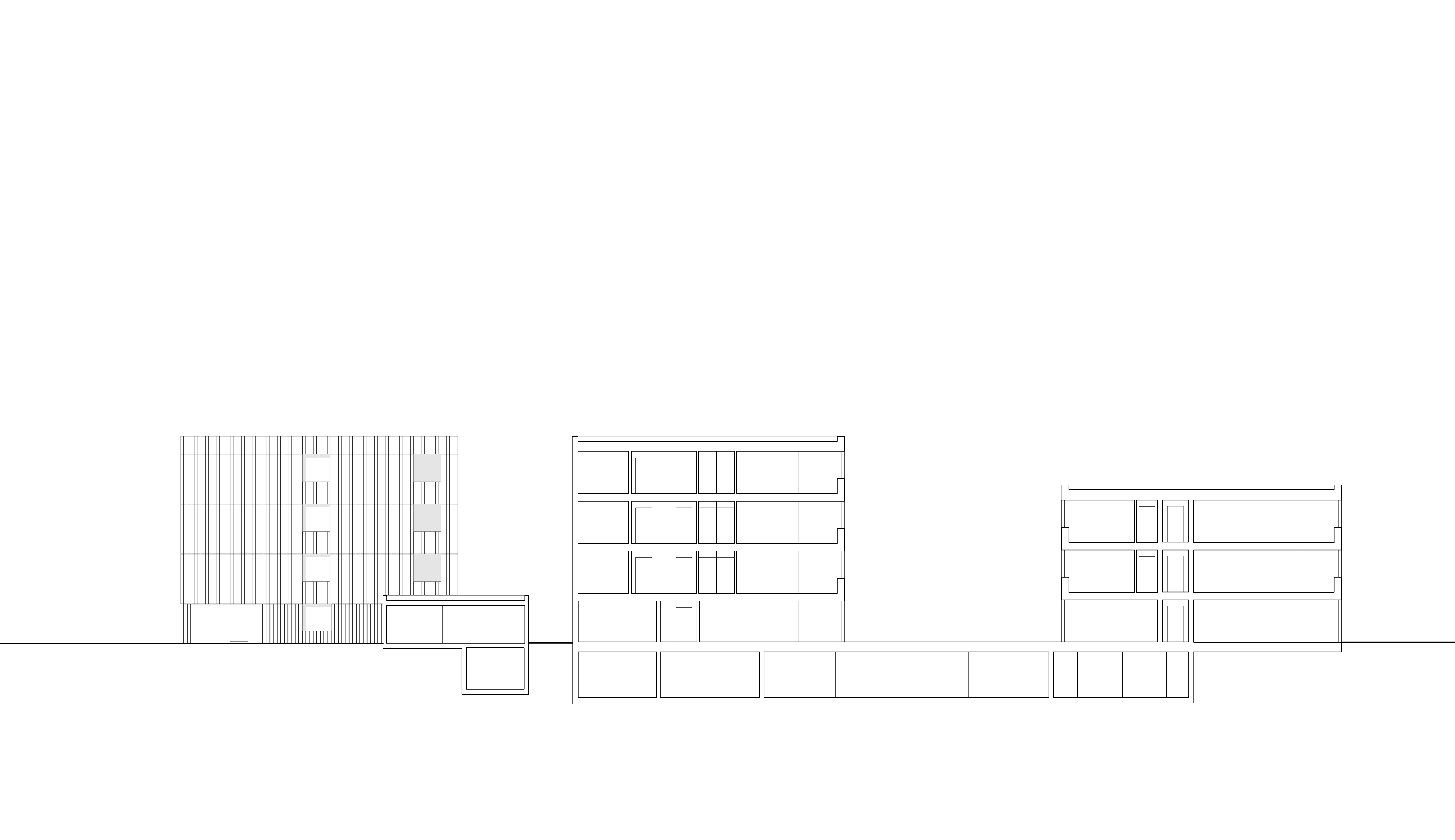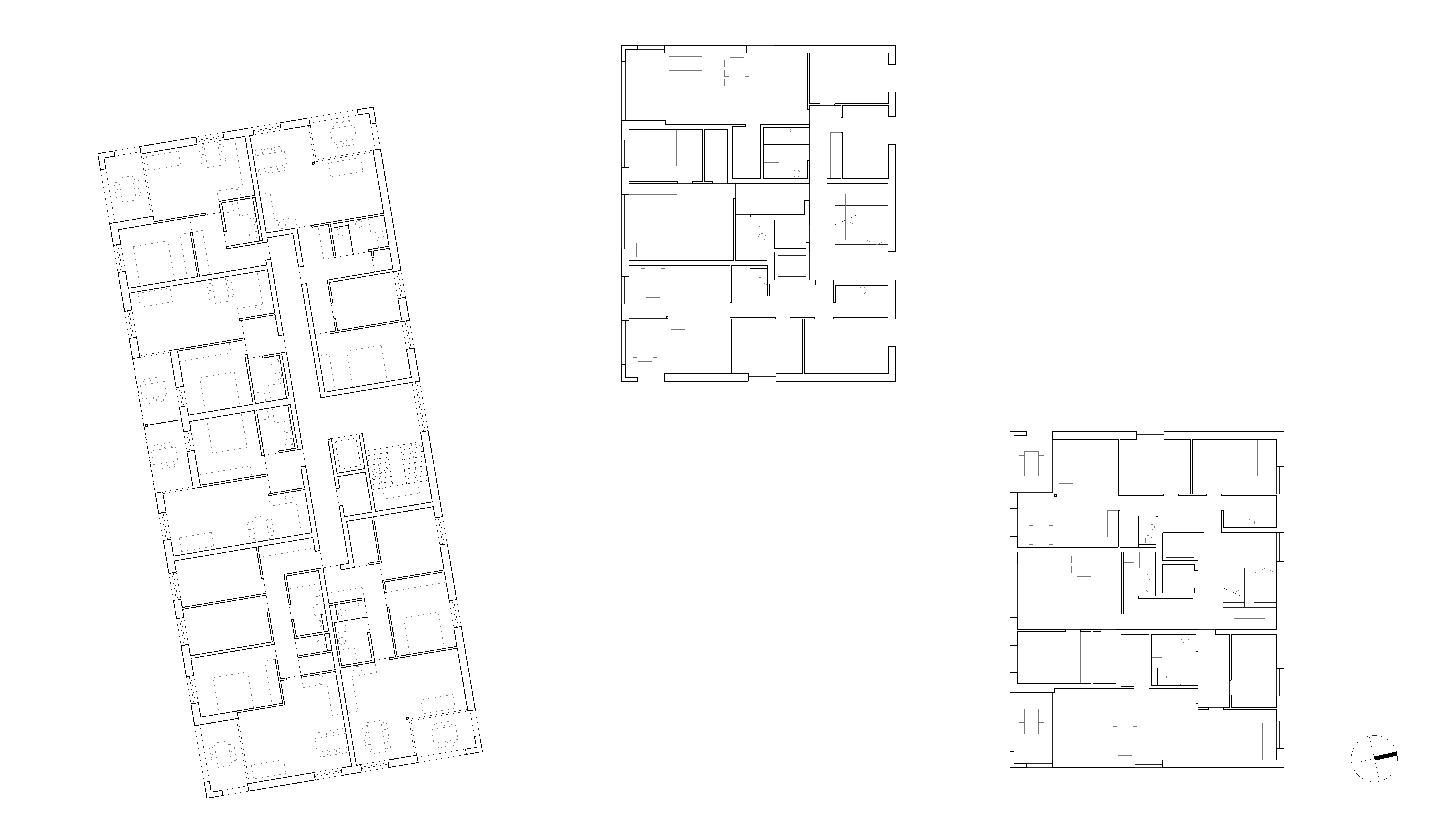 Drei kompakt konzipierte Volumen fügen sich als kleines Ensemble in die nachbarschaftliche Bebauungsstruktur zwischen der beschaulichen Neubaugasse und der Hauptverkehrsachse der Harderstraße. Die Gebäude wurden hinsichtlich der Besonnung wie auch der Erschließung und Durchwegung des Areals mit Bedacht gesetzt, um qualitativ hochwertige, verkehrsfreie Außenräume zu schaffen.