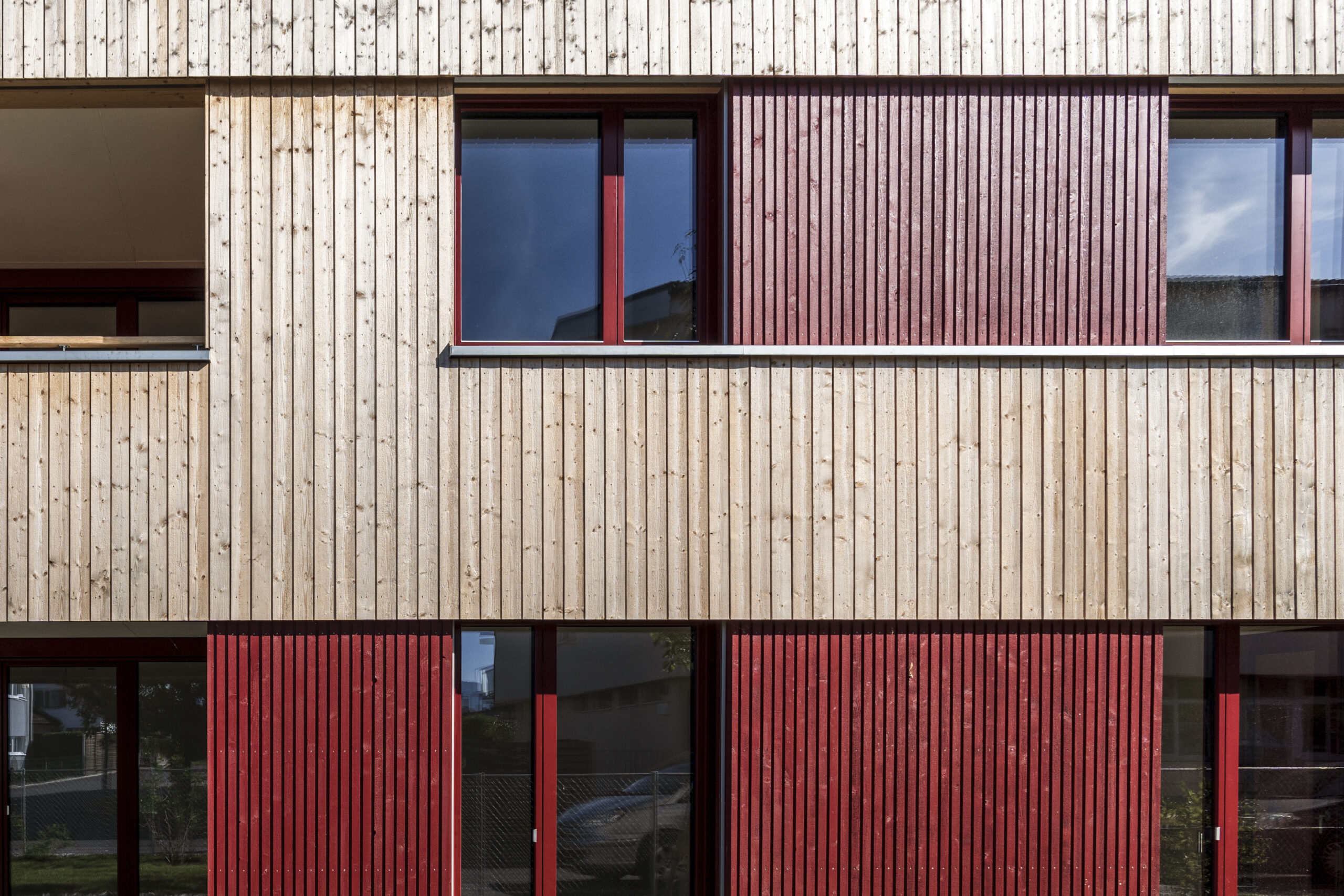 Die Tragstruktur aus Stahlbeton wird von vorgefertigten Holzrahmenelementen umhüllt, die durch Stahlstützen statisch verstärkt und mit fein gearbeiteten Fichtenbrettern verschalt sind. Die Ausführung in Niedrigenergiebauweise mit Solaranlage und Grundwasser-Wärmepumpe garantiert nicht nur die Behaglichkeit der Bewohner, sondern auch die Zukunftsfähigkeit für nachfolgende Generationen.