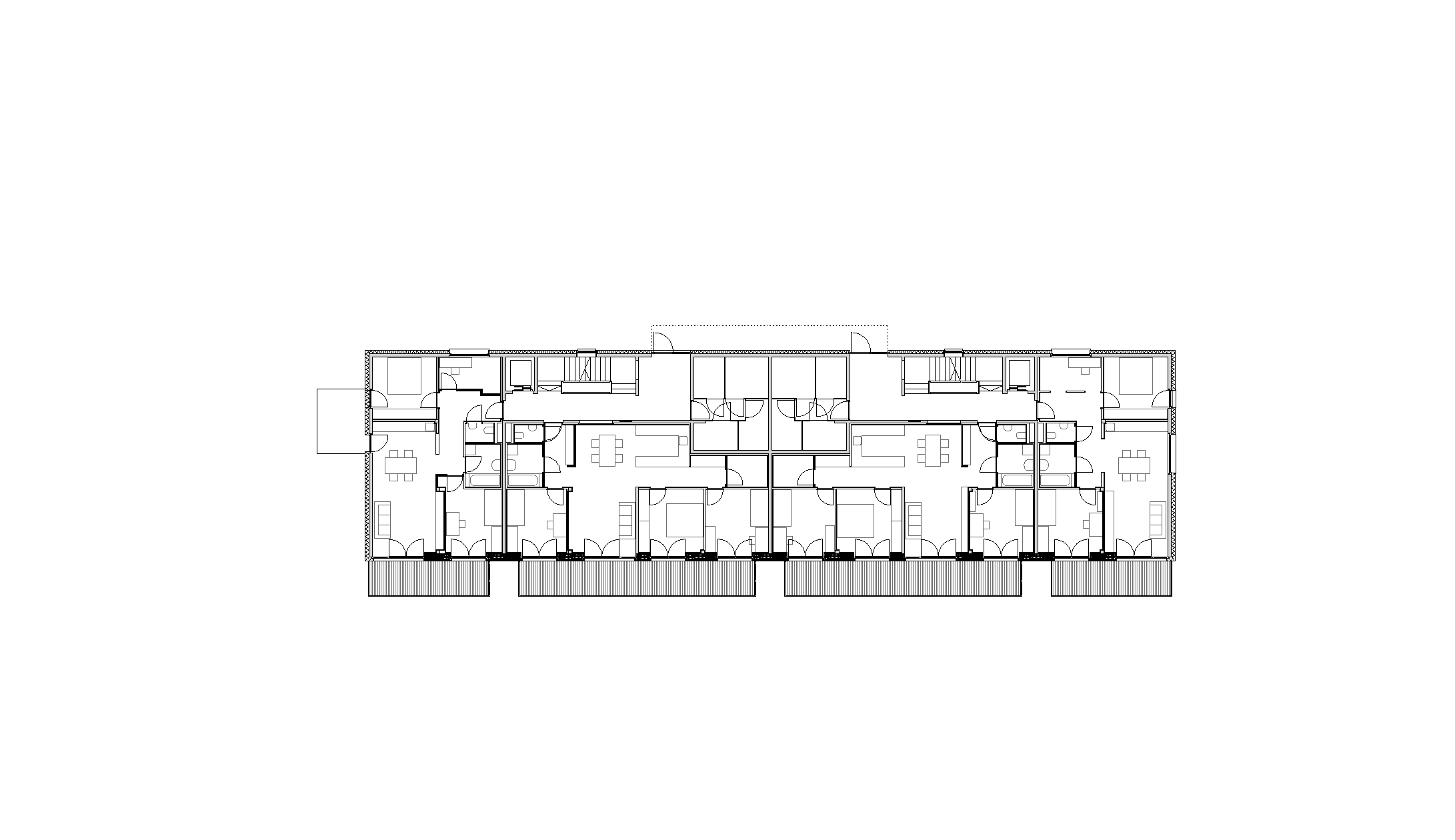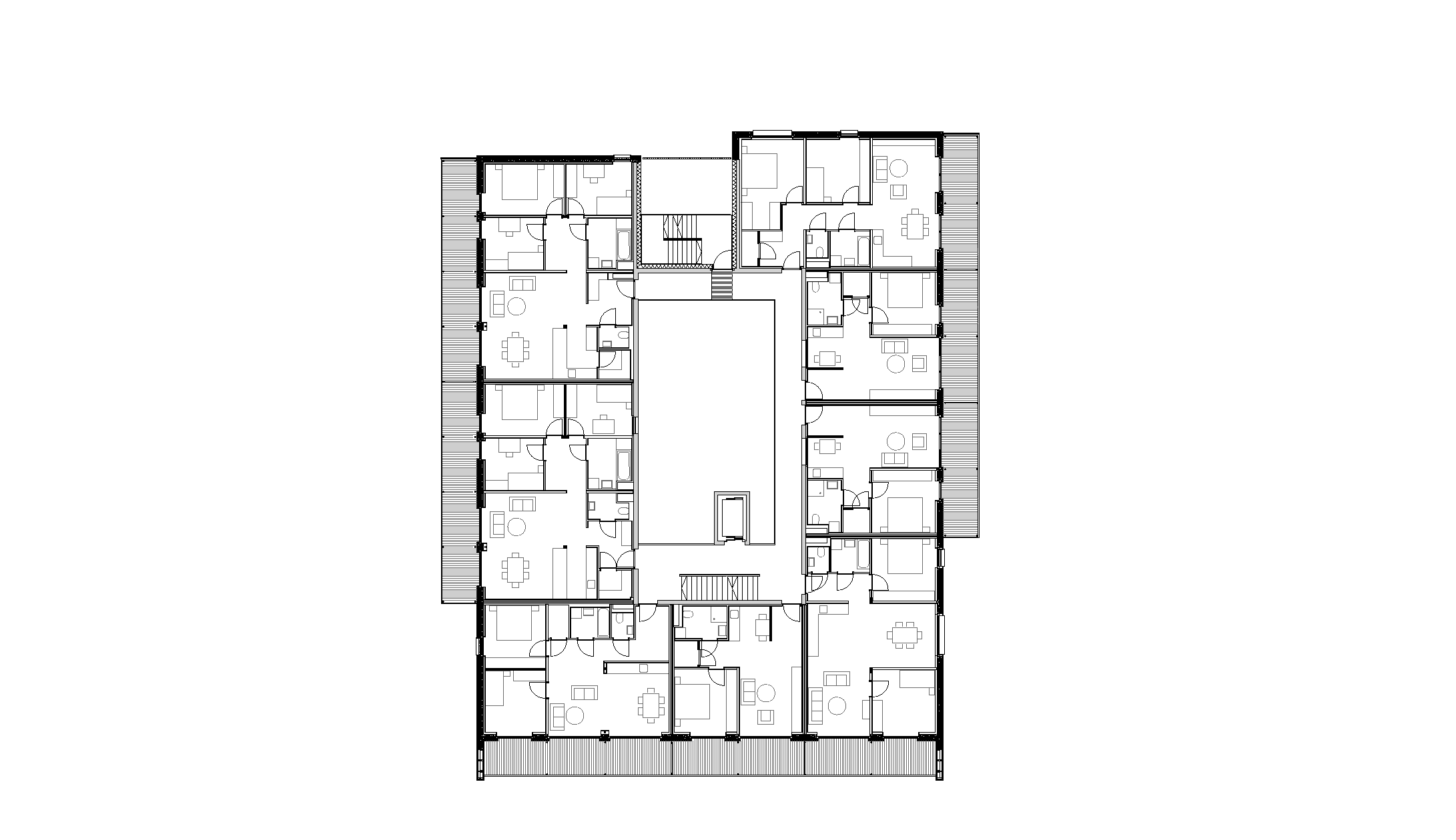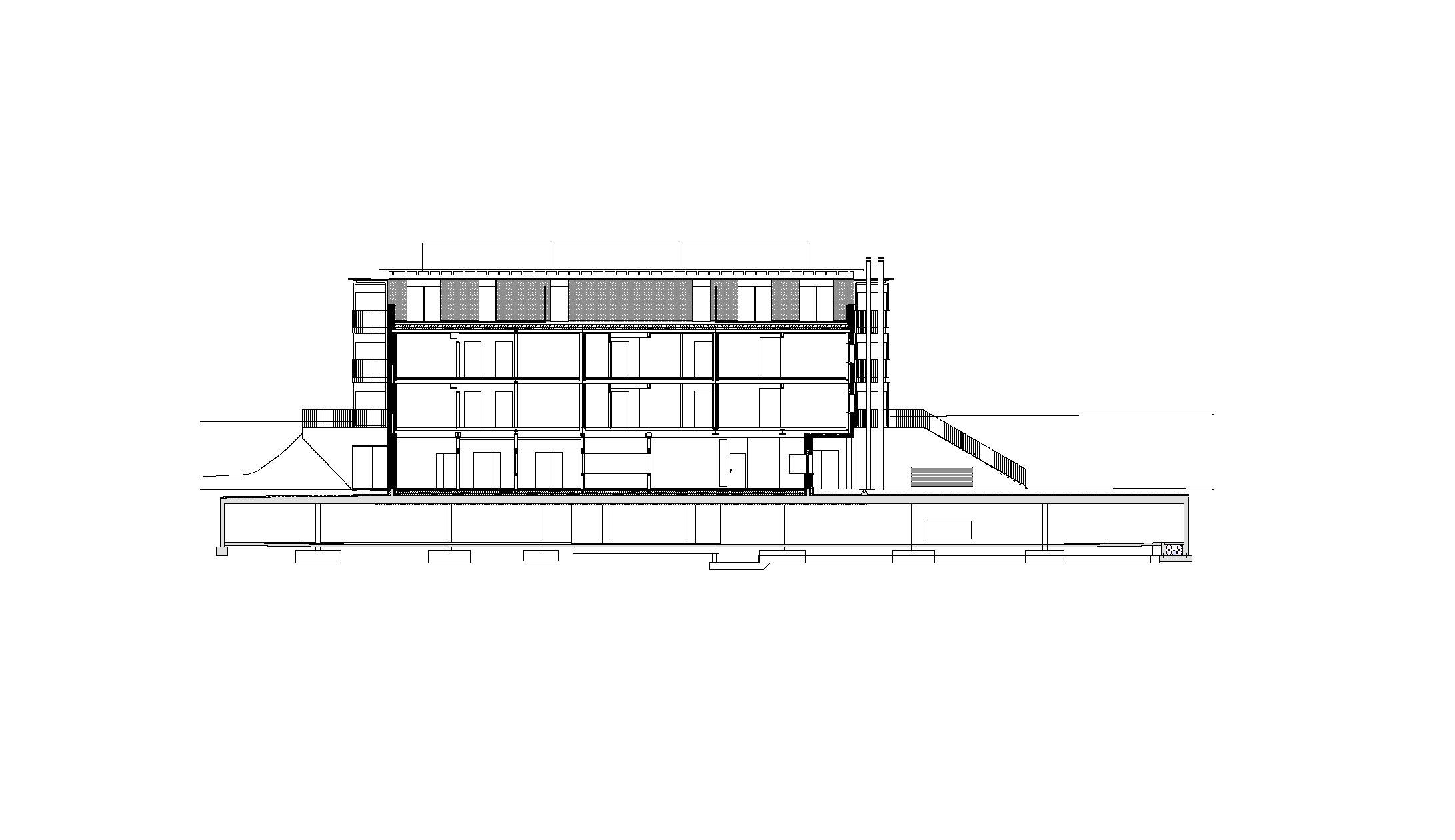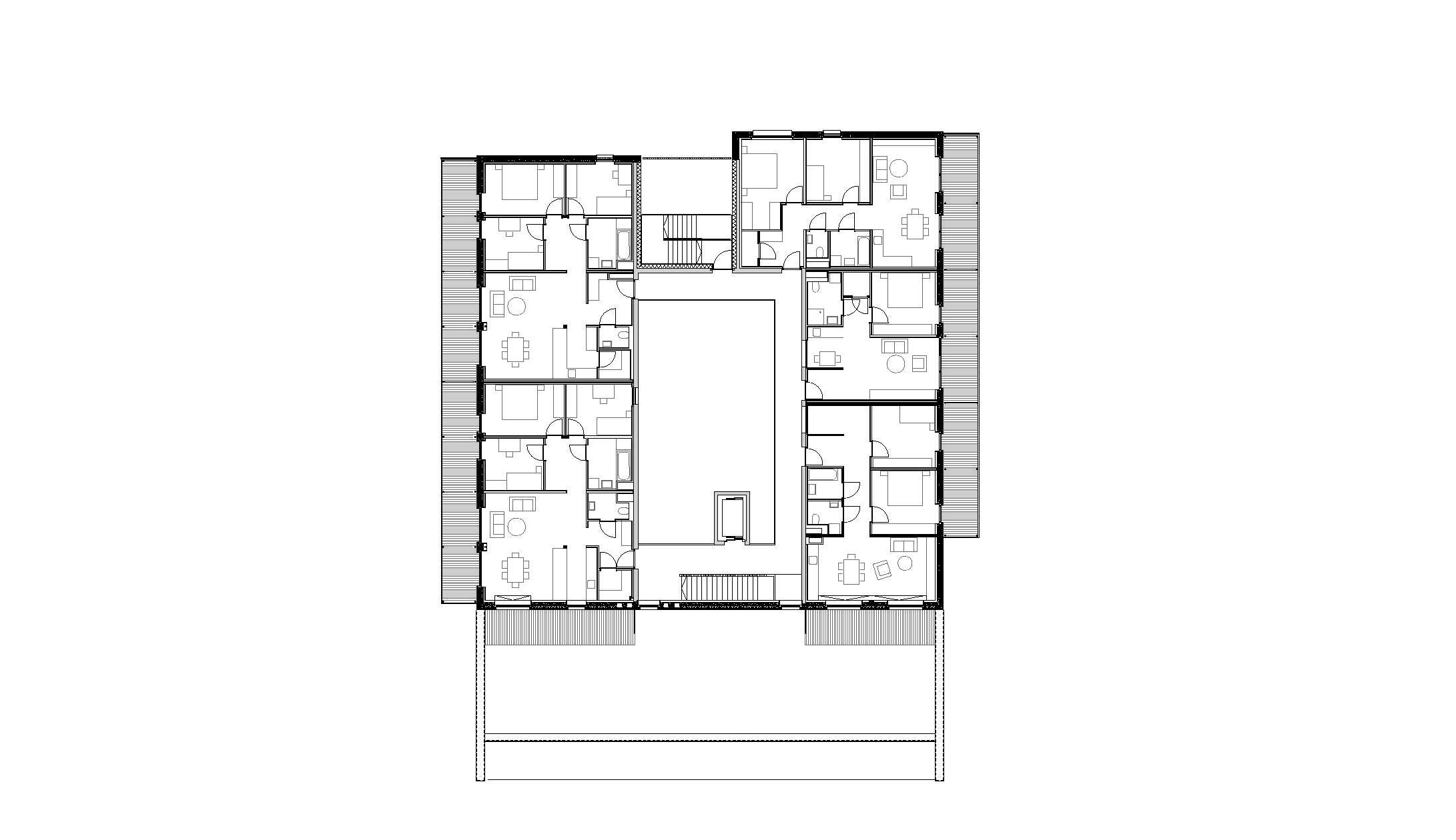 So konnten drei kompakte Baukörper entwickelt werden, die sich am flach abfallenden Hang des Ortsteiles Eichat gegen Süden staffeln. Das oberste Volumen gründet partiell auf der Tiefgarage für das gesamte Areal. Im seinem Erdgeschoss liegen die Räume der Seniorenbetreuung, welche zu einem sonnigen Grünraum ausgerichtet sind. Dieser wird auch von den Kindern als Spielplatz genutzt. In den drei Stockwerken darüber reihen sich 23 Mietwohnungen ringförmig um eine lichte Erschließungshalle. Ein Duzend 2-Zimmer-Apartments wurden barrierefrei geplant, um Möglichkeiten für betreutes Wohnen zu bieten. Südlich des Gebäudes schließt ein markanter Riegel an das Parkgeschoss, der auf vier Etagen 18 Eigentumswohnungen fasst. Davor stehen acht präzise geschnittene Reihenhäuser in kleinen privaten Gärten.
