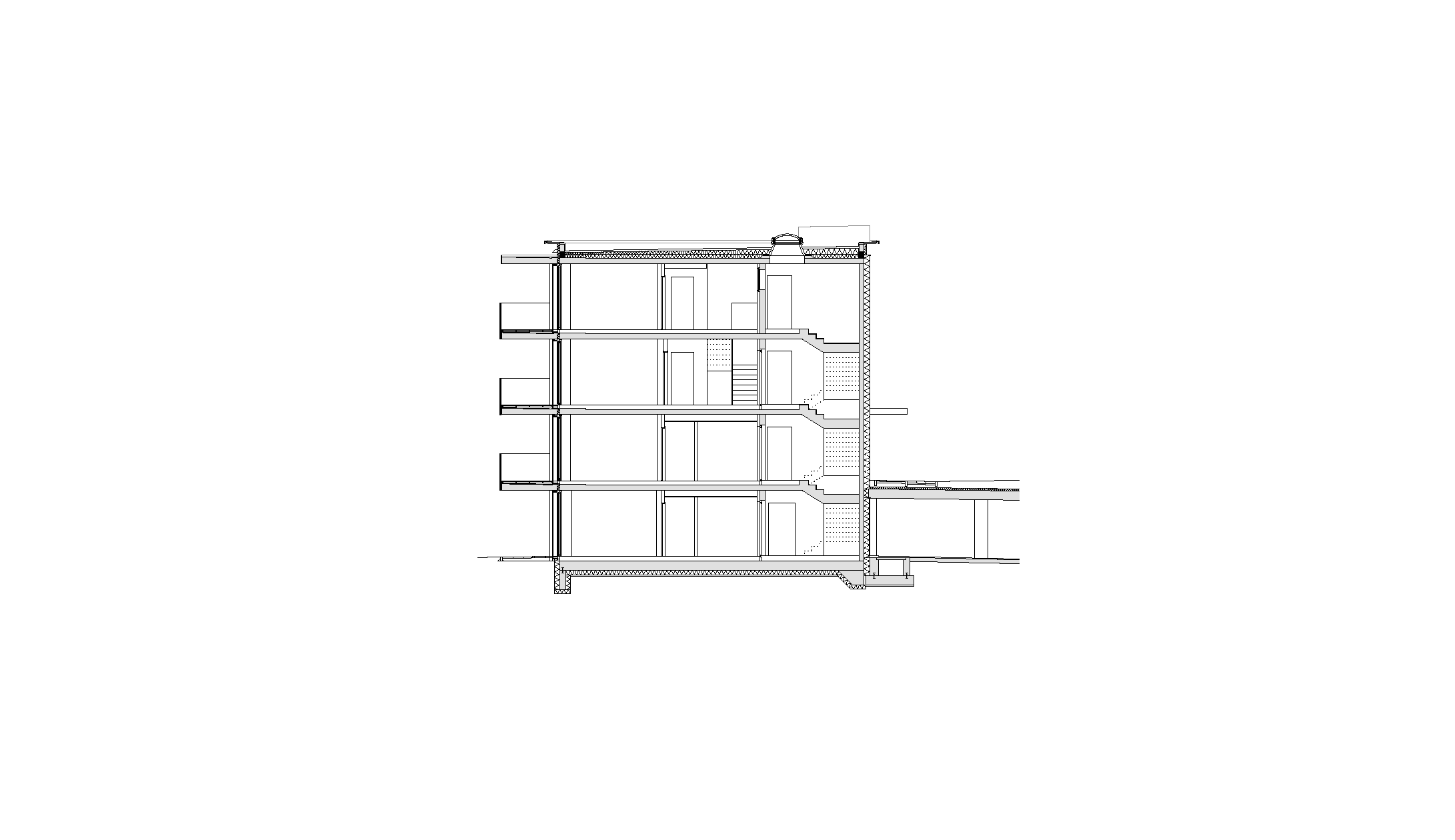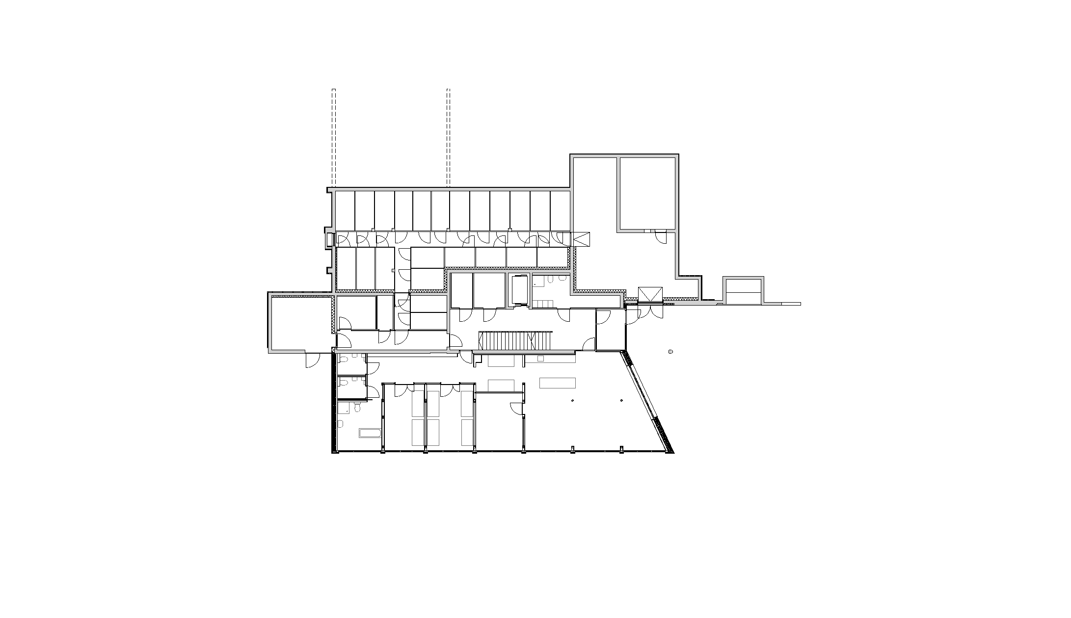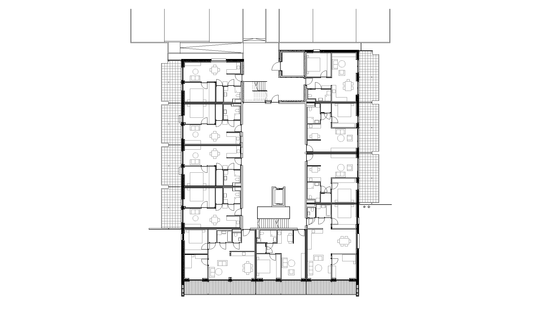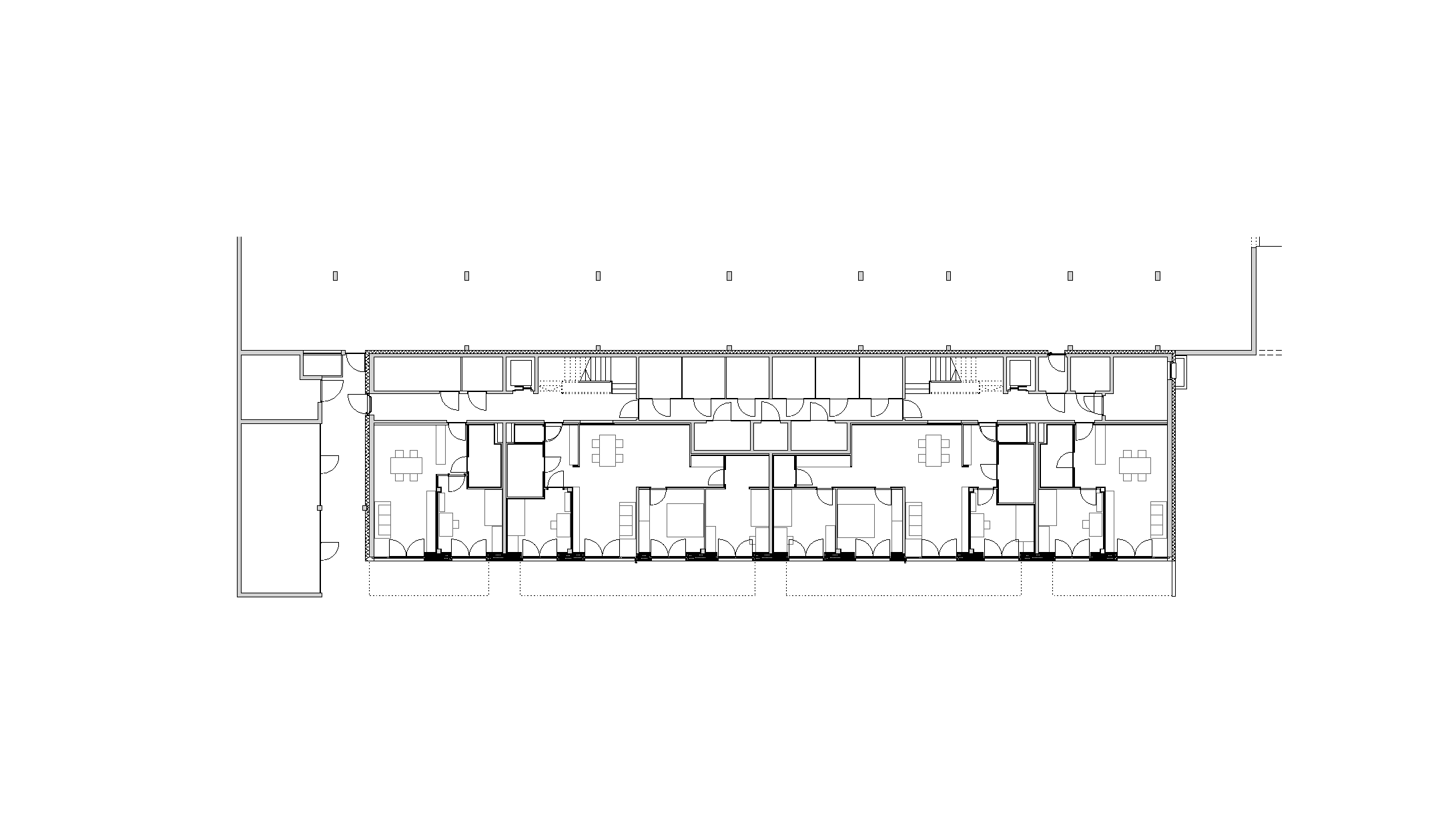 So konnten drei kompakte Baukörper entwickelt werden, die sich am flach abfallenden Hang des Ortsteiles Eichat gegen Süden staffeln. Das oberste Volumen gründet partiell auf der Tiefgarage für das gesamte Areal. Im seinem Erdgeschoss liegen die Räume der Seniorenbetreuung, welche zu einem sonnigen Grünraum ausgerichtet sind. Dieser wird auch von den Kindern als Spielplatz genutzt. In den drei Stockwerken darüber reihen sich 23 Mietwohnungen ringförmig um eine lichte Erschließungshalle. Ein Duzend 2-Zimmer-Apartments wurden barrierefrei geplant, um Möglichkeiten für betreutes Wohnen zu bieten. Südlich des Gebäudes schließt ein markanter Riegel an das Parkgeschoss, der auf vier Etagen 18 Eigentumswohnungen fasst. Davor stehen acht präzise geschnittene Reihenhäuser in kleinen privaten Gärten.