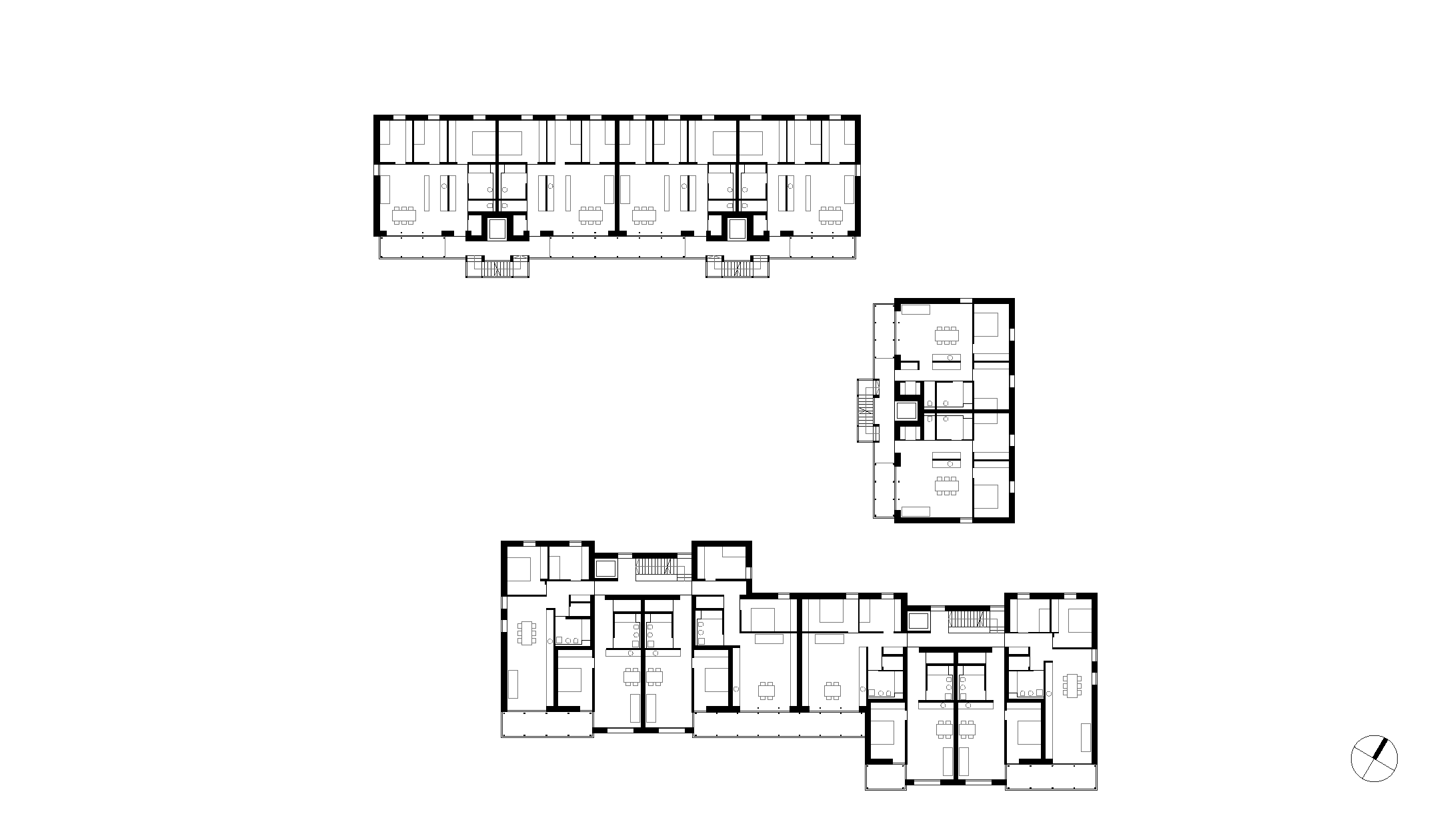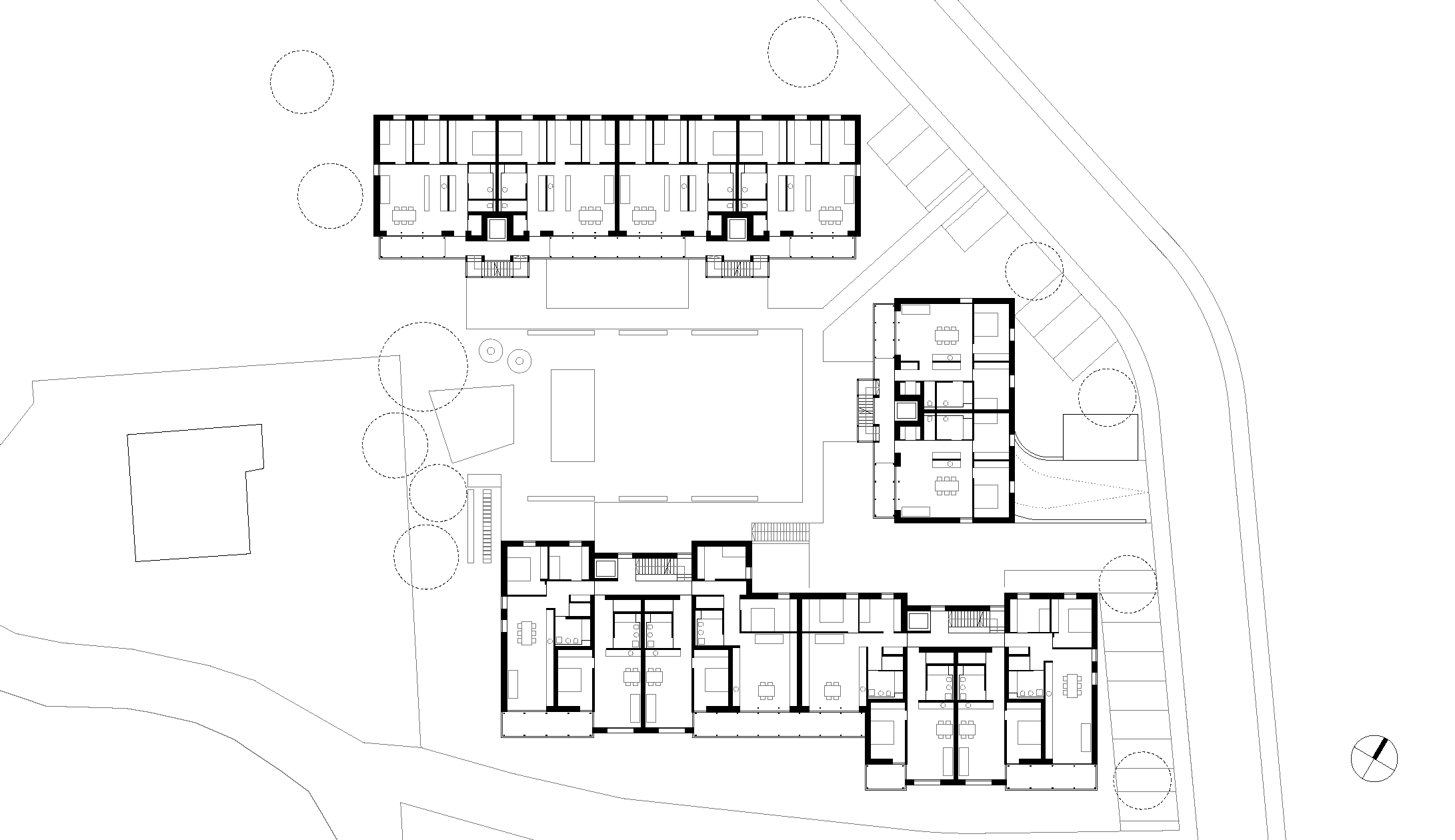 Alle Wohnungen sind in jeweils drei übereinander liegenden Geschossen untergebracht. Den ebenerdigen Wohnungen ist ein privater Garten zugeordnet. Die Wohnbereiche haben raumhohe Fenster zu den vorgelagerten, überdeckten Terrassen hin, welche nach Süden bzw. Westen ausgerichtet sind. Die vorwiegend nord- und ostseitig gelegenen Schlafräume haben kleinere Fenster mit Klappläden.