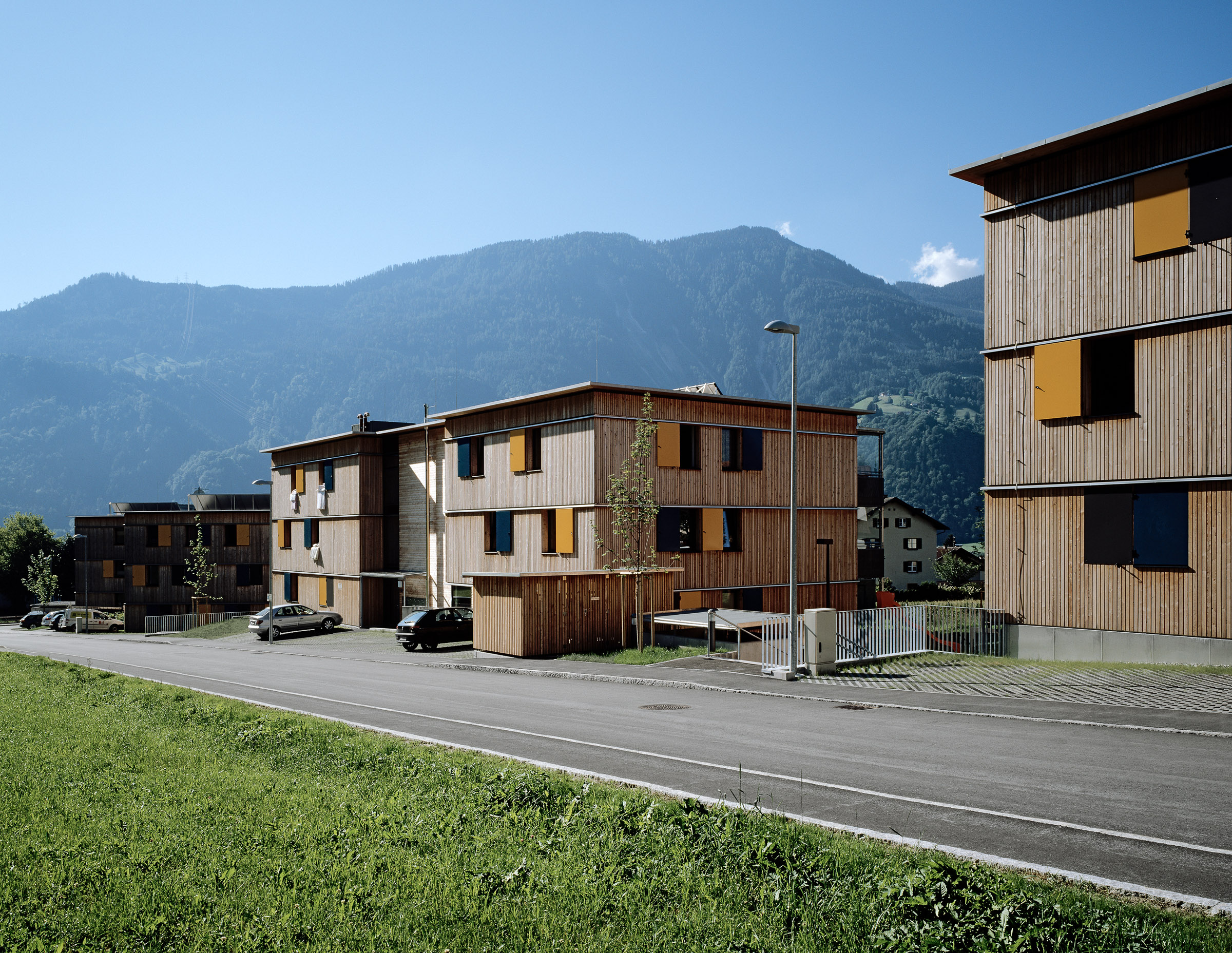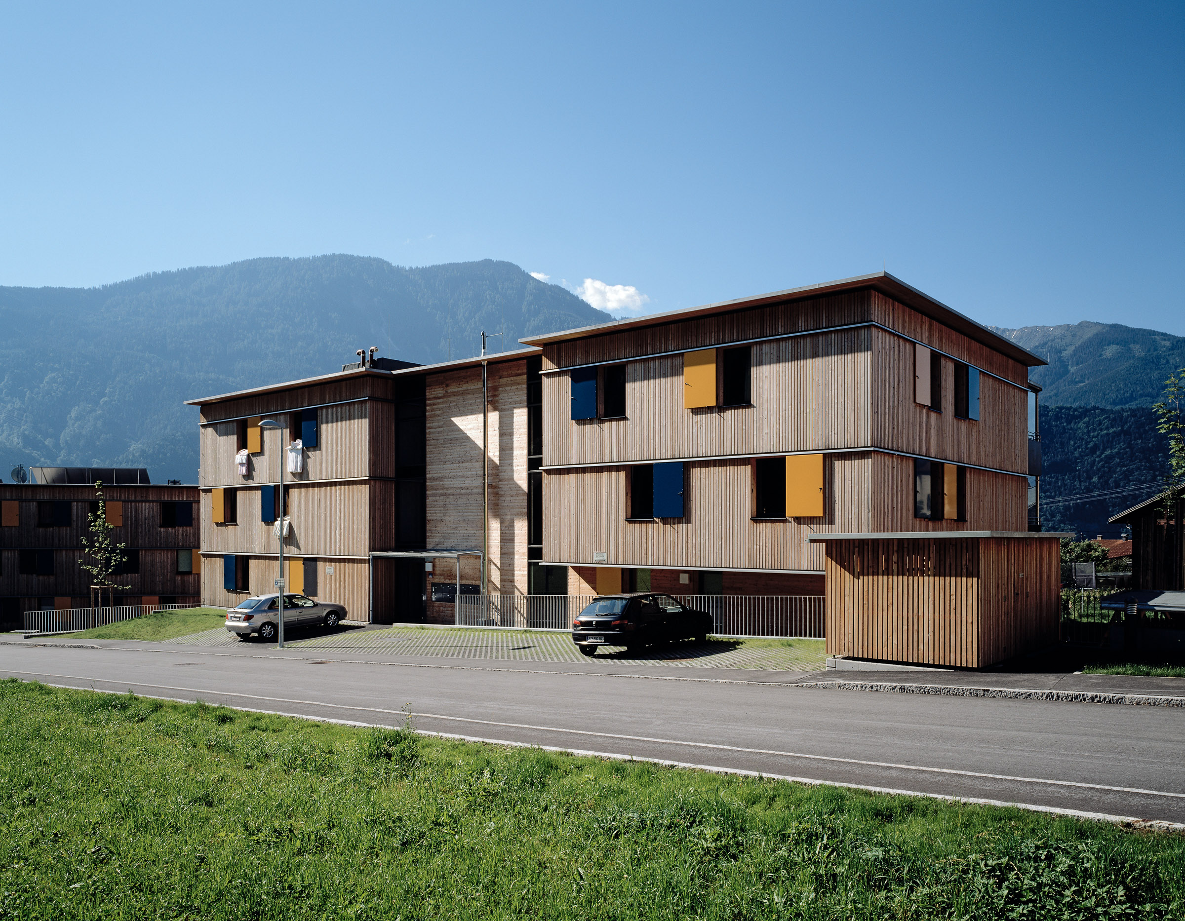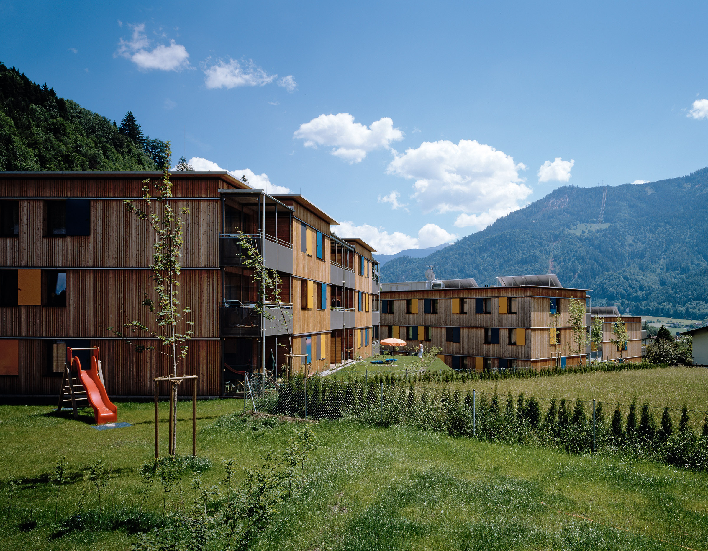 Mehrgeschossiger Wohnbau in Holz wird immer mehr gerade im Mietwohnungsbau als Alternative zu herkömmlichen Bauten gesehen. Dabei erhofft man sich neben der durchaus belegbaren Verminderung der CO2 Belastung (ca. Faktor 3) durch die Herstellung des Bauwerkes selbst eine Alternative zur herkömmlichen Materialwelt im Mehrwohnungsbau. So errichtet der gemeinnützige Wohnbauträger Neue Heimat Tirol auf den Niedermühlbichler Gründen in Jenbach eine Wohnanlage mit 67 Wohnungen in Holzbauweise und im Passivhausstandard. (Energieeinsparung für den Betrieb ca. Faktor 4 gegenüber Niedrigenergiehaus) Diese Anlage ist bereits der dritte Holzwohnbau der NHT, jedoch der erste in Passivhausqualität. Hier soll evolutionär ein weiterer Erfahrungsbaustein dazukommen und zudem ein Projekt entstehen, das in die Zukunft weist. Im ersten Bauabschnitt werden 42 Einheiten errichtet. Dieser bildet einen Hof, von dem aus alle Wohnungen erschlossen werden und der als Kinderspielfläche sowie großer Kommunikationsraum angeboten wird. Es sind hier auch alle großen Wohnungen angeordnet, ein familiengerechtes Wohnen ist hier das Hauptthema.