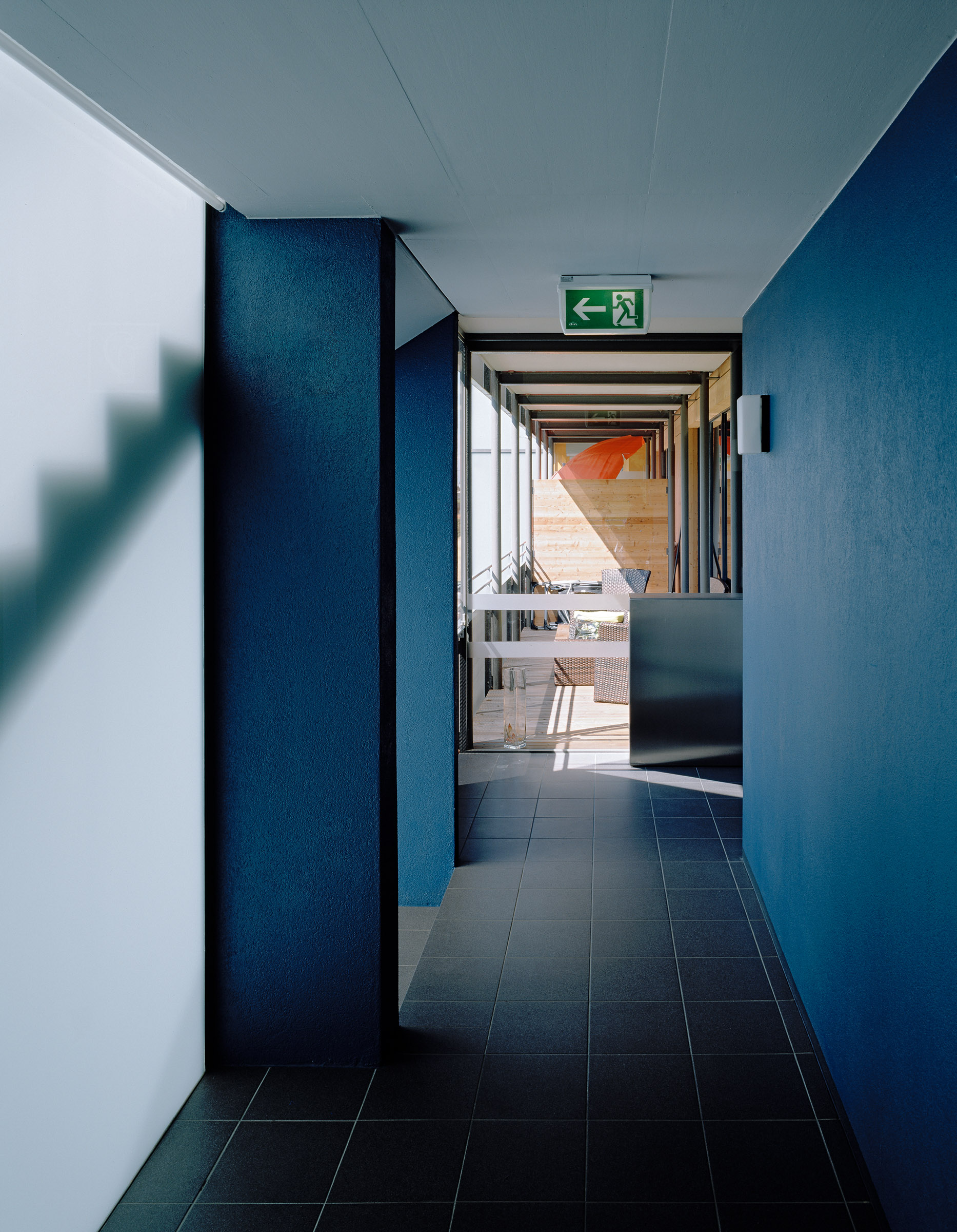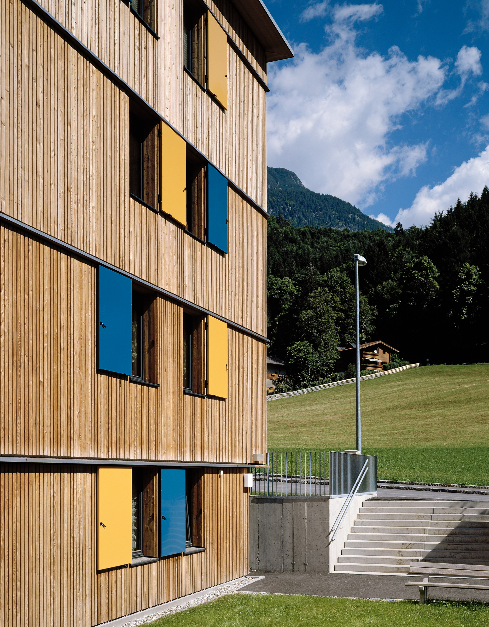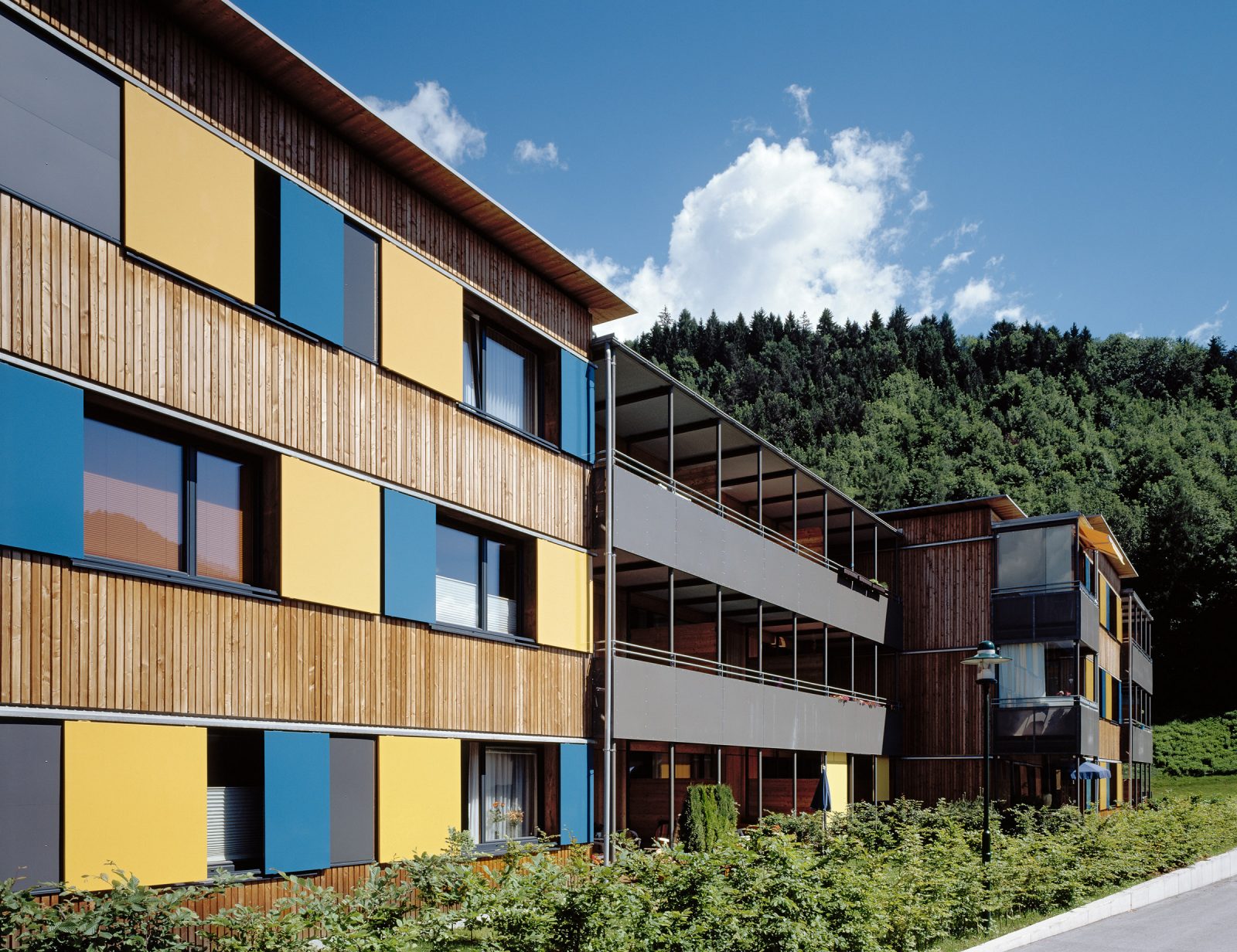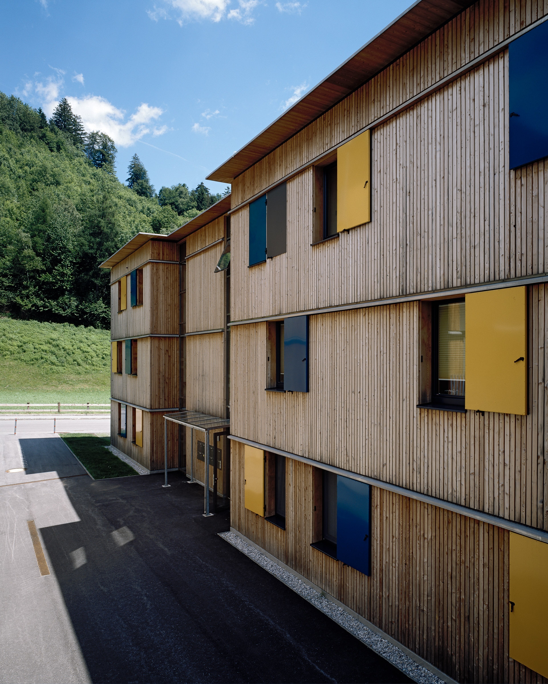Die Außenfassade wird mit natubelassener Lärchenholzschalung ausgeführt, ebenso die Fenster. Als farbliche Differenzierung werden die Drehläden der Fenster farbig gestaltet, eine Reminiszenz an historische Holzbauten. In den Wohnungen ist das Konstruktionsmaterial des Hauses durch die sichtbaren Holzdecken erlebbar.