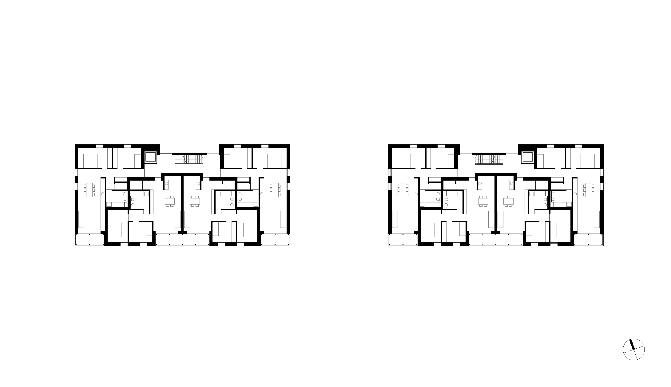 Alle Wohnungen sind in jeweils drei übereinander liegenden Geschossen untergebracht. Den ebenerdigen Wohnungen ist ein privater Garten zugeordnet. Die Wohnbereiche haben raumhohe Fenster zu den vorgelagerten, überdeckten Terrassen hin, welche nach Süden bzw. Westen ausgerichtet sind. Die vorwiegend nord- und ostseitig gelegenen Schlafräume haben kleinere Fenster mit Klappläden. Die Wohnhäuser sind als Passivhäuser konzipiert und bekommen eine kontrollierte Be- und Entlüftung mit Wärmerückgewinnung. Der Restenergiebedarf wird mit Gas gedeckt, die Beheizung erfolgt über Fußbodenheizung. Die Warmwasserbereitung erfolgt dezentral über Sonnenkollektoren für jedes Haus getrennt.