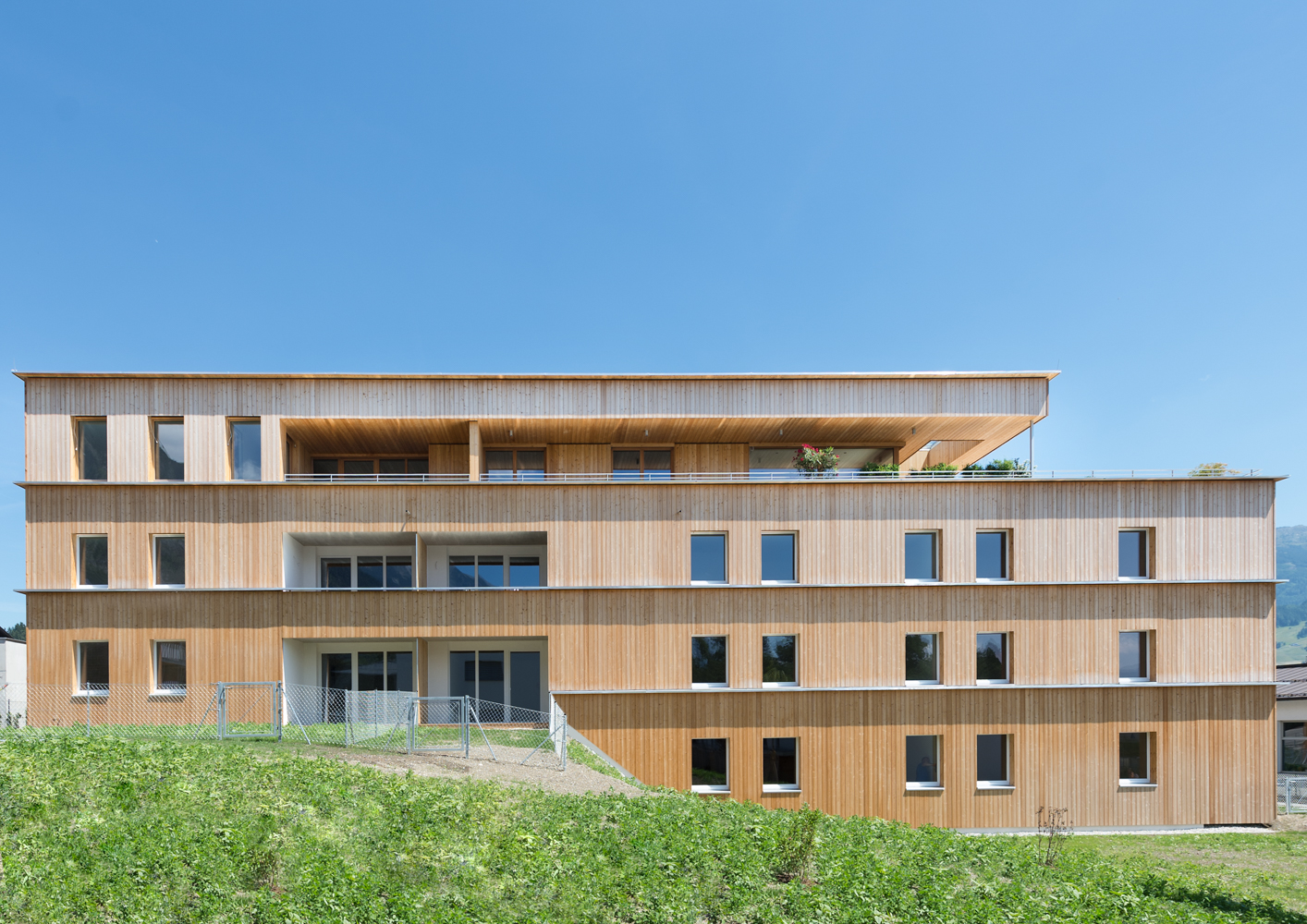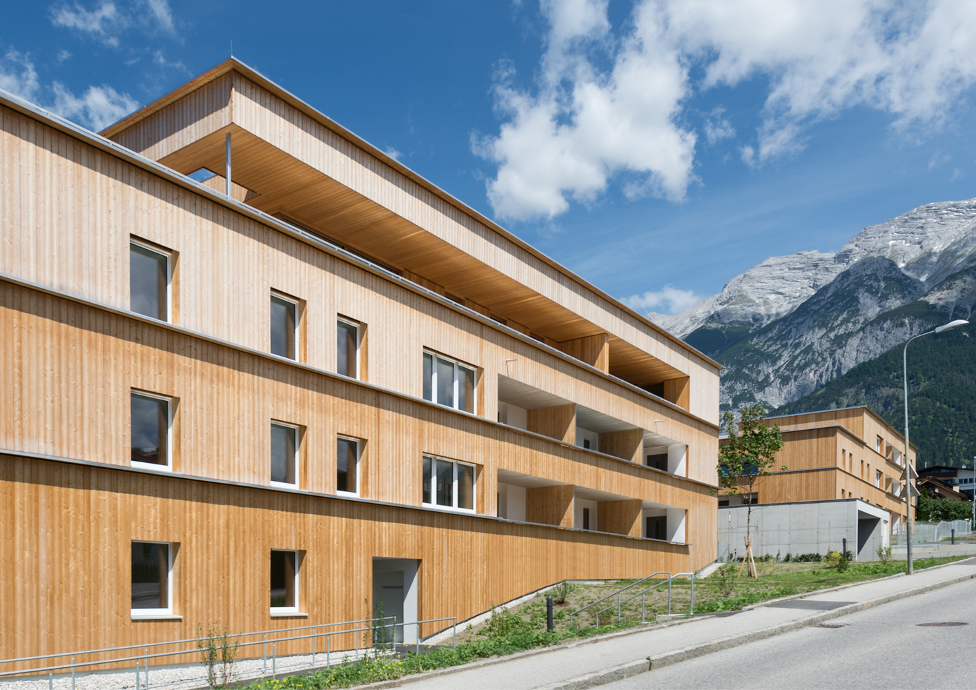 Die beiden Objekte wurden in Hybridbauweise aus Holz und Beton errichtet. Die äußere Gebäudehaut ist mit einer vertikalen Lärchenschalung belegt, während die Wände zu den Loggien als verputzte Wärmedämmverbundsysteme ausgeführt sind. Wie die bestehenden Bauwerke, wurden auch die neuen Gebäude im Passivhausstandard errichtet, mit einer kontrollierten Lüftung zur Wärmerückgewinnung ausgestattet und an die bestehende zentrale Heizanlage angeschlossen.