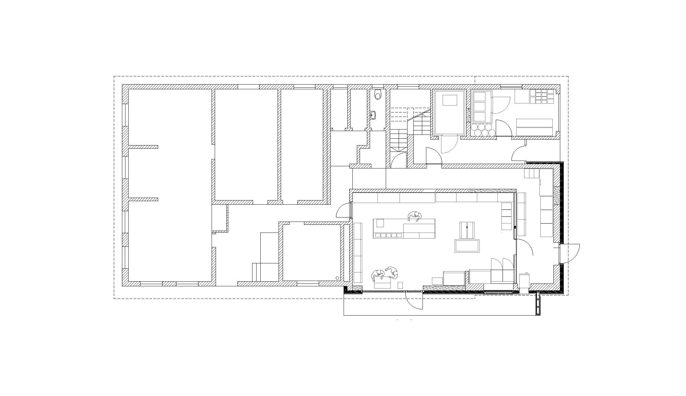 Die Traffik des „Ochsens“ musste erweitert und renoviert werden. Das Geschäft sollte auch weiterhin eine Einkaufsmöglichkeit im hochgelegenen Ort bieten – als OXA Lädele hat es unter der gleichen Funktion einen neuen Namen erhalten. Der Umbau musste günstig ausfallen, da hohe Investitionen das wirtschaftliche Bestehen des Lädeles bedrohen würden. Der östliche Anbau des Gasthauses wurde innen erneuert, das Schaufenster zu einer großen Eingangsfront ausgeweitet, die geschindelte Fassade gedämmt und mit einer stehenden Lattung eingepackt. Das Vordach aus Stahl und Massivholz blieb bestehen und wurde in die neue Gestaltung integriert. Trotz des engen Budgets konnten die behördlichen Auflagen eingehalten werden: für Geschäfte mit Lebensmitteln ebenso wie die Sicherheitsvorgaben für Bankomaten – dies waren die größte Herausforderungen in diesem Projekt. Der Ausbau ist mit Regalen ab der Stange einfach gehalten, denn der Entwurf ordnete sich vollends dem Ziel unter, eine solide wirtschaftliche Basis für den Betrieb des Geschäftes zu schaffen – und es gelingt ihm dennoch zu kommunizieren, dass neben dem Ochsen etwas Neues entstanden ist.