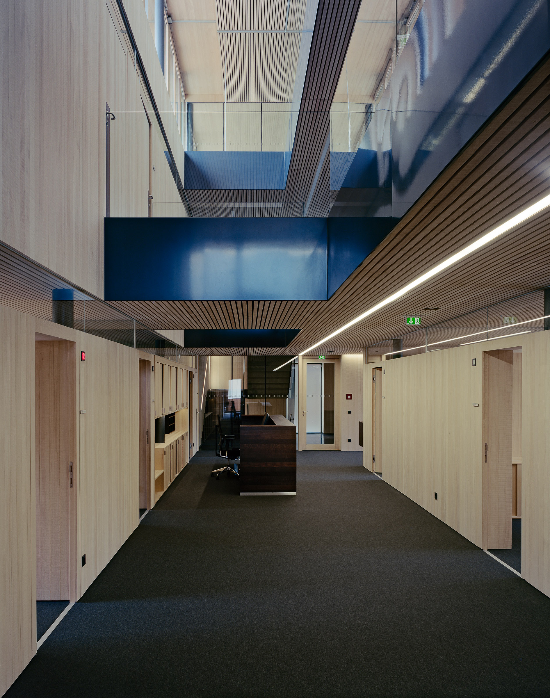 Die Obergeschosse sind über großzügige Lufträume verbunden, die das Licht aus dem Dachgeschoss in die Gebäudemitte lenken.