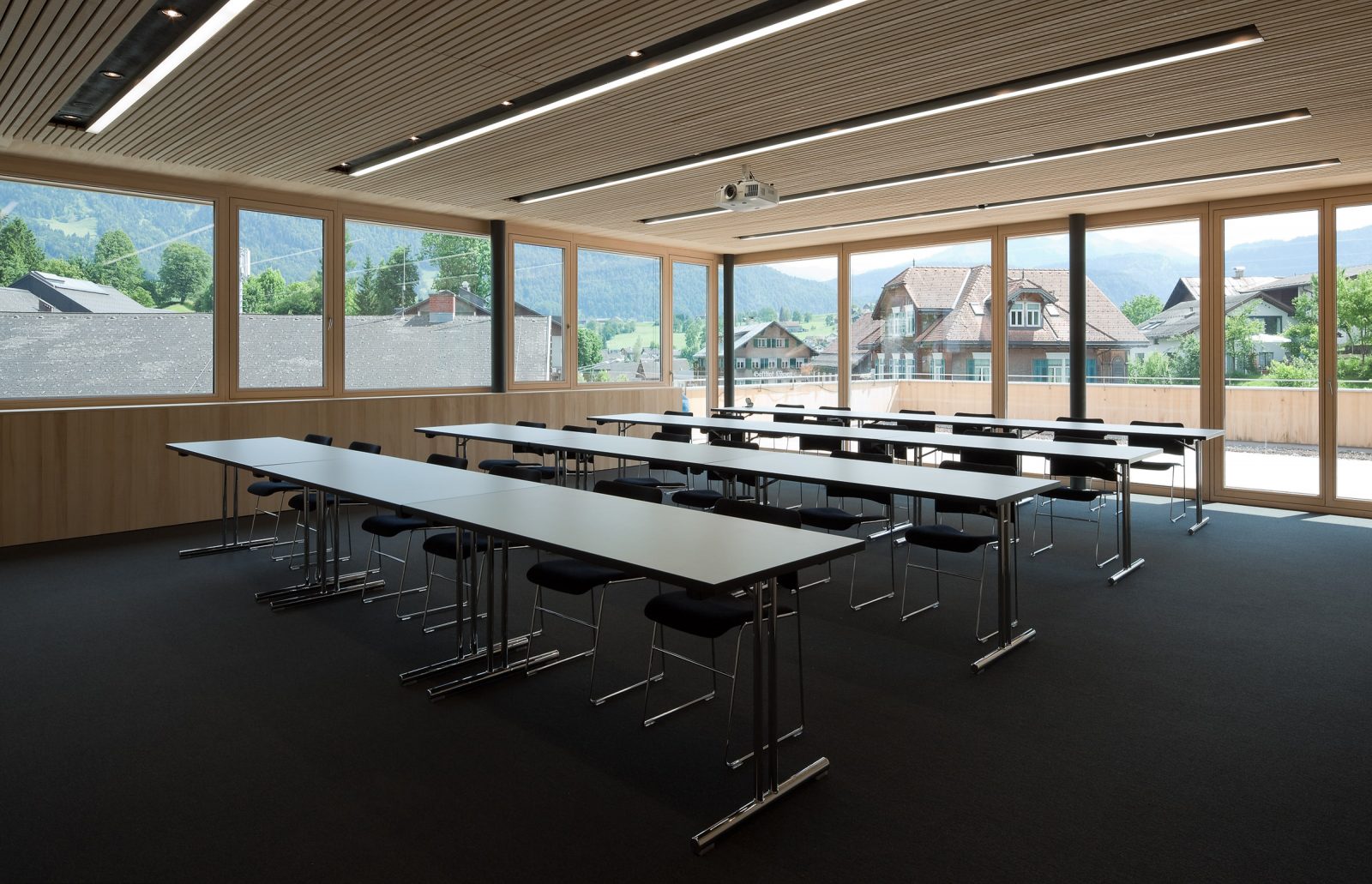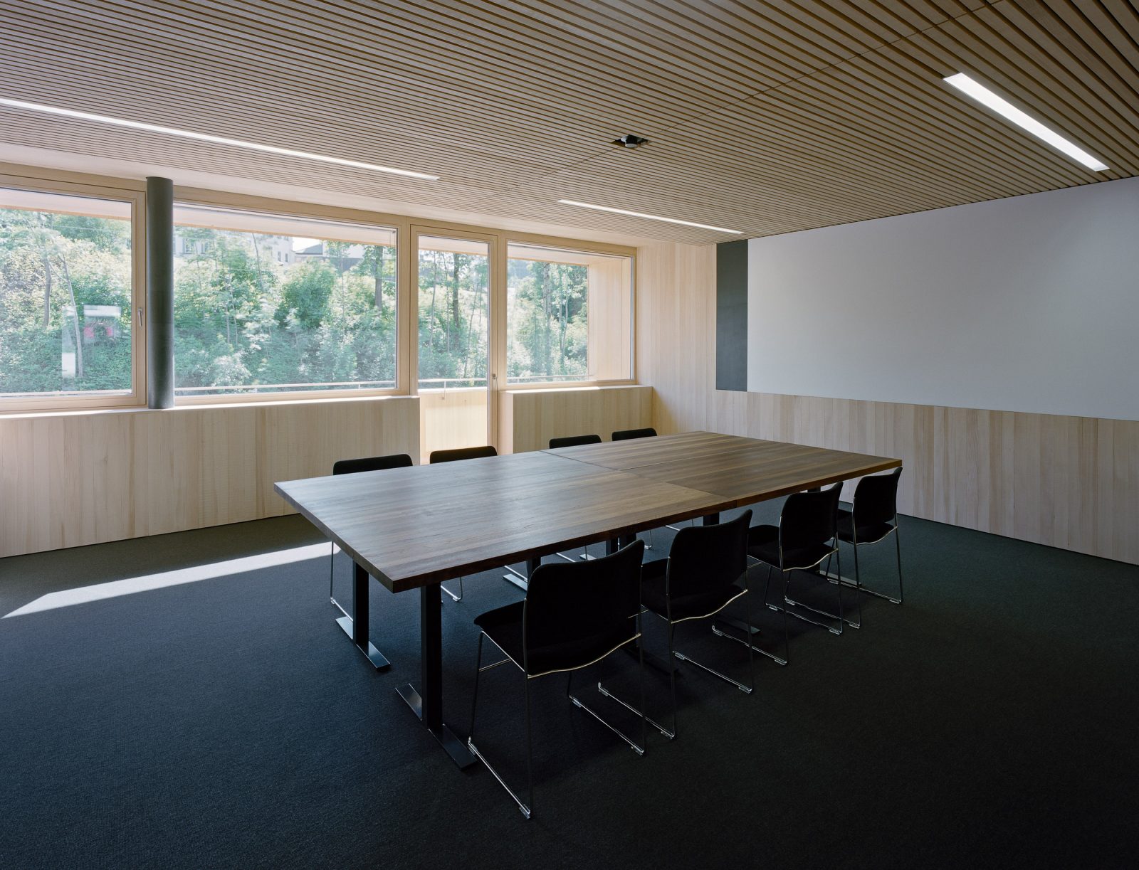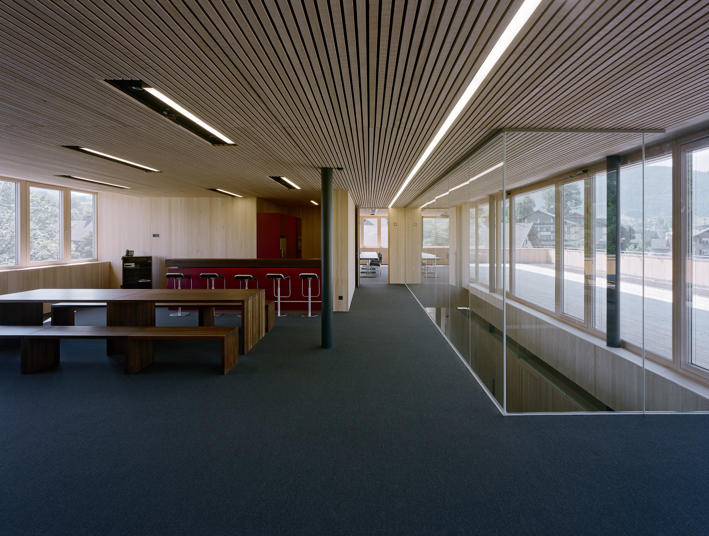 Im Sinne der Nachhaltigkeit bilden auch bei der Innenraumgestaltung heimische Hölzer den Schwerpunkt: Unbehandelte heimische Weißtanne für Wände, Einbauten, Türen, als Ergänzung dazu akzentuiert eingesetzte Eichen-Möbel.