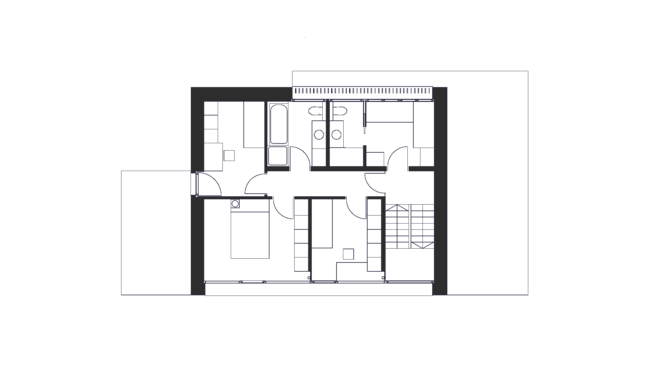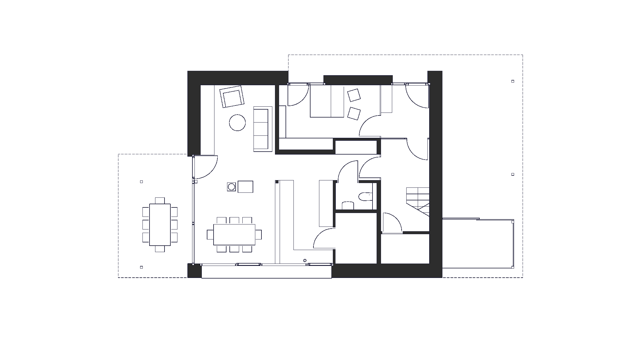 Die innere Organisation ist auf den Alltag einer kleinen Familie abgestimmt, sie wohnt im Erdgeschoss um den zentralen Ofen herum, die kleinen Individualräume im Obergeschoss erhalten eine gewisse Großzügigkeit durch ihr Offenheit in die Dachschräge. Damit erklärt sich auch das ausmittige Dach, denn es reagiert auf die Grundrissdisposition.