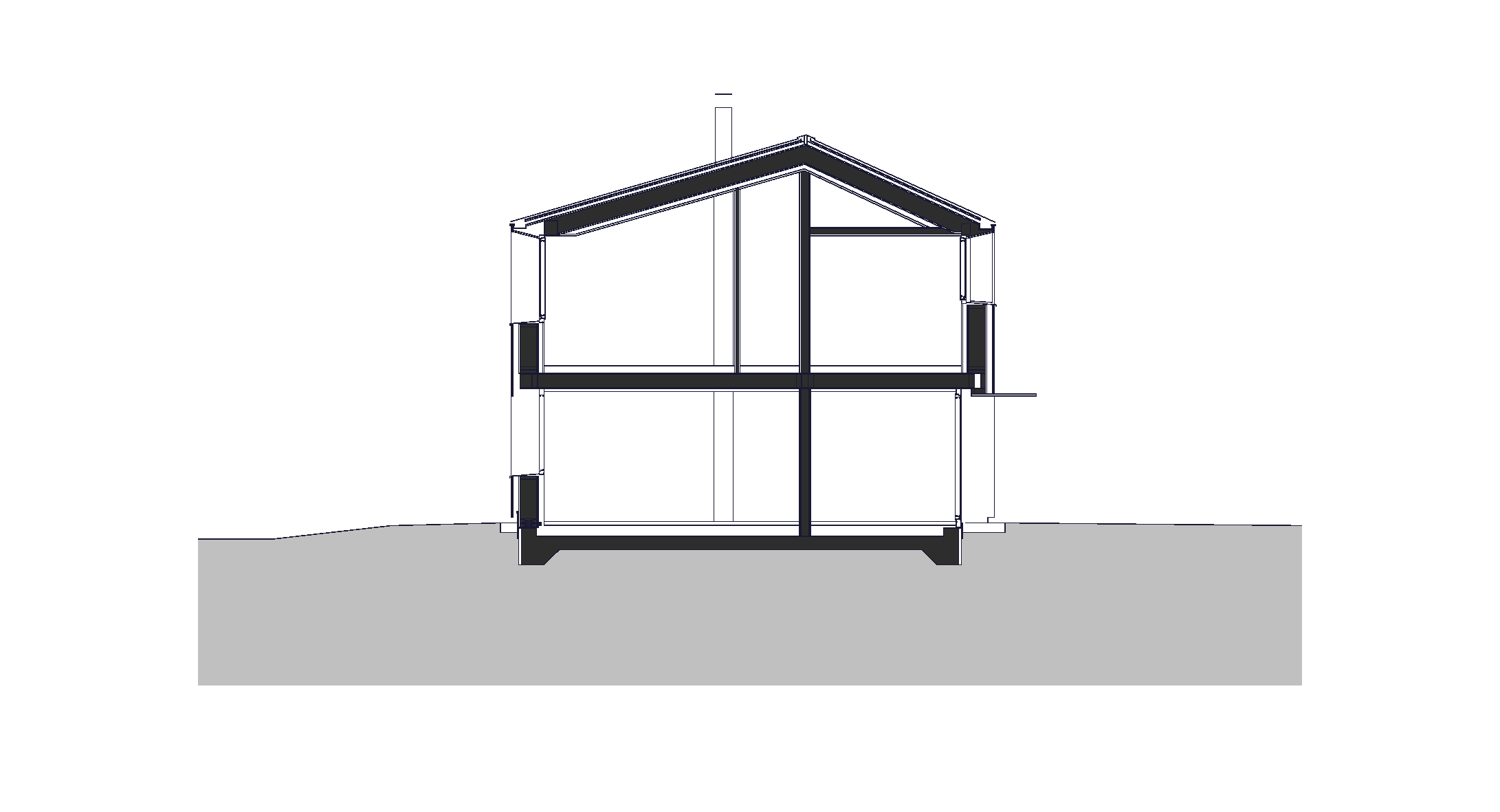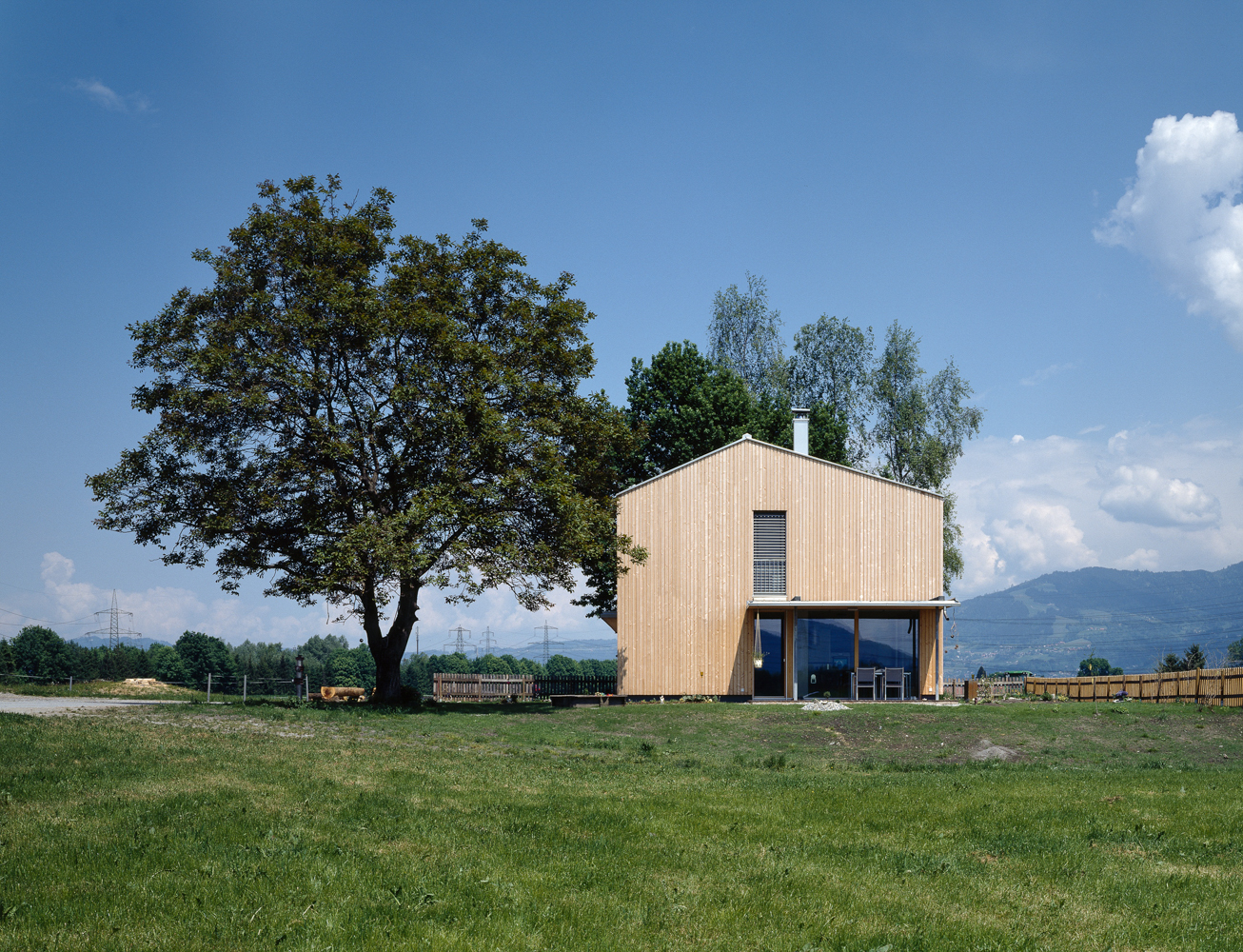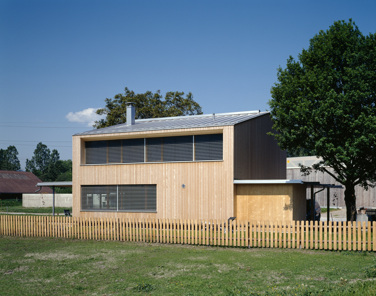 Das kleine Einfamilienhaus ist nun also ein modernes Bauernhaus aus Holz gebaut. Es steht auf dem von uns vorgeschlagenen Ort im richtigen Abstand zum bestehenden Baum, verkleidet mit naturbelassener, senkrechter, sägerauer Weisstannen-Schalung. Nach Süden und Westen orientiert, von Norden erschlossen und nicht unterkellert mit kleinen Anbauten für das unumgängliche Auto sowie dem gedeckten Freisitz gibt es sich ruhig und bescheiden, seine Dimension ist das Ergebnis eines eingehenden Optimierungsprozesses. Ebenfalls bescheiden ist der Heizenergieverbrauch durch optimierte Gebäudehülle und gutem Verhältnis von Oberfläche zu Volumen, ungefähr 2 Kubikmeter Holz dürften ausreichen, das Haus warm zu halten. Die tief sitzenden, dadurch geschützten Passivhausfenster zeigen den hohen Dämmstandard und geben dem Holzbau eine ungewöhnliche Plastizität, welche durch das bündig sitzende asymmetrische Dach noch stärker betont wird.