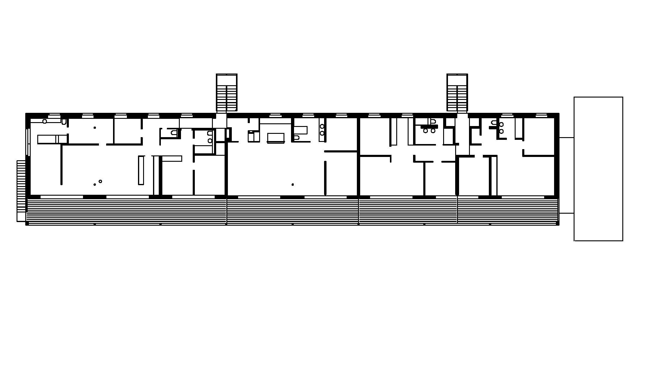 Ein 58 Meter langer, hölzerner „Wohnkubus“ schwebt über der Erdgeschoßigen Architektur Bürofläche.