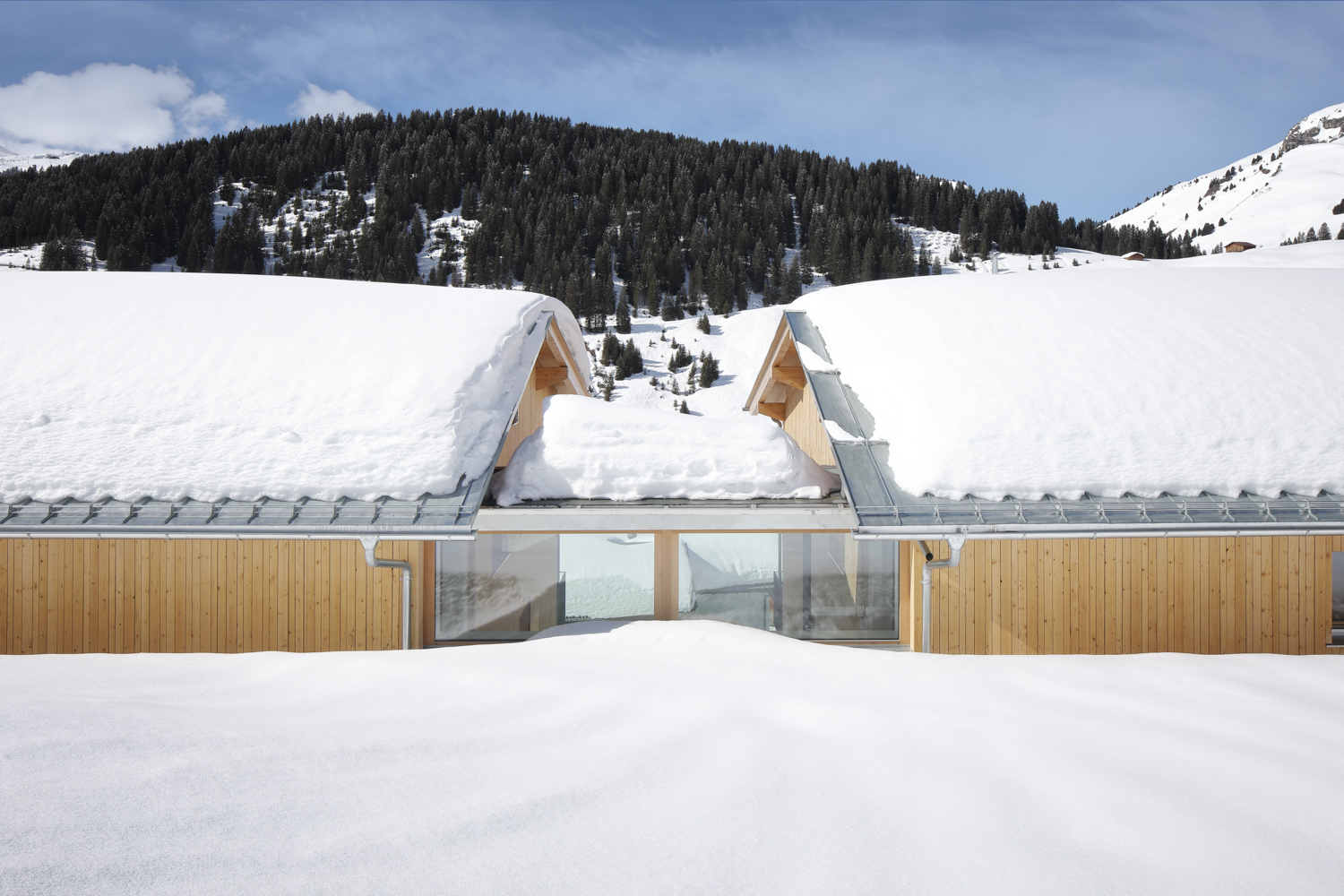 Das Gebäude wurde in Massivbauweise errichtet, die asymmetrischen Satteldächer in Blech gedeckt. Eine feine Vertikalschalung aus Fichtenbrettern umhüllt die Volumen, auch Fenster und Türen konnten in Holz ausgeführt werden. Wände und Decken der Innenräume sind ganz in schlichtem Weiss gehalten, die Böden hingegen mit hochwertigem Eichenparkett belegt. Geheizt wird mit Fernwärme aus Biomasse und eine kontrollierte Lüftung sorgt für die Wärmerückgewinnung im behaglichen Niedrigenergiehaus.
