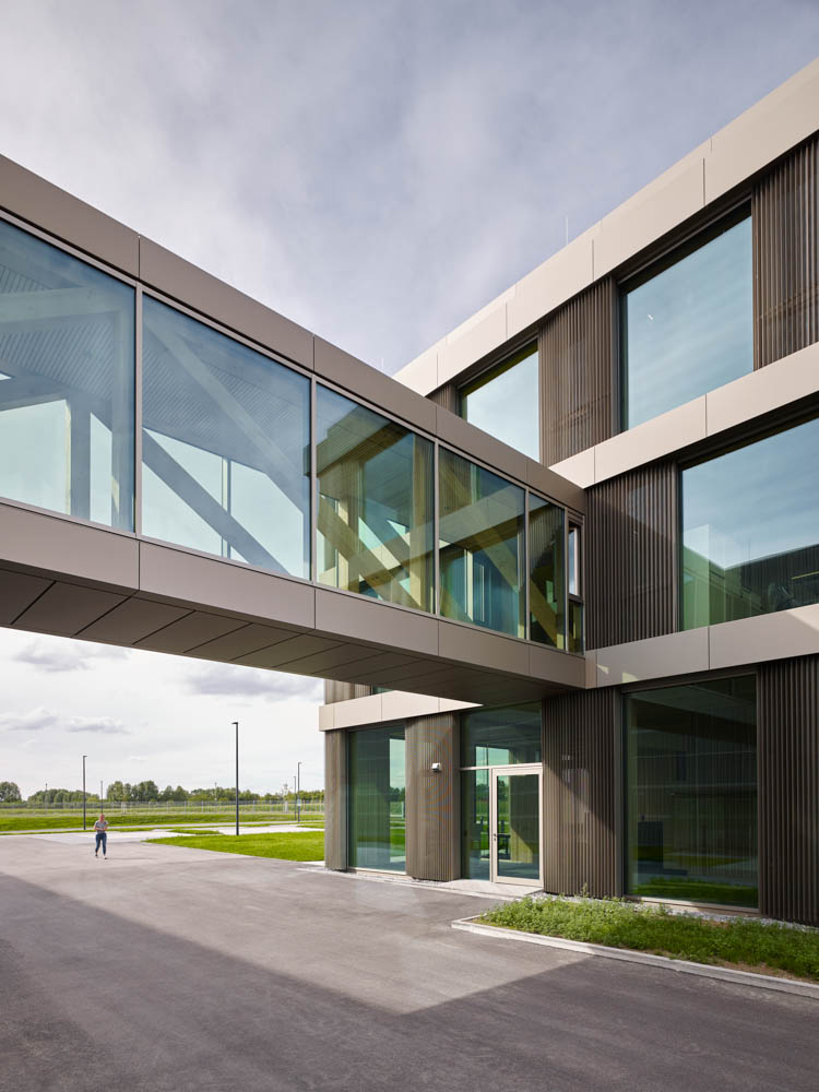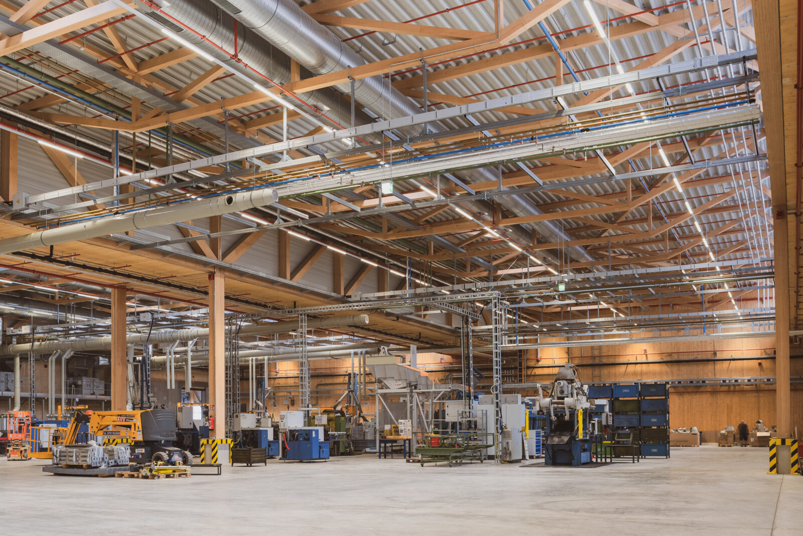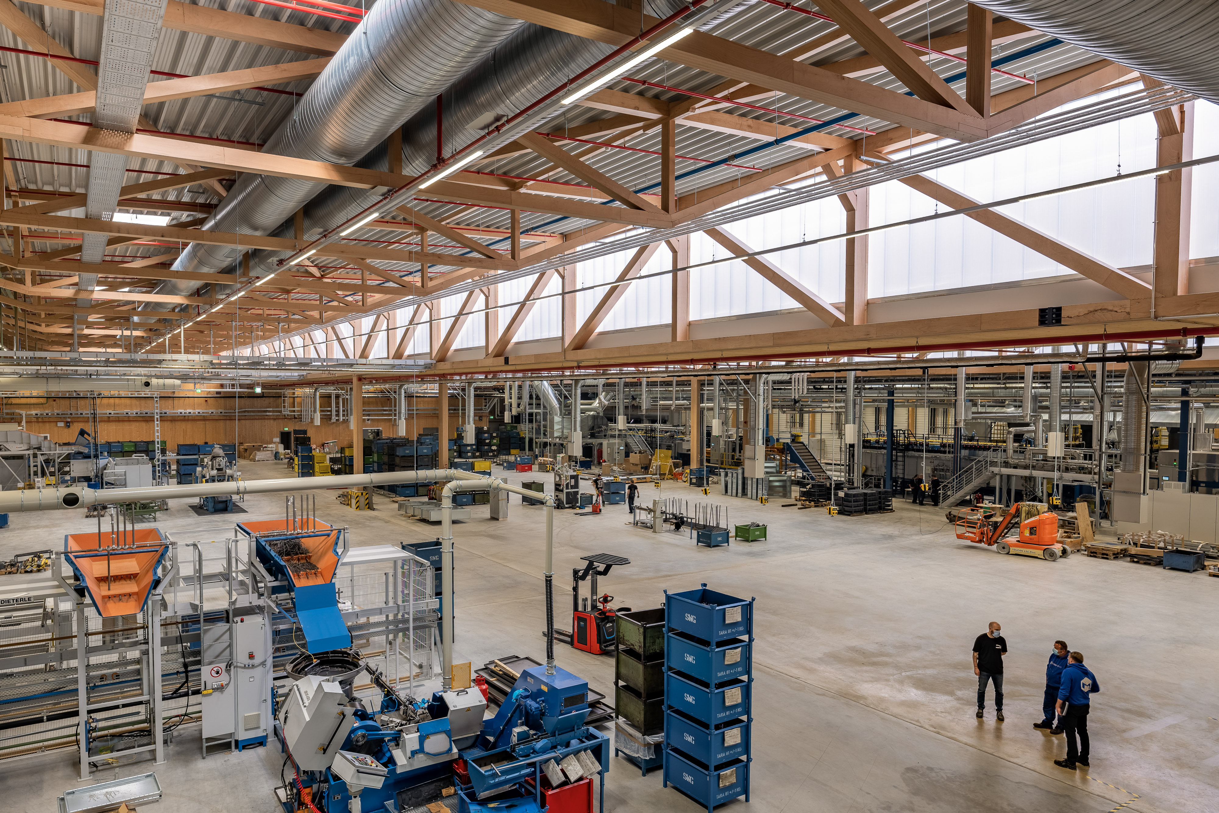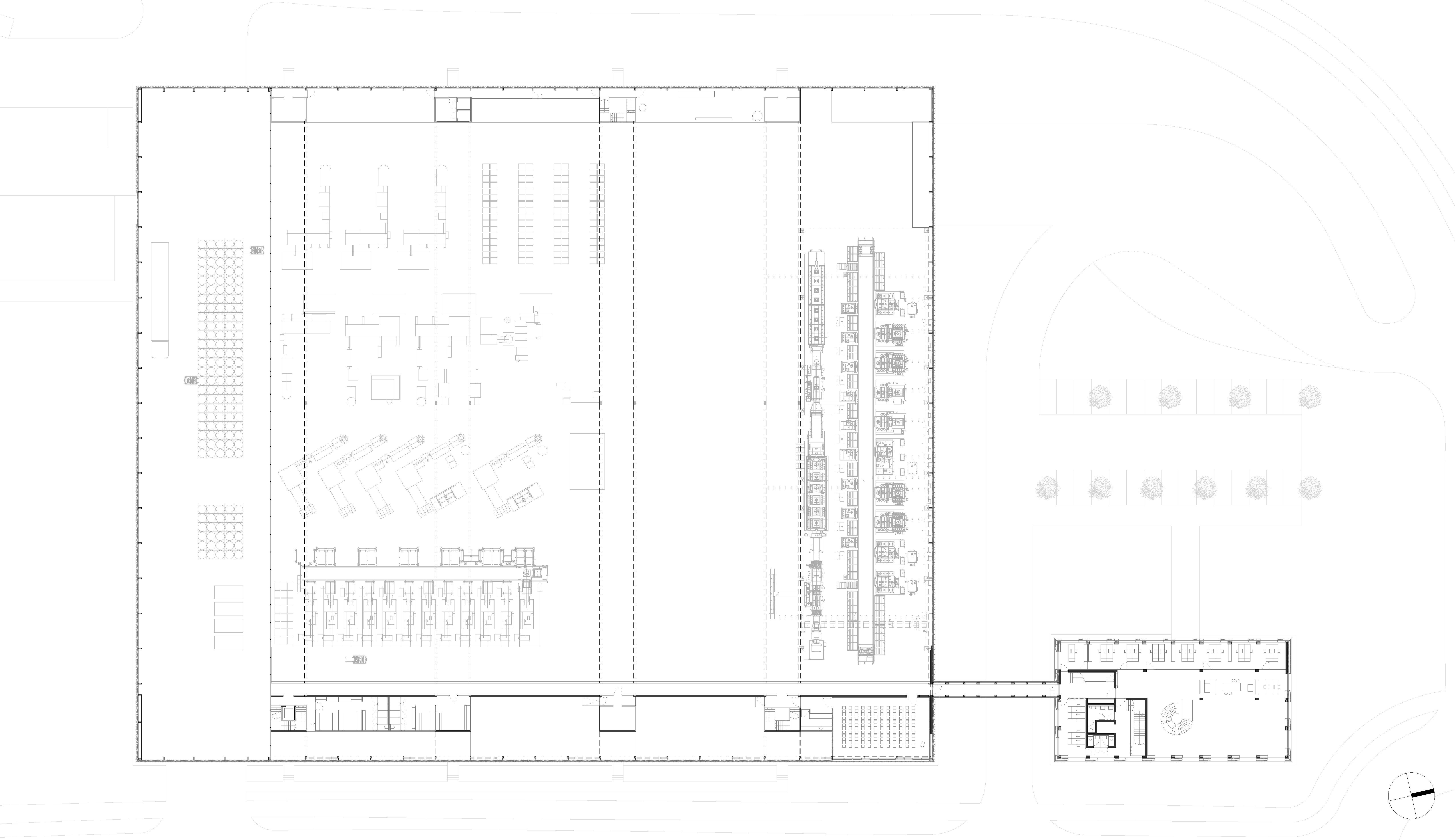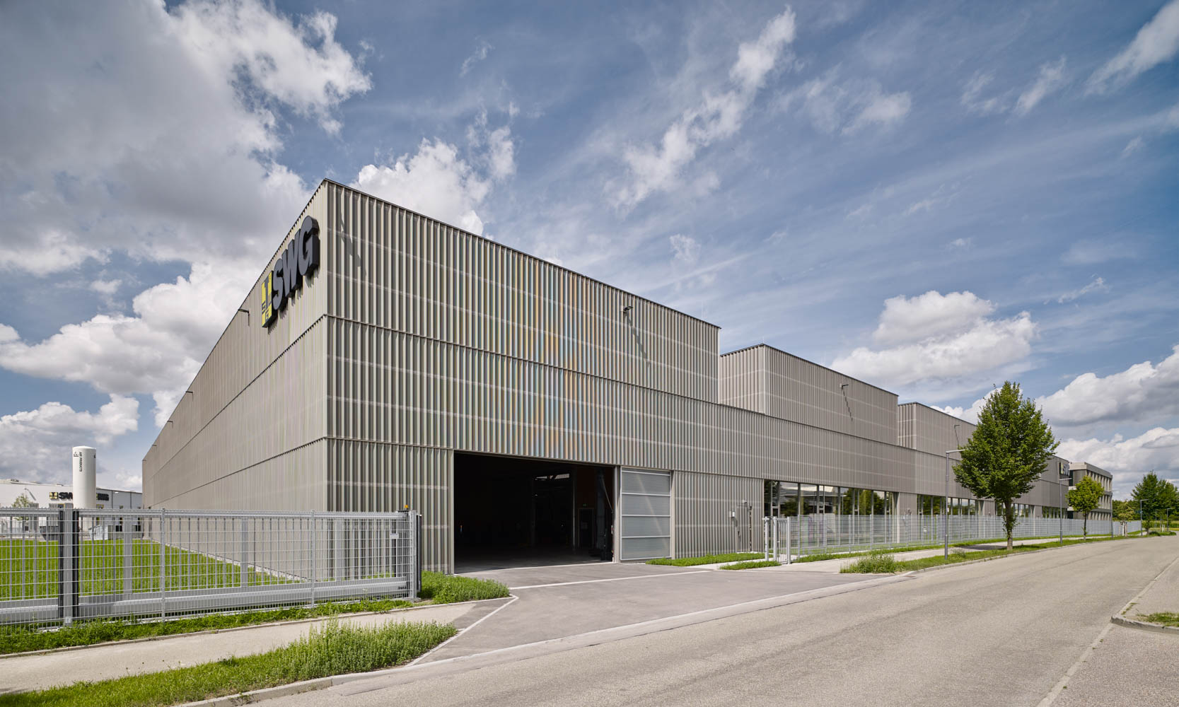 Schließlich wird ein Gebäudeensemble in unmittelbarer Nähe des Firmensitzes konzipiert. Die großflächige Fertigungshalle ist über eine Brücke mit einem dreigeschossigen Pavillon verbunden, der neben Büroräumlichkeiten und Sitzungszimmern auch einen ausgedehnten Empfangs- und Ausstellungsbereich für Besucher fasst. Hier können Interessierte die hauseigenen Produkte und ihre Anwendungen kennenlernen und am Anschauungsbeispiel der gebauten Struktur vor Ort studieren. So entsteht ein außergewöhnlich hoher Anspruch an die Qualität der Konstruktion und Ausführung des Industriebaues. Die Produktionsstätte weist enorme Dimensionen auf, um zahlreiche große Maschinen mit umfangreicher technischer Infrastruktur aufzunehmen. Sie erstreckt sich über eine Länge von 114 m und eine Breite von 96,5 m, die Höhe beträgt etwa 12 m. 70% der Grundfläche nimmt der Fertigungs- und Logistikbereich ein, während für Werkzeuge und Werkzeugbau 20% vorgesehen sind sowie weitere 10% für die Lagerung des Rohmaterials.
