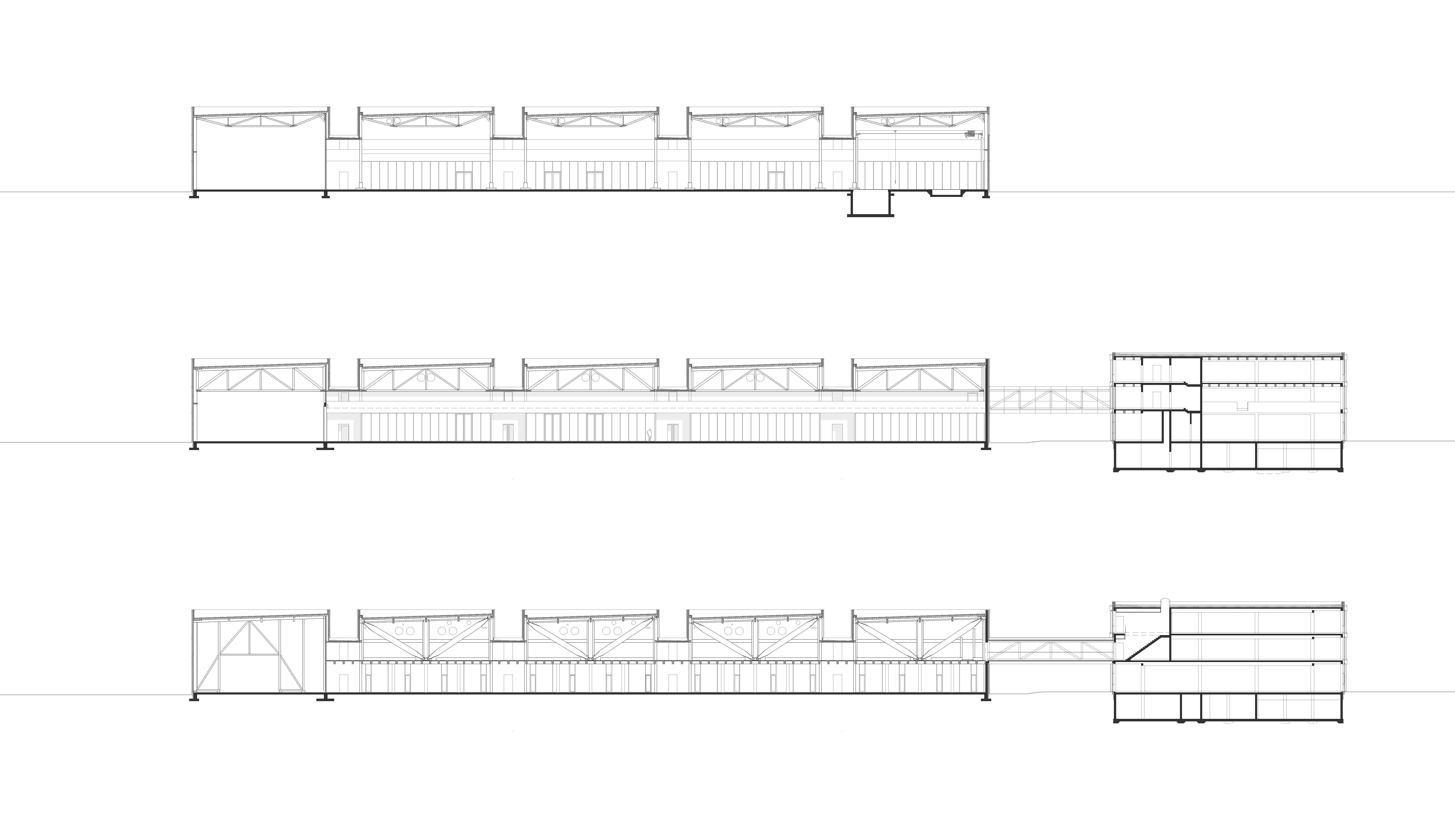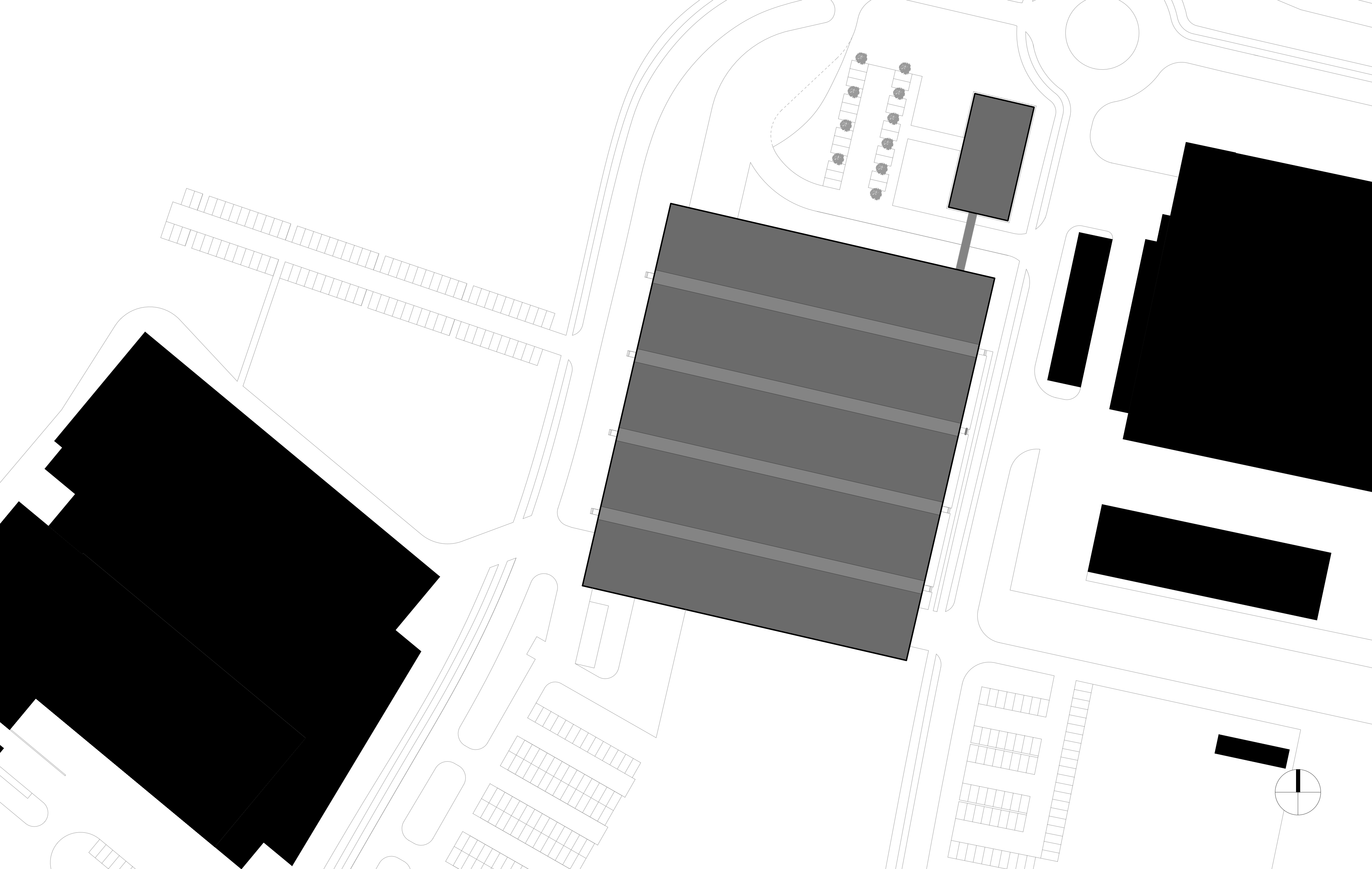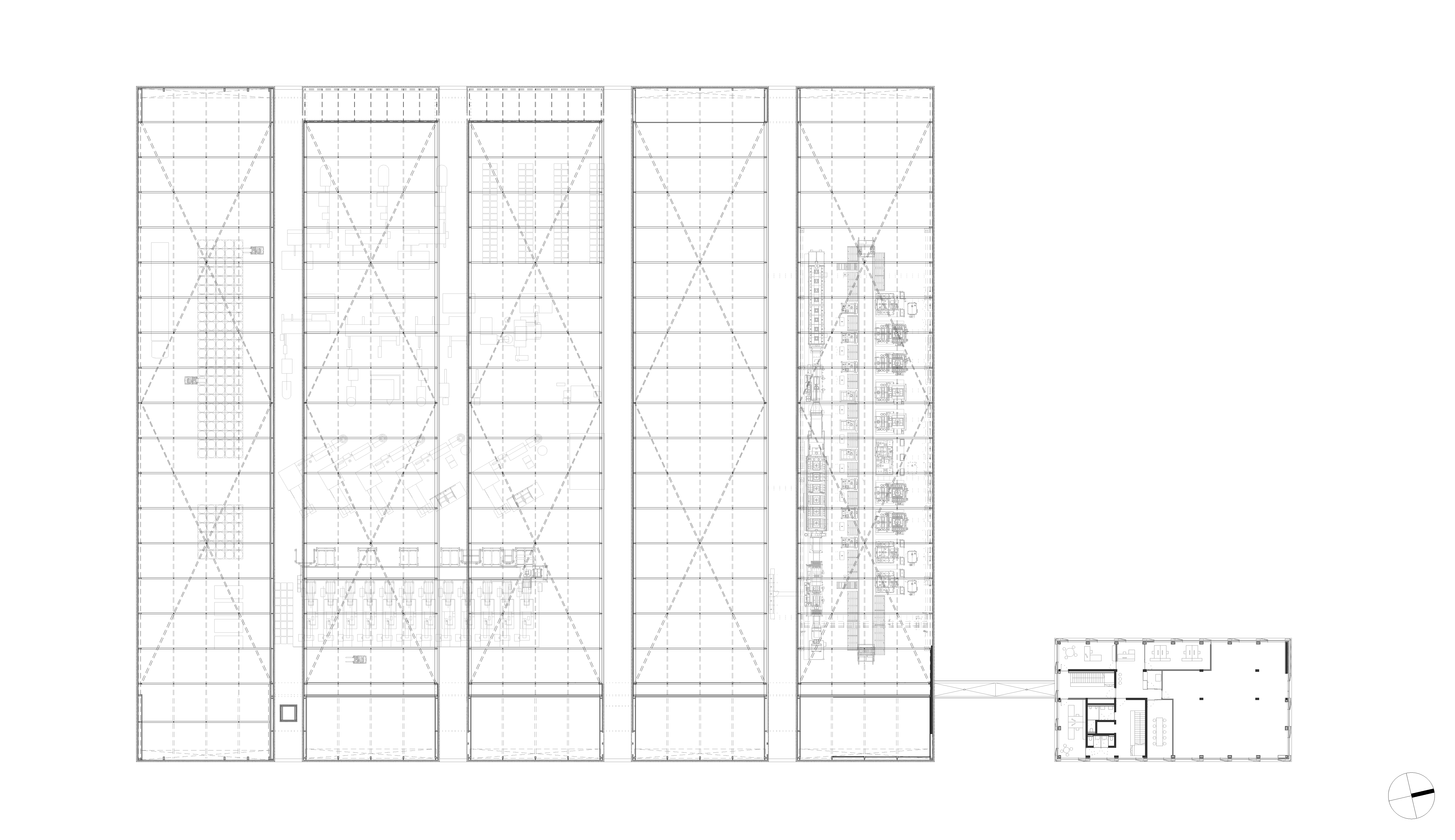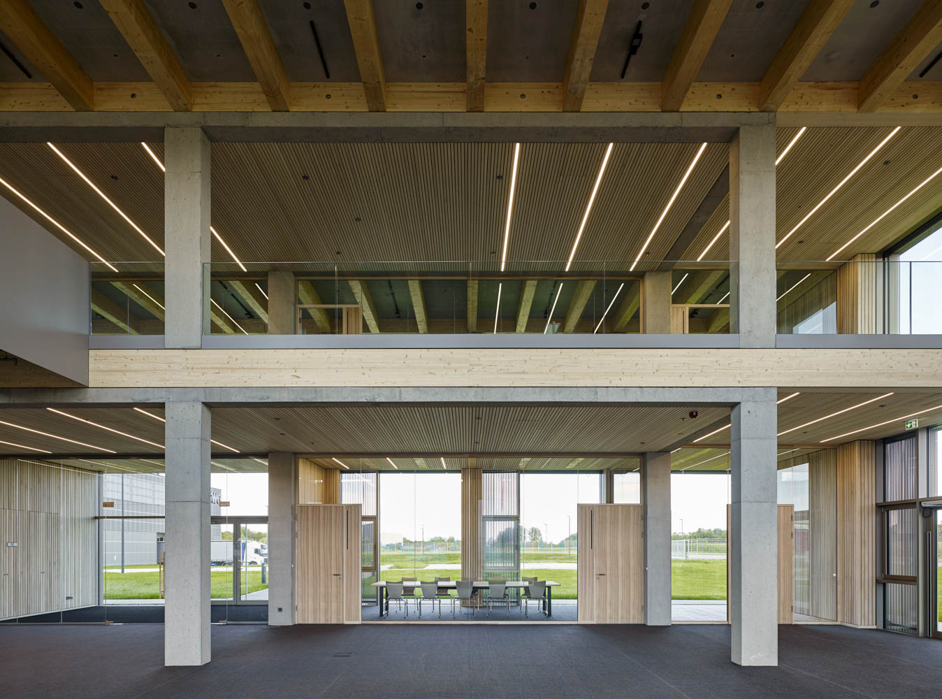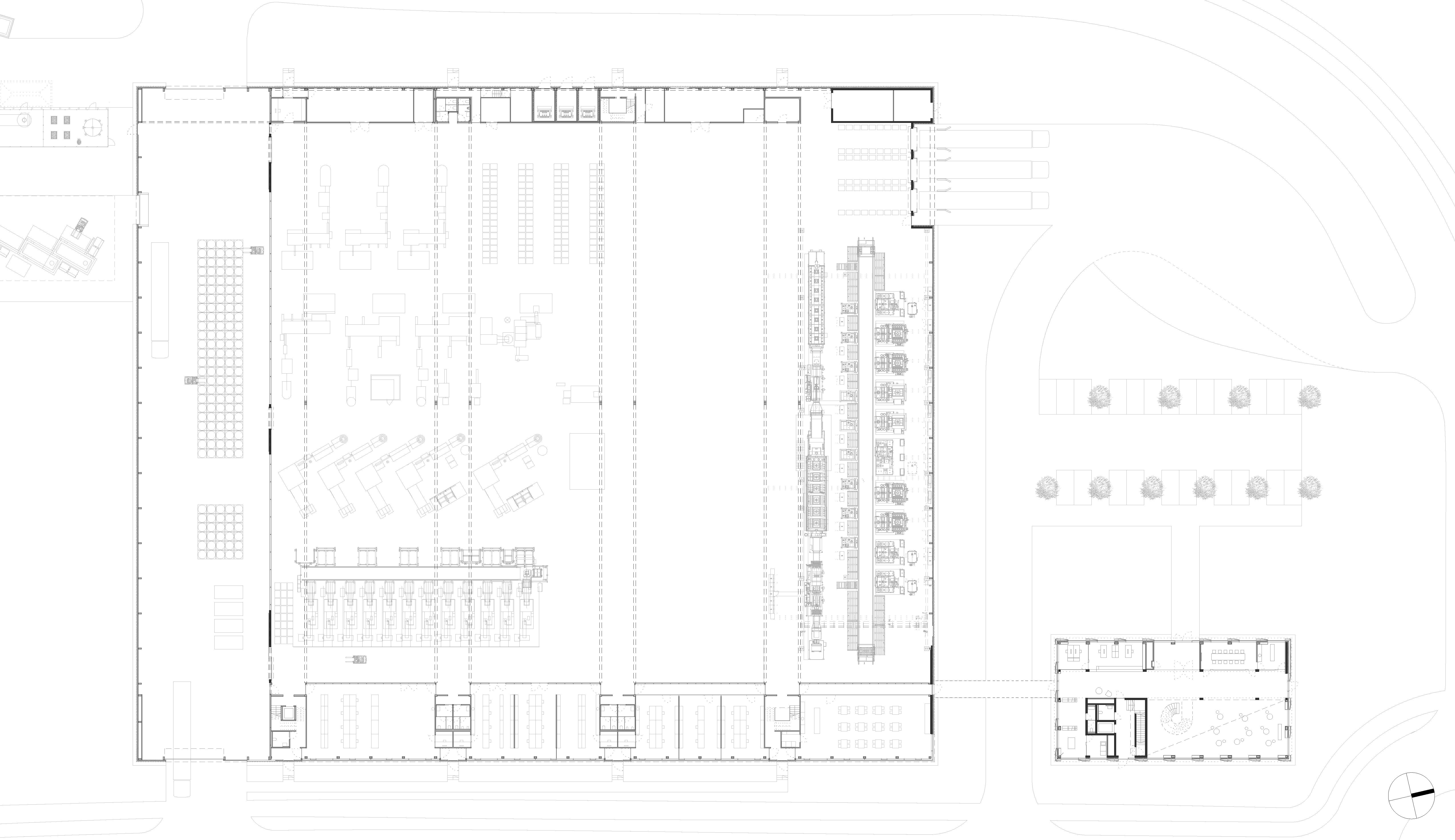 Schließlich wird ein Gebäudeensemble in unmittelbarer Nähe des Firmensitzes konzipiert. Die großflächige Fertigungshalle ist über eine Brücke mit einem dreigeschossigen Pavillon verbunden, der neben Büroräumlichkeiten und Sitzungszimmern auch einen ausgedehnten Empfangs- und Ausstellungsbereich für Besucher fasst. Hier können Interessierte die hauseigenen Produkte und ihre Anwendungen kennenlernen und am Anschauungsbeispiel der gebauten Struktur vor Ort studieren. So entsteht ein außergewöhnlich hoher Anspruch an die Qualität der Konstruktion und Ausführung des Industriebaues. Die Produktionsstätte weist enorme Dimensionen auf, um zahlreiche große Maschinen mit umfangreicher technischer Infrastruktur aufzunehmen. Sie erstreckt sich über eine Länge von 114 m und eine Breite von 96,5 m, die Höhe beträgt etwa 12 m. 70% der Grundfläche nimmt der Fertigungs- und Logistikbereich ein, während für Werkzeuge und Werkzeugbau 20% vorgesehen sind sowie weitere 10% für die Lagerung des Rohmaterials.