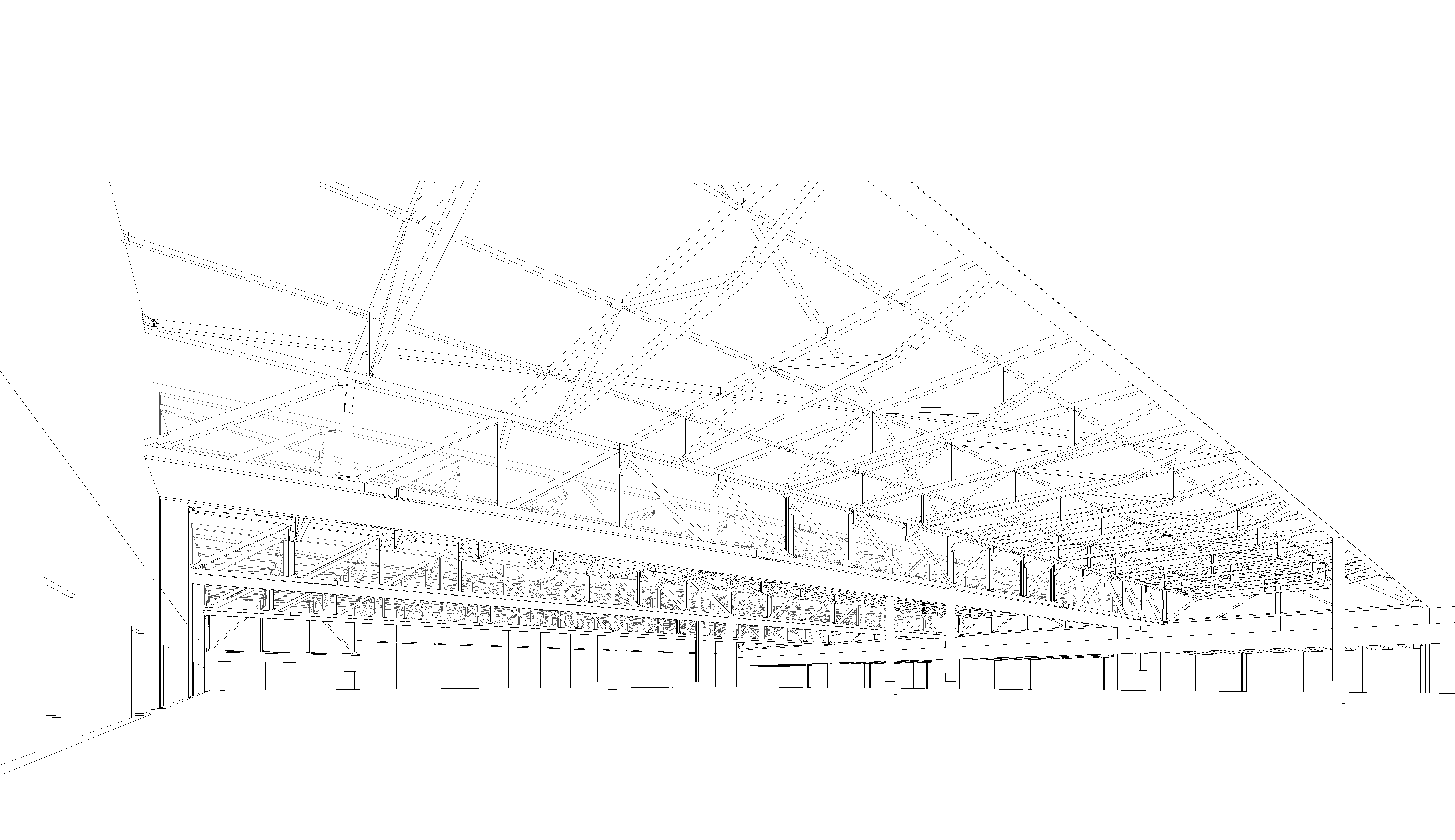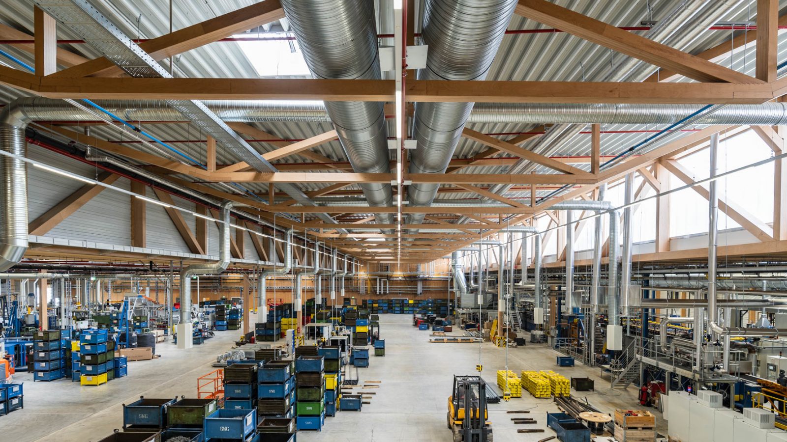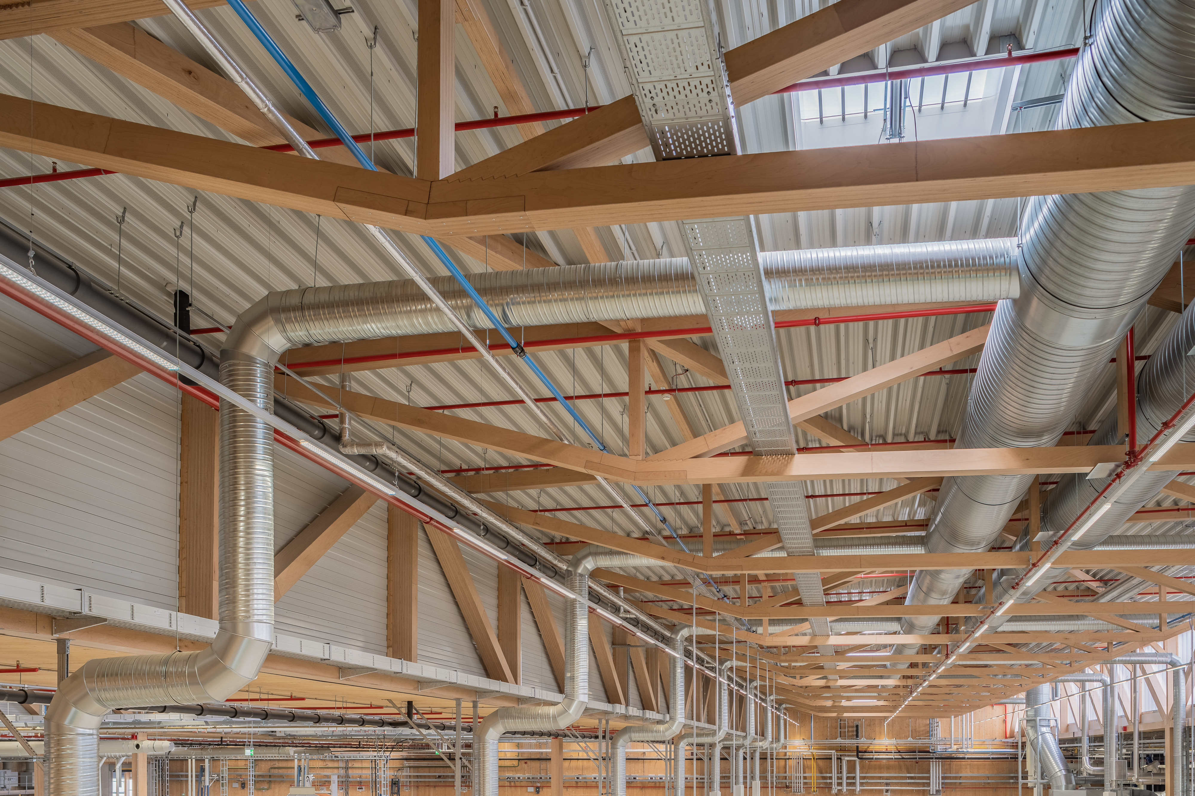 Das Bauwerk ist fünfschiffig angelegt und wird von einer kammartig geformten Dachstruktur überspannt. Verglaste, etwa 5 m breite Vertiefungen zwischen den einzelnen Abschnitten funktionieren wie umgekehrte Sheds und sorgen für eine großzügige Belichtung der Flächen mit Tageslicht. Im südlichen Hallenschiff ist ein Drahtlager eingerichtet, weshalb der Produktionsbereich durch eine Brandwand abgetrennt werden muss. Im Osten und Westen fassen zwei schmale räumliche Spangen das Volumen, sie enthalten Infrastruktureinrichtungen, Werkstätten und Bereiche für die Haustechnik. Um eine hohe Flexibilität der Herstellungsabläufe zu gewährleisten, wird die Zahl der Stützen in der Halle auf ein Minimum reduziert. So besteht das Tragwerk aus acht parallel in Längsrichtung laufenden, rund 82 m langen und 3,8 m hohen Haupt-Fachwerkbindern und einer Reihe von 18,30 m langen Neben-Fachwerkbindern, die quer dazwischen eingehängt sind. Da die Hauptbinder auf jeweils nur einer Zwischenstütze aufliegen, funktionieren sie statisch als Durchlaufträger mit Feldweiten von 40 m bzw. 42 m.