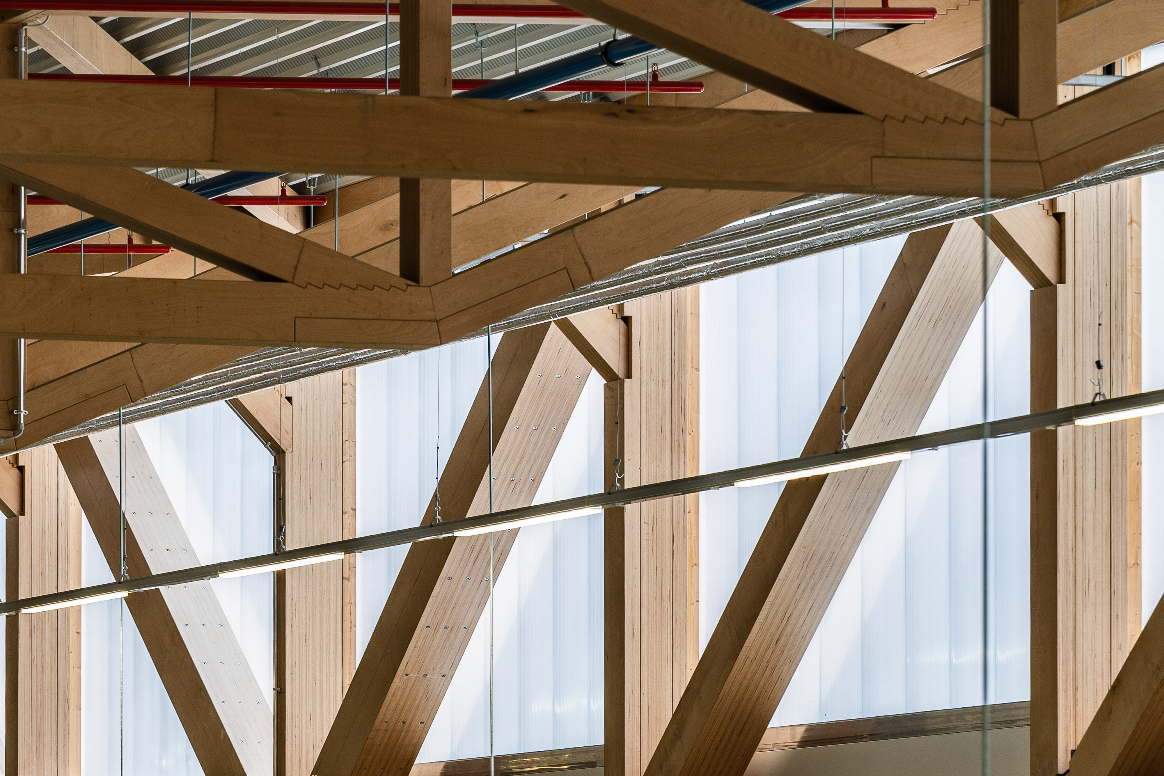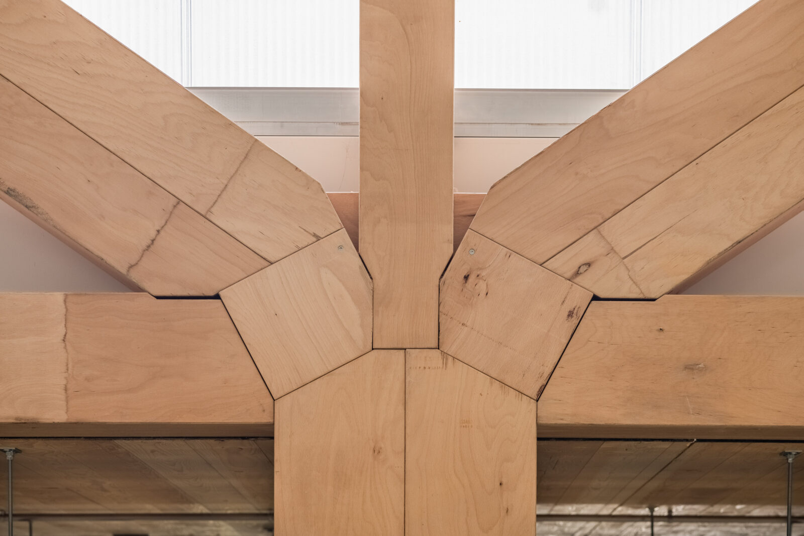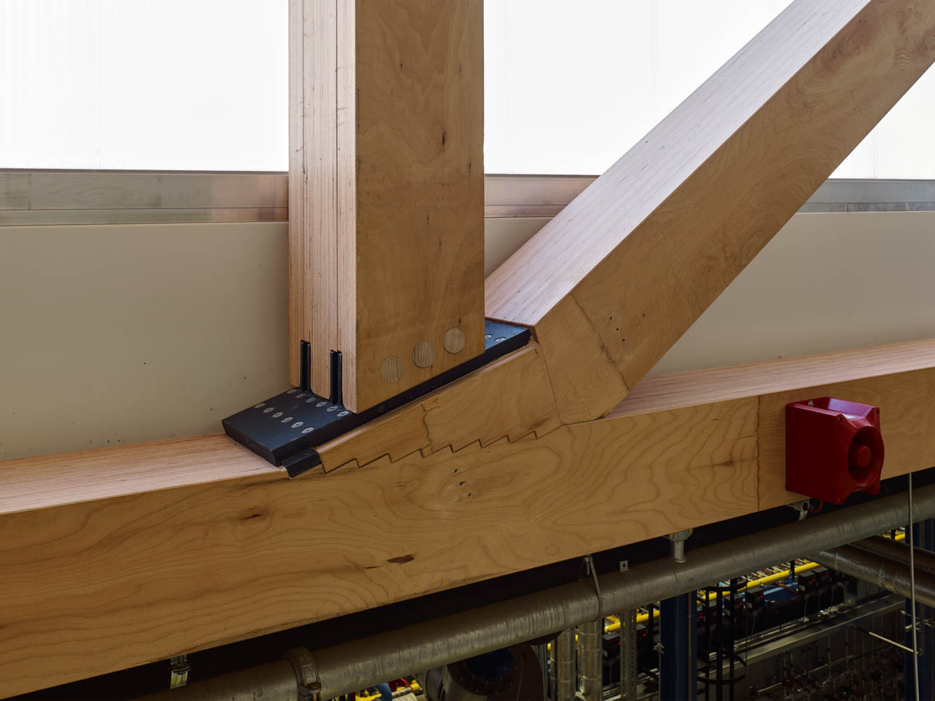 Doch auch technische und ökonomische Argumente sprechen für eine Ausführung in Holz. Aus Stahl oder Spannbeton gefertigt, wären die einzelnen Bauelemente zu groß, zu schwer und zum Teil kaum herstellbar gewesen und auch die erforderlichen Werte für den Brandschutz hätten sich als problematisch erwiesen. Zudem sind durch die Wahl eines leichteren Baustoffes keine aufwändigen Fundierungen auf dem nur bedingt tragfähigen Boden erforderlich, wodurch die Kosten für die Gründungsarbeiten überschaubar bleiben. Da aber auch Nadelholz aufgrund der enormen erforderlichen Querschnitte nicht in Betracht kommt, beginnen sich die Architekten und das hauseigene Ingenieurbüro SWG Engineering mit Alternativen auseinanderzusetzen. Ihr Ziel ist es, eine möglichst filigrane Fachwerkstruktur zu entwickeln, deren Stäbe und Komponenten miteinander durch effiziente Knoten verbunden werden können. So fällt ihre Wahl schließlich auf den Werkstoff BauBuche GL75, der in einem hochtechnologisierten Verfahren in Deutschland hergestellt wird. Dabei handelt es sich um einen Furnierschichtträger aus regionalem Hartholz, bei welchem 4 mm starke Lamellen faserparallel verklebt werden und dadurch eine außergewöhnlich hohe Festigkeit und Steifigkeit erzielen. Die Biege-, Druck- und Zugfestigkeit des Materials liegt im Vergleich zu herkömmlichem Brettschichtholz etwa bei einem dreifachen Wert. Durch die hohe Querdruck- und Schubfestigkeit lassen sich zudem sehr effektive zimmermannsmässige Anschlüsse ausführen. Zudem begünstigt die hohe Rohdichte des Materials Anschlüsse mit stiftförmigen Verbindungsmitteln, besonders Schrauben erreichen bei ihrer Anwendung in BauBuche bereits in geringen Einschraublängen ihre volle Tragfähigkeit. Durch präzise aber auch couragierte Planungsarbeit in Verbindung mit einem innovativen Werkstoff ist es gelungen, ein weitspannendes Dachtragwerk in Holz umzusetzen, dessen Konstruktionselemente außergewöhnlich schlank, filigran und leicht sind. Aufgrund kompakter und leistungsfähiger Anschlüsse können bis zu 100% der Querschnitte genutzt werden, wodurch sich die benötigte Holzmenge ressourcenschonend auf ein Minimum reduzieren lässt. Das weltweit größte Dachtragwerk aus BauBuche zeigt, in welchen Größenordnungen der zeitgenössische Ingenieurholzbau inzwischen zu überzeugen vermag. Noch nie konnte in diesen Dimension gebaut werden.