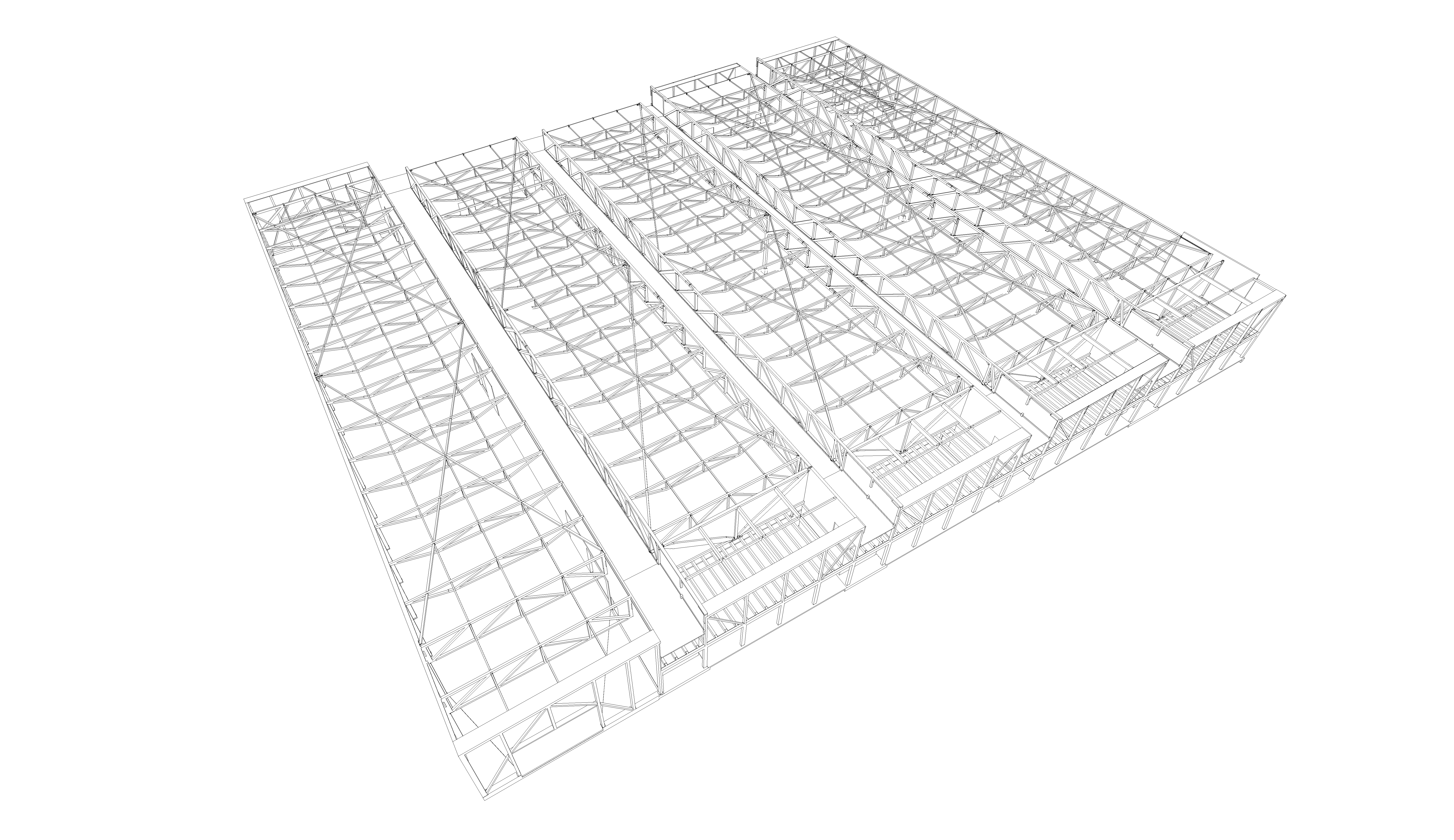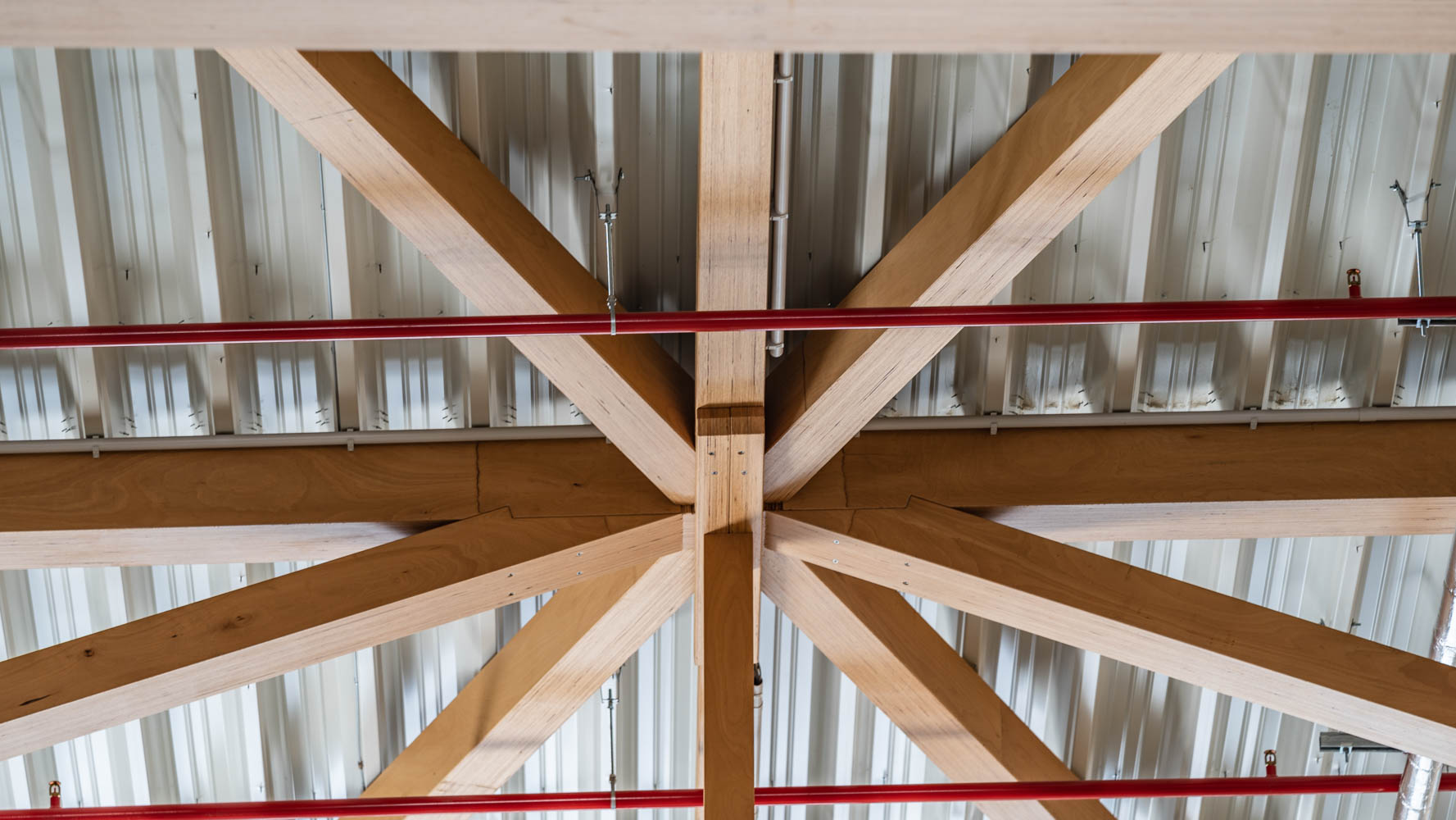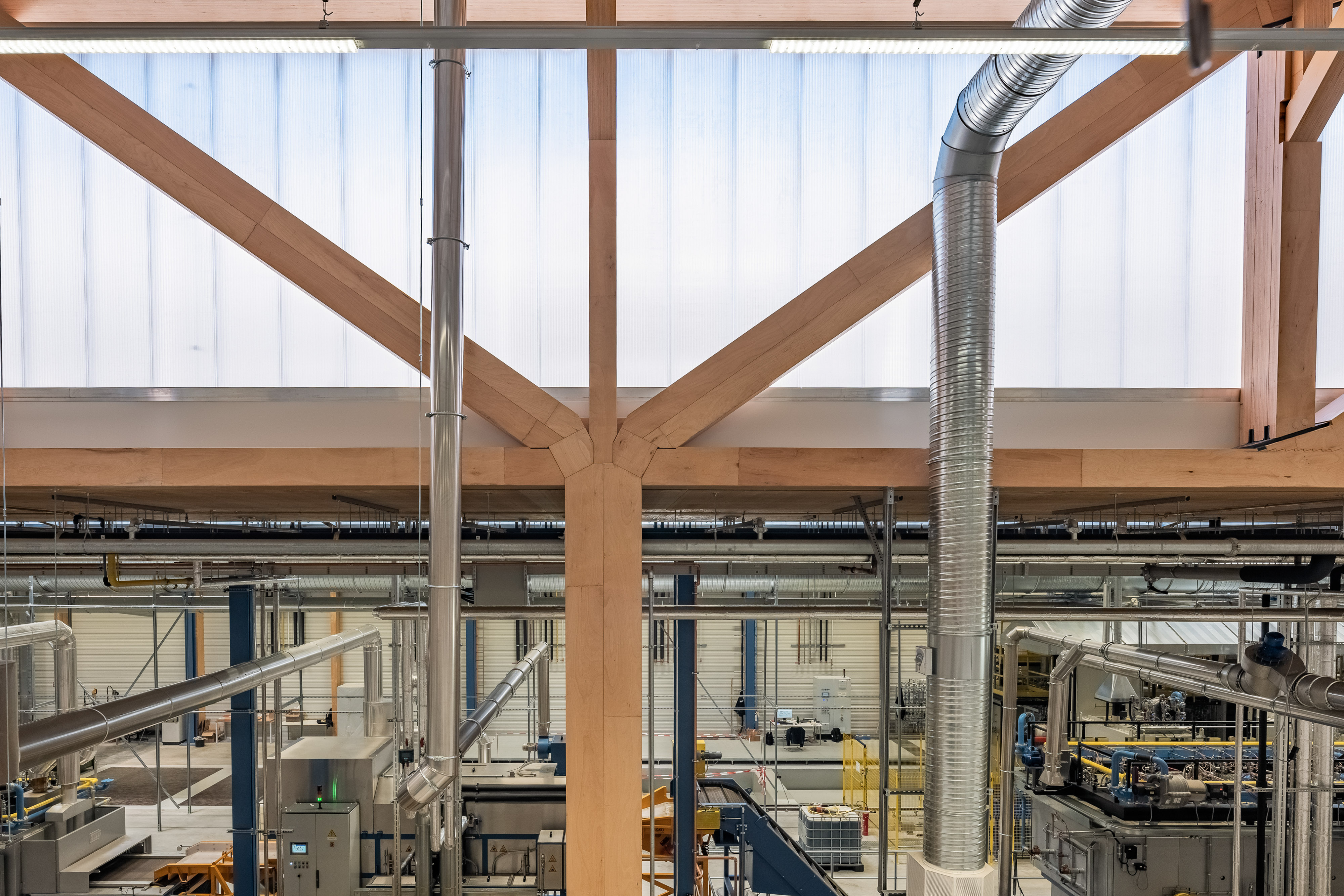 Doch auch technische und ökonomische Argumente sprechen für eine Ausführung in Holz. Aus Stahl oder Spannbeton gefertigt, wären die einzelnen Bauelemente zu groß, zu schwer und zum Teil kaum herstellbar gewesen und auch die erforderlichen Werte für den Brandschutz hätten sich als problematisch erwiesen. Zudem sind durch die Wahl eines leichteren Baustoffes keine aufwändigen Fundierungen auf dem nur bedingt tragfähigen Boden erforderlich, wodurch die Kosten für die Gründungsarbeiten überschaubar bleiben. Da aber auch Nadelholz aufgrund der enormen erforderlichen Querschnitte nicht in Betracht kommt, beginnen sich die Architekten und das hauseigene Ingenieurbüro SWG Engineering mit Alternativen auseinanderzusetzen. Ihr Ziel ist es, eine möglichst filigrane Fachwerkstruktur zu entwickeln, deren Stäbe und Komponenten miteinander durch effiziente Knoten verbunden werden können. So fällt ihre Wahl schließlich auf den Werkstoff BauBuche GL75, der in einem hochtechnologisierten Verfahren in Deutschland hergestellt wird. Dabei handelt es sich um einen Furnierschichtträger aus regionalem Hartholz, bei welchem 4 mm starke Lamellen faserparallel verklebt werden und dadurch eine außergewöhnlich hohe Festigkeit und Steifigkeit erzielen. Die Biege-, Druck- und Zugfestigkeit des Materials liegt im Vergleich zu herkömmlichem Brettschichtholz etwa bei einem dreifachen Wert. Durch die hohe Querdruck- und Schubfestigkeit lassen sich zudem sehr effektive zimmermannsmässige Anschlüsse ausführen. Zudem begünstigt die hohe Rohdichte des Materials Anschlüsse mit stiftförmigen Verbindungsmitteln, besonders Schrauben erreichen bei ihrer Anwendung in BauBuche bereits in geringen Einschraublängen ihre volle Tragfähigkeit. Durch präzise aber auch couragierte Planungsarbeit in Verbindung mit einem innovativen Werkstoff ist es gelungen, ein weitspannendes Dachtragwerk in Holz umzusetzen, dessen Konstruktionselemente außergewöhnlich schlank, filigran und leicht sind. Aufgrund kompakter und leistungsfähiger Anschlüsse können bis zu 100% der Querschnitte genutzt werden, wodurch sich die benötigte Holzmenge ressourcenschonend auf ein Minimum reduzieren lässt. Das weltweit größte Dachtragwerk aus BauBuche zeigt, in welchen Größenordnungen der zeitgenössische Ingenieurholzbau inzwischen zu überzeugen vermag. Noch nie konnte in diesen Dimension gebaut werden.