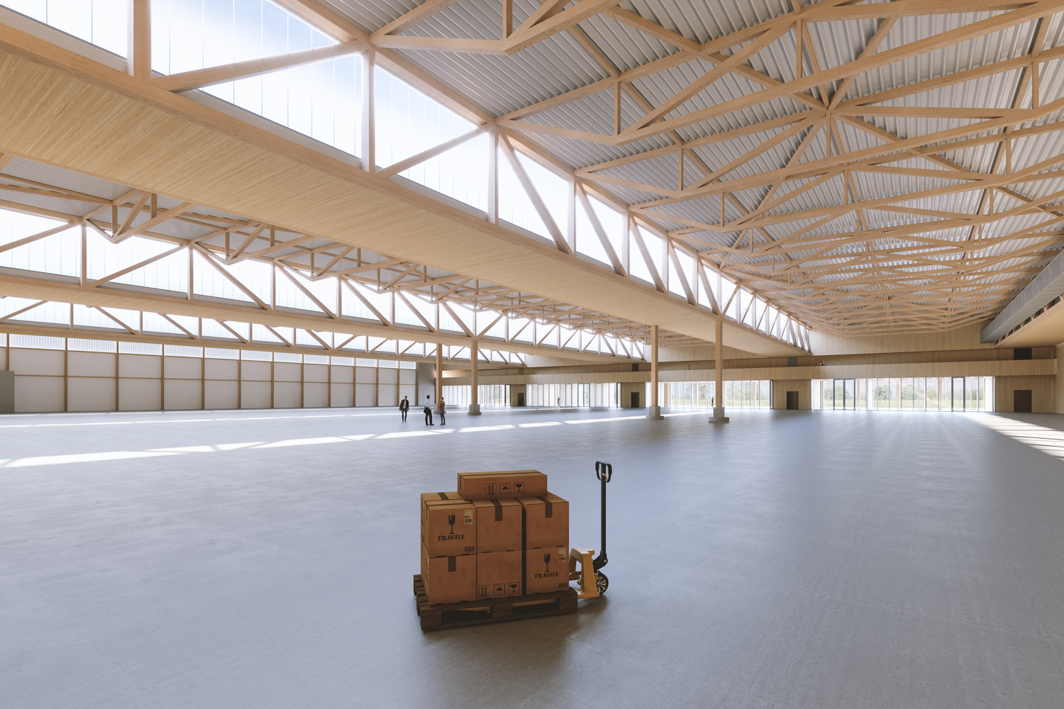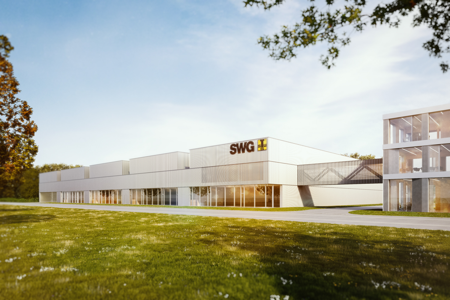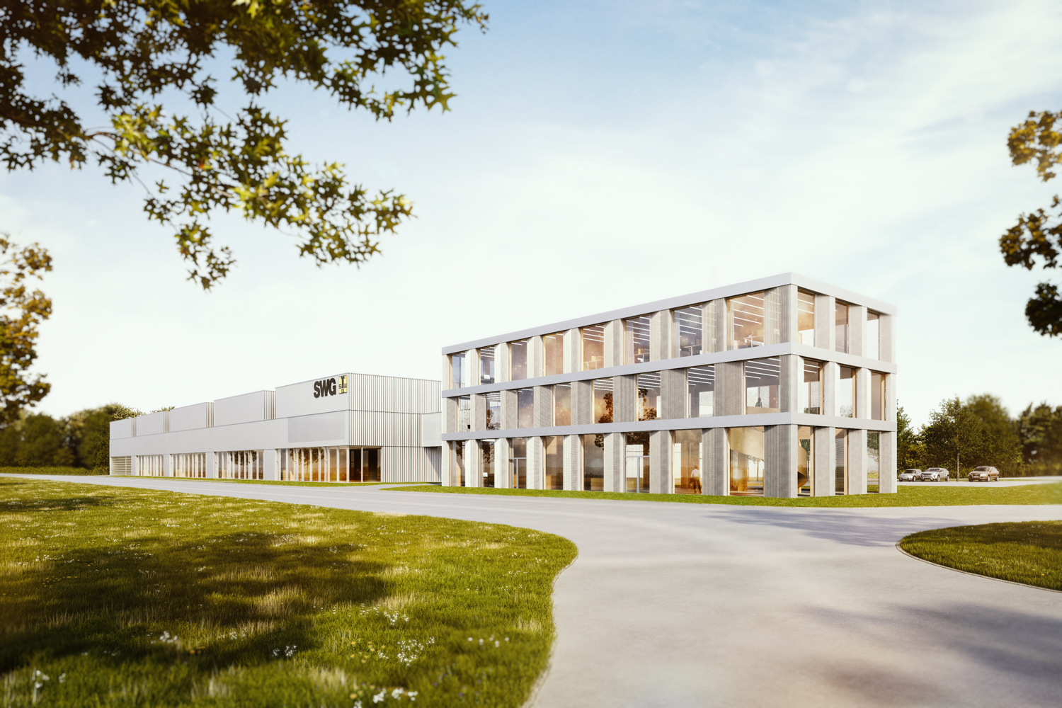 Auch bei der Wahl der Baumaterialien spielt die Corporate Identity eine wichtige Rolle. Denn das Tätigkeitsfeld der SWG soll durch den Einsatz der gefertigten Schrauben im Holz- und Metallbau widergespiegelt werden. So entwickeln die Architekten das Konzept, die Tragstruktur der Halle in Holz zu konstruieren, während für die Gestaltung der Fassaden Metallelemente zum Einsatz kommen. Durch die bewusste Entscheidung für den nachwachsenden Baustoff wird auch ein Signal für Nachhaltigkeit und Klimaschutz gesetzt. Denn jeder Kubikmeter verbautes Holz bindet langfristig den Kohlenstoff von 1 Tonne CO2 aus der Atmosphäre. Außerdem werden andere Materialien ersetzt, welche zu ihrer Herstellung wieder CO2 freisetzen würden. Da für das Projekt insgesamt rund 1.800 m³ Holz verwendet werden, bedeutet dies eine CO2-Einsparung von etwa 3.600 Tonnen gegenüber konventionellen Bauweisen, bezogen auf eine Nutzungsdauer von 50 Jahren.