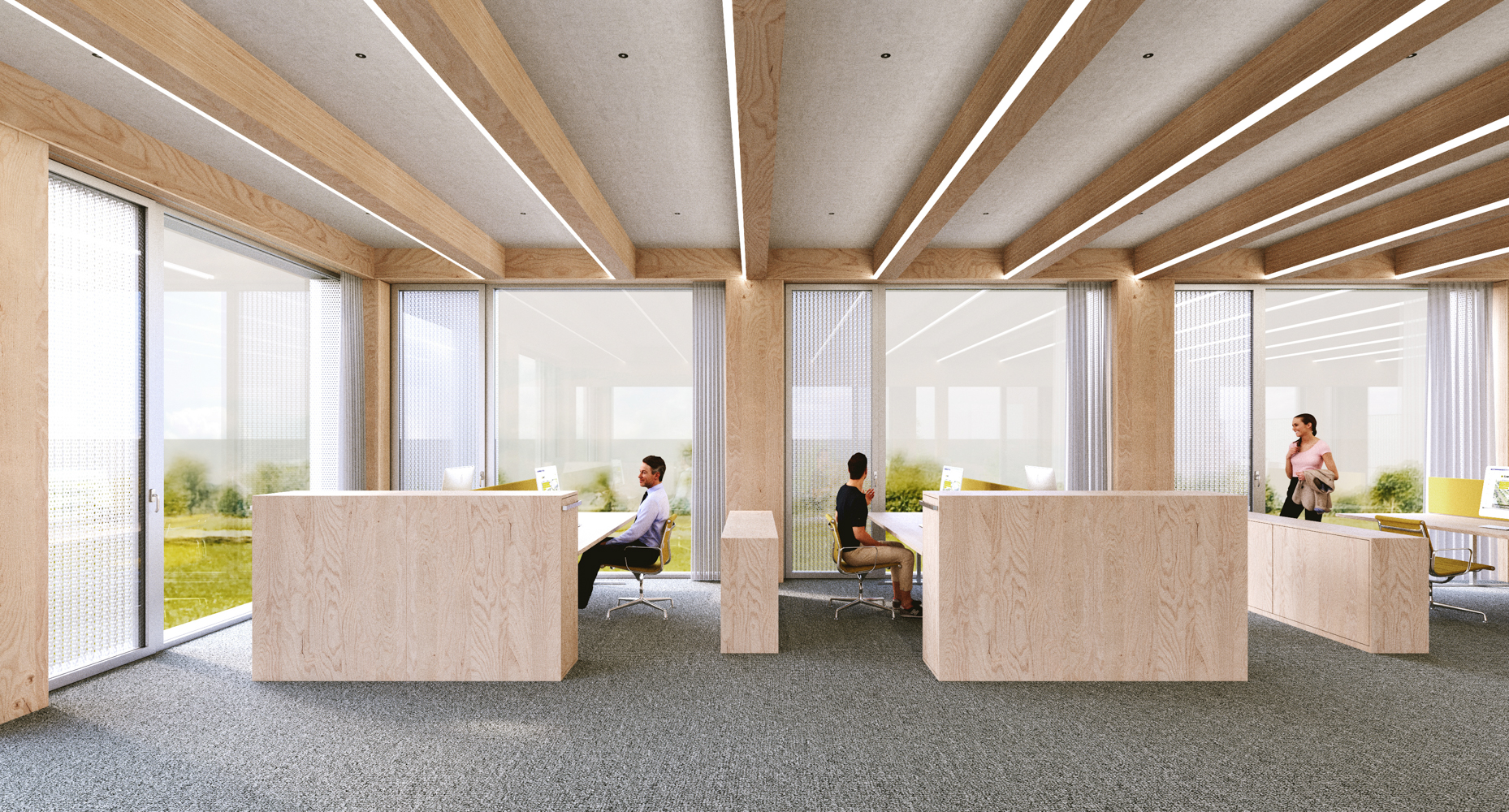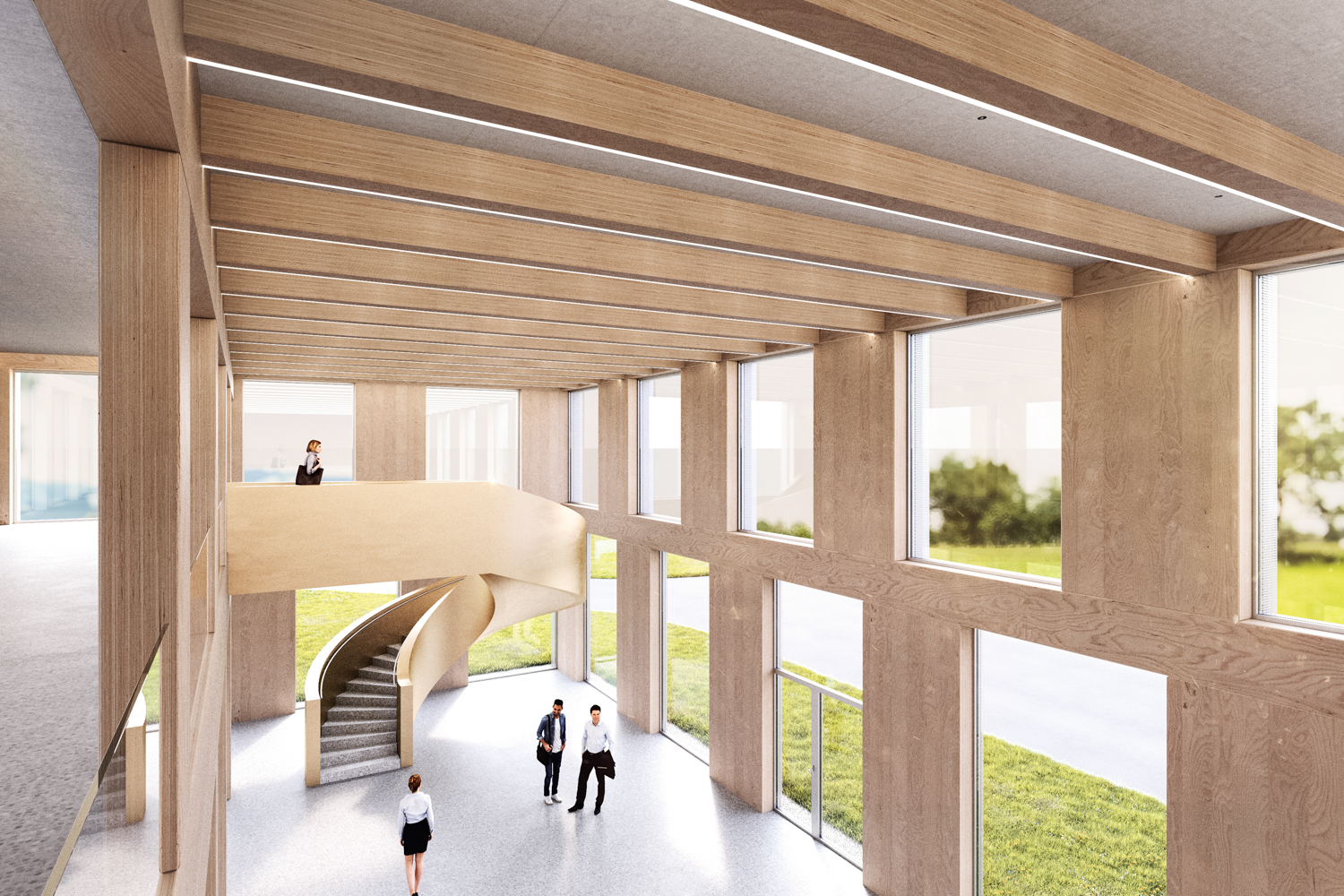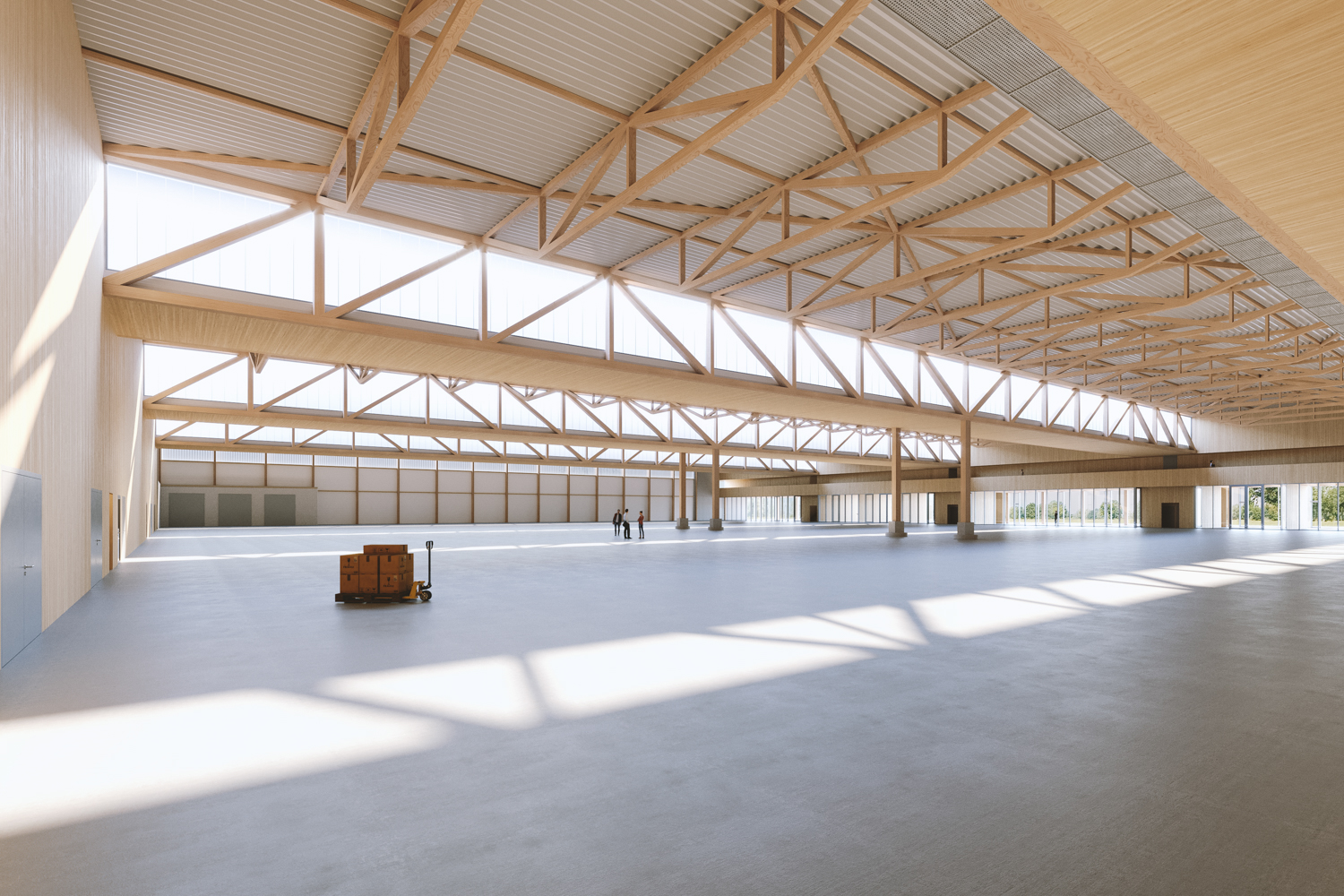 Auch bei der Wahl der Baumaterialien spielt die Corporate Identity eine wichtige Rolle. Denn das Tätigkeitsfeld der SWG soll durch den Einsatz der gefertigten Schrauben im Holz- und Metallbau widergespiegelt werden. So entwickeln die Architekten das Konzept, die Tragstruktur der Halle in Holz zu konstruieren, während für die Gestaltung der Fassaden Metallelemente zum Einsatz kommen. Durch die bewusste Entscheidung für den nachwachsenden Baustoff wird auch ein Signal für Nachhaltigkeit und Klimaschutz gesetzt. Denn jeder Kubikmeter verbautes Holz bindet langfristig den Kohlenstoff von 1 Tonne CO2 aus der Atmosphäre. Außerdem werden andere Materialien ersetzt, welche zu ihrer Herstellung wieder CO2 freisetzen würden. Da für das Projekt insgesamt rund 1.800 m³ Holz verwendet werden, bedeutet dies eine CO2-Einsparung von etwa 3.600 Tonnen gegenüber konventionellen Bauweisen, bezogen auf eine Nutzungsdauer von 50 Jahren.