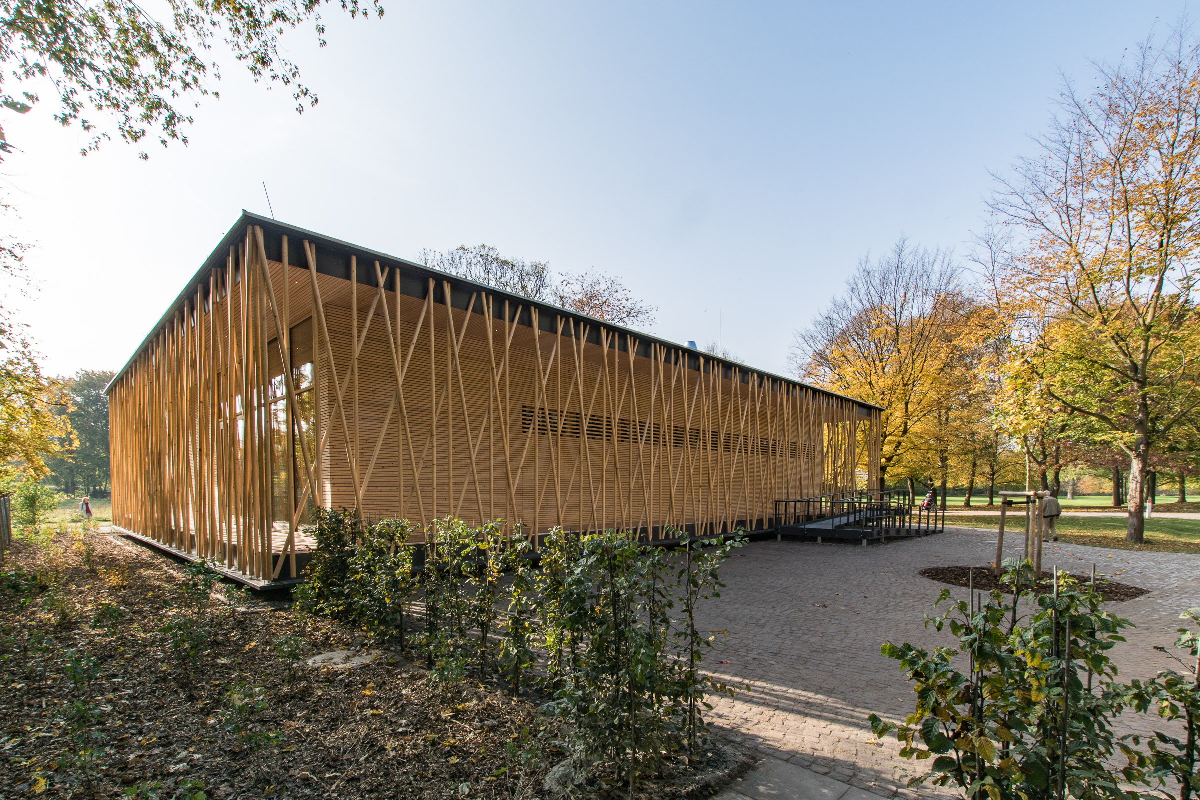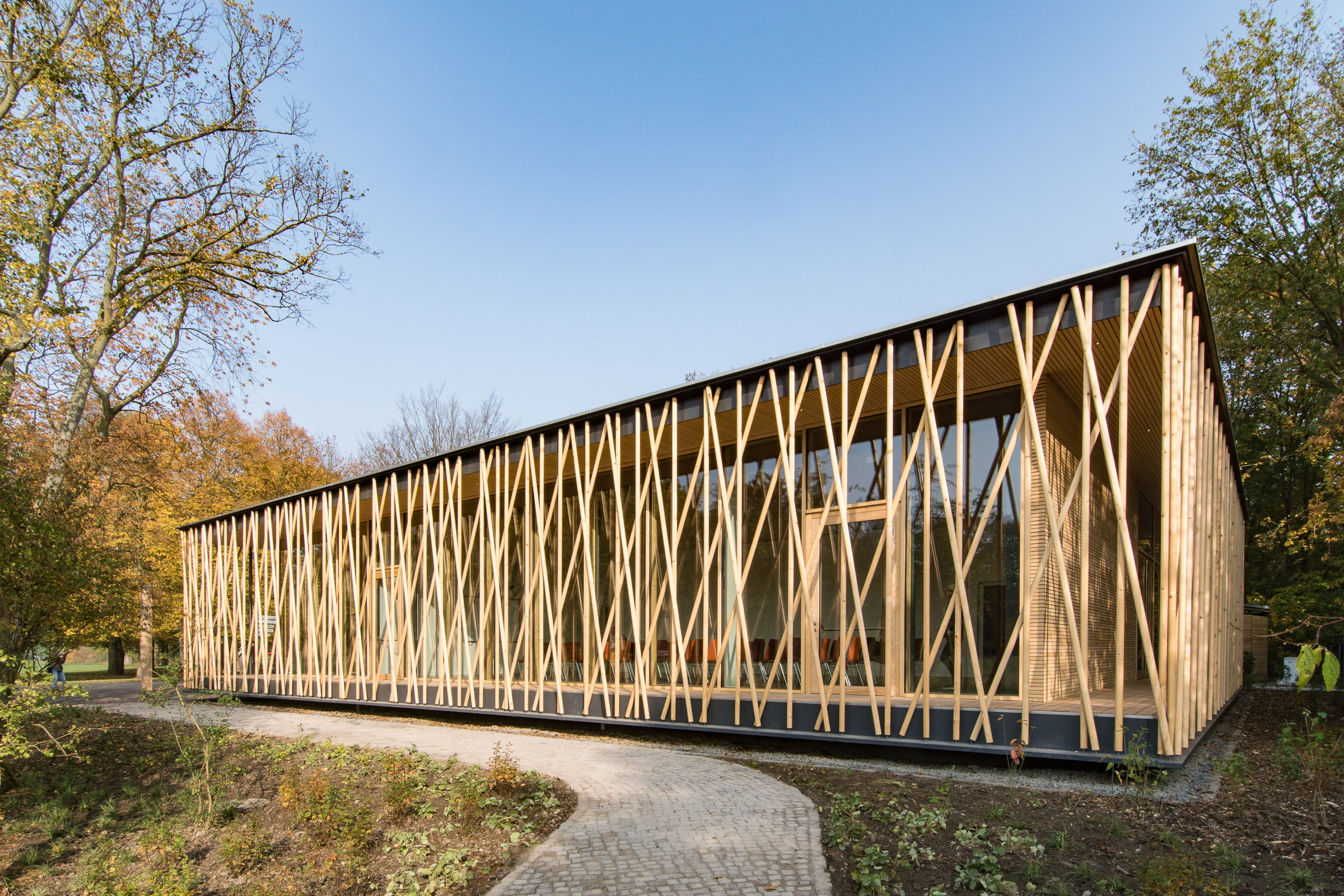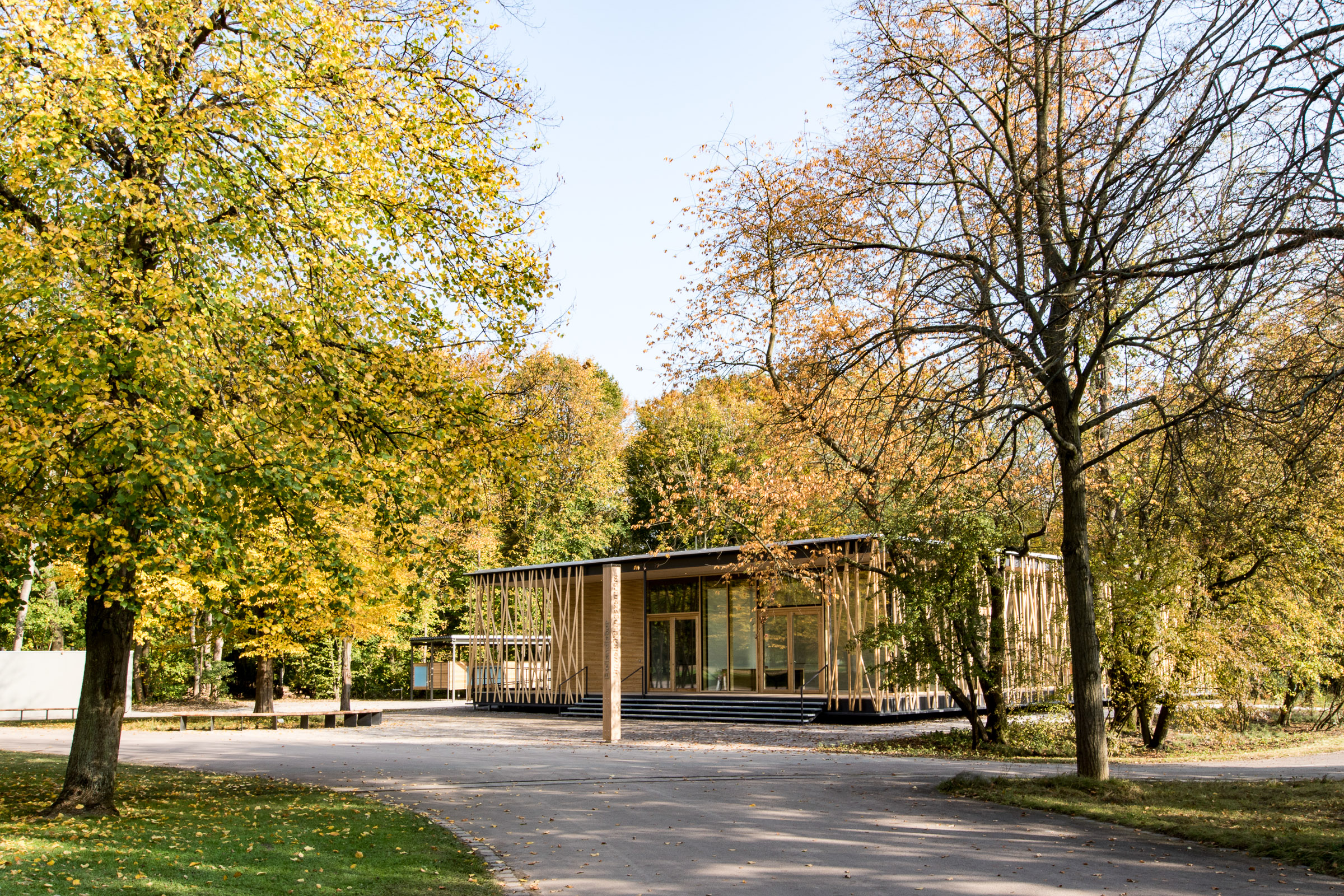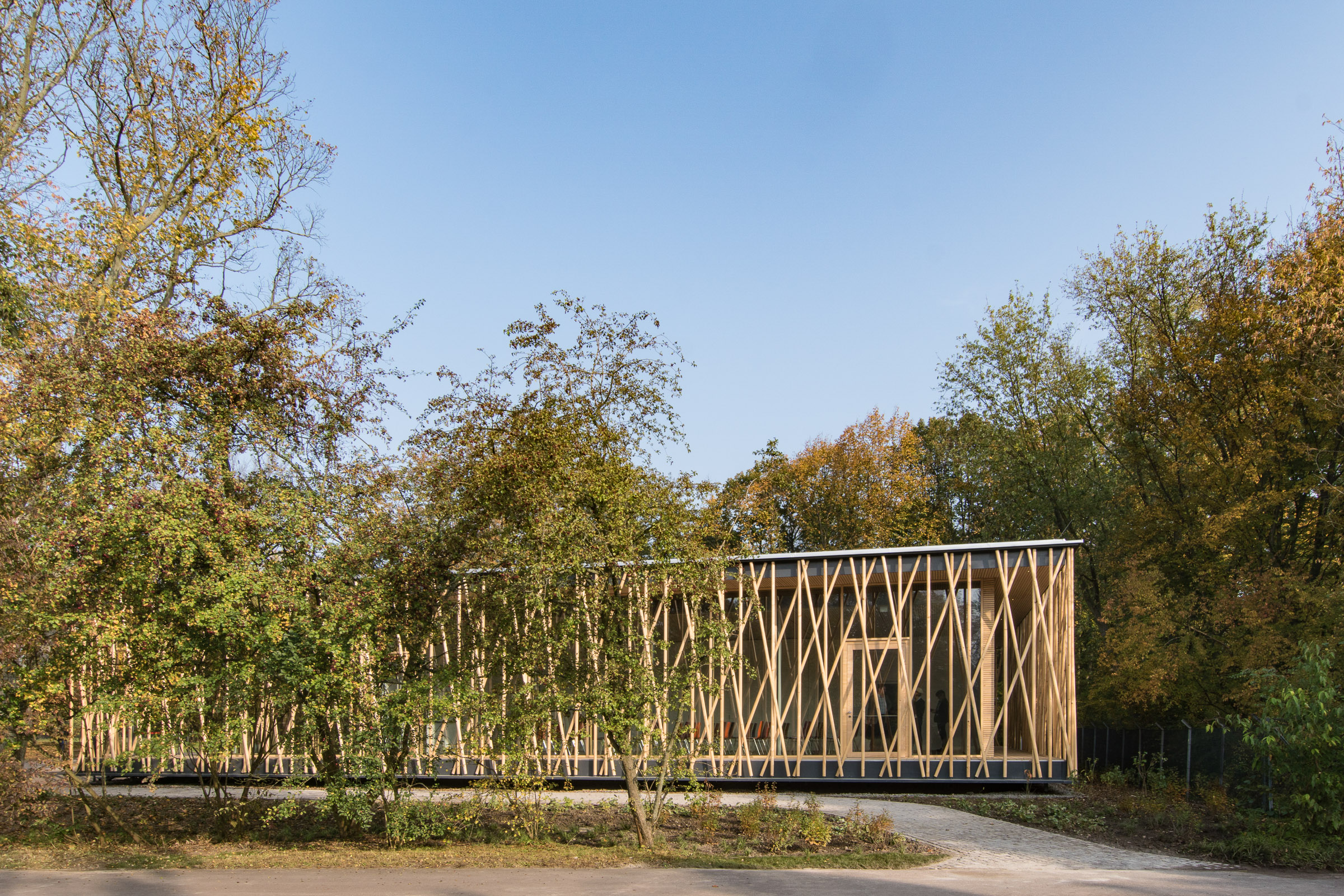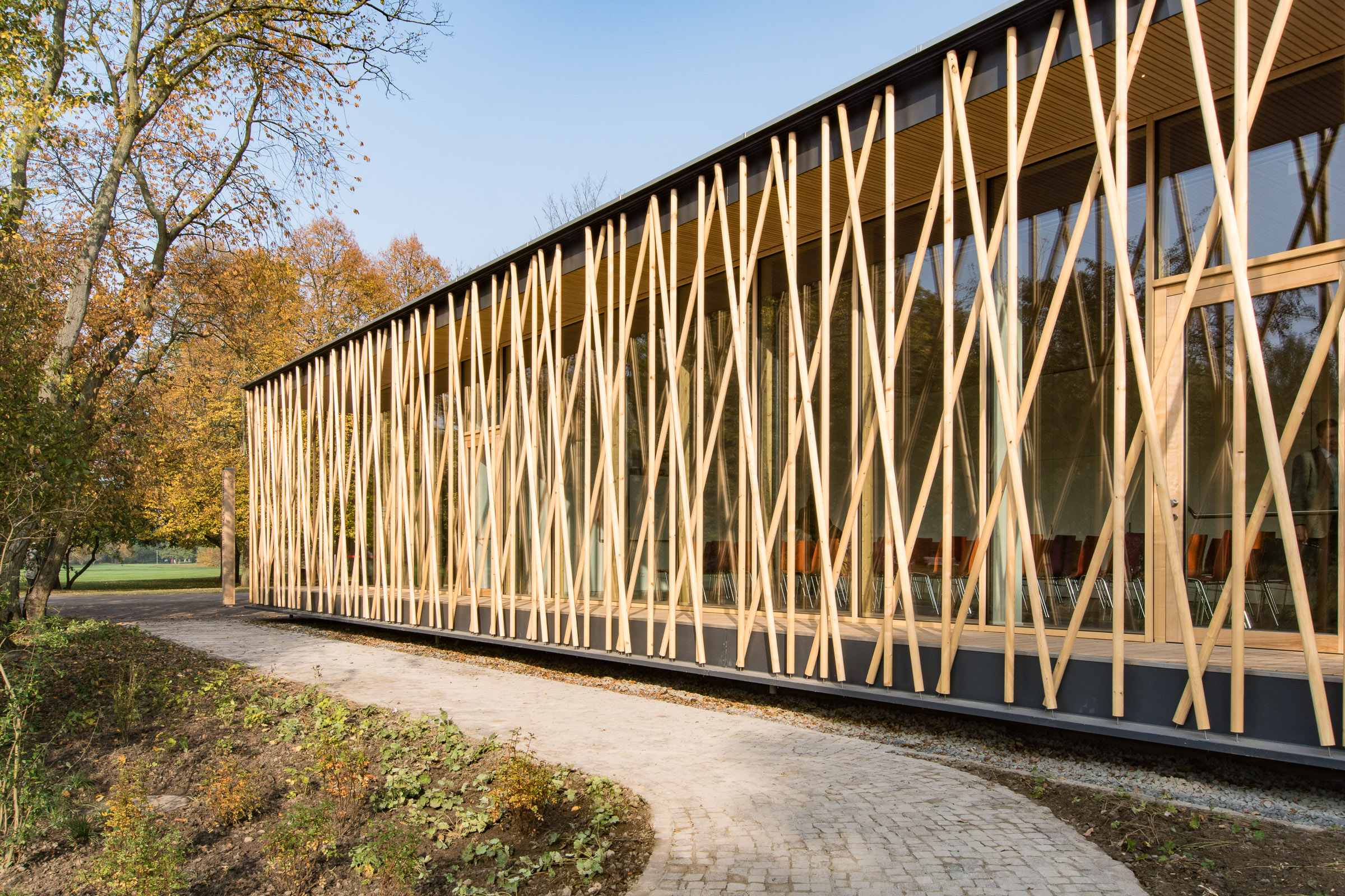 Das eingeschossige Bauwerk wurde als schwebender Pavillon im alten Baumbestand konzipiert. Während sich der nördliche Teil des Gebäudes als geschlossener Büro- und Infrastrukturblock nach innen orientiert, öffnen sich der Ausstellungsbereich und ein teilbarer Seminarraum durch bodentiefen Glasfenster nach Südwesten zum Park. Dieser Kernstruktur ist eine umlaufende Raumschicht vorgelagert, die durch ein filigran geflochtenes Band aus Rundhölzern gefasst wird, um Licht und Blicke zu filtern.