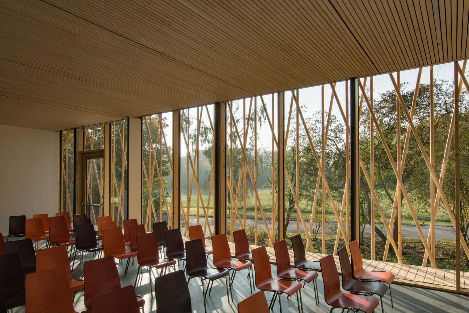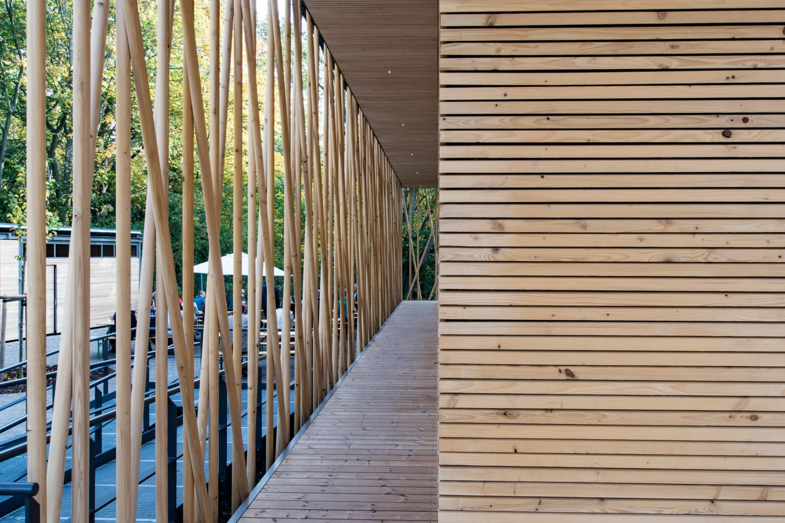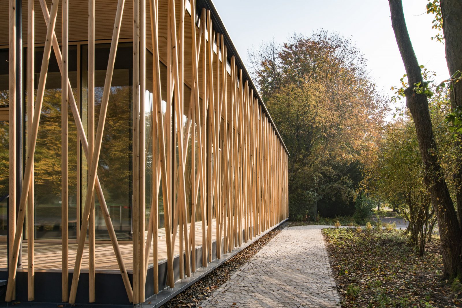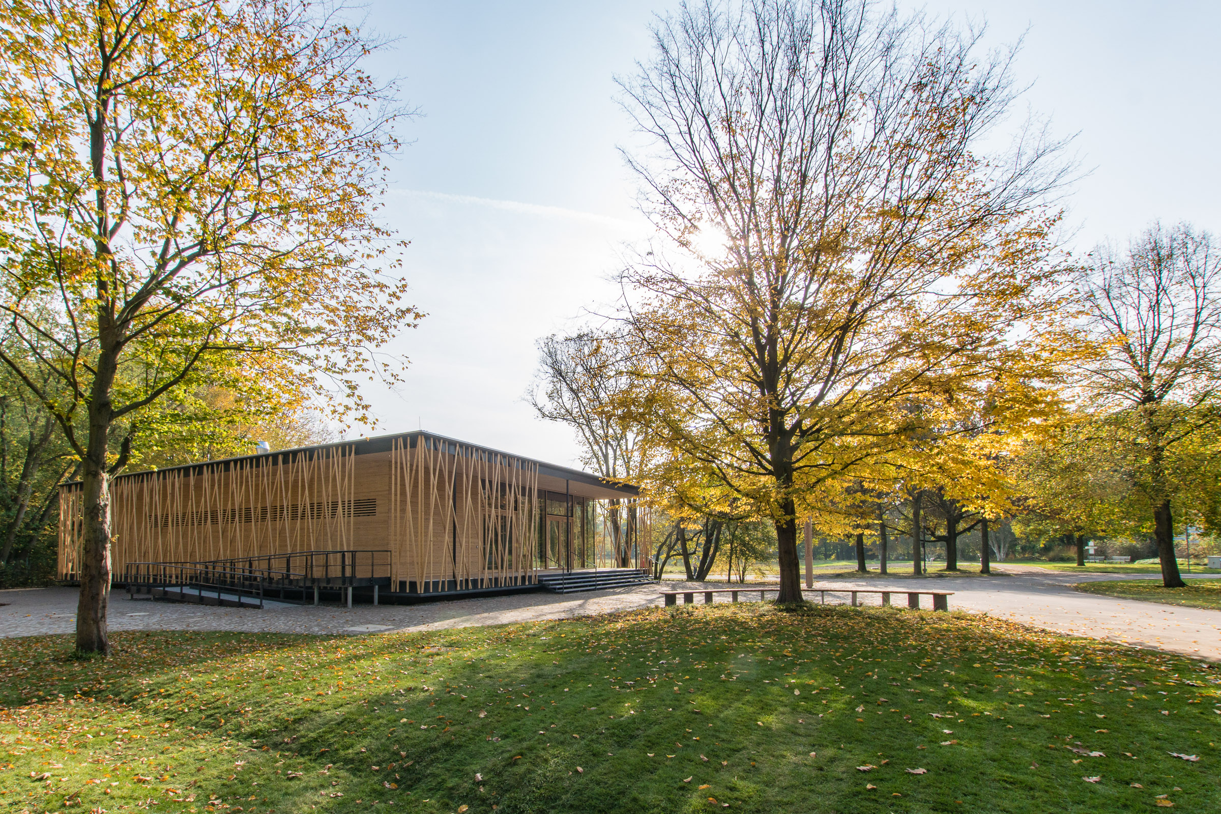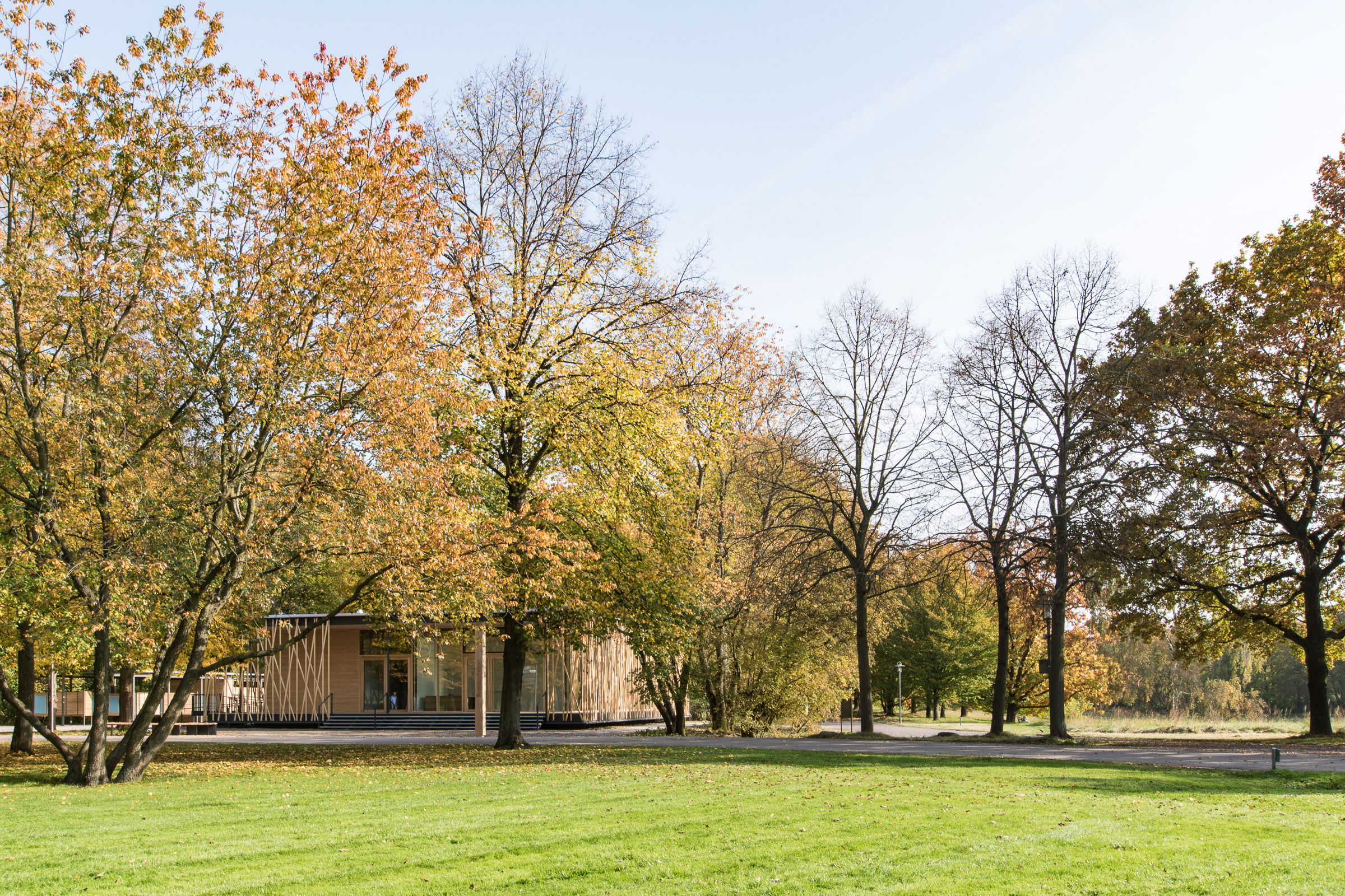 Das eingeschossige Bauwerk wurde als schwebender Pavillon im alten Baumbestand konzipiert. Während sich der nördliche Teil des Gebäudes als geschlossener Büro- und Infrastrukturblock nach innen orientiert, öffnen sich der Ausstellungsbereich und ein teilbarer Seminarraum durch bodentiefen Glasfenster nach Südwesten zum Park. Dieser Kernstruktur ist eine umlaufende Raumschicht vorgelagert, die durch ein filigran geflochtenes Band aus Rundhölzern gefasst wird, um Licht und Blicke zu filtern.
