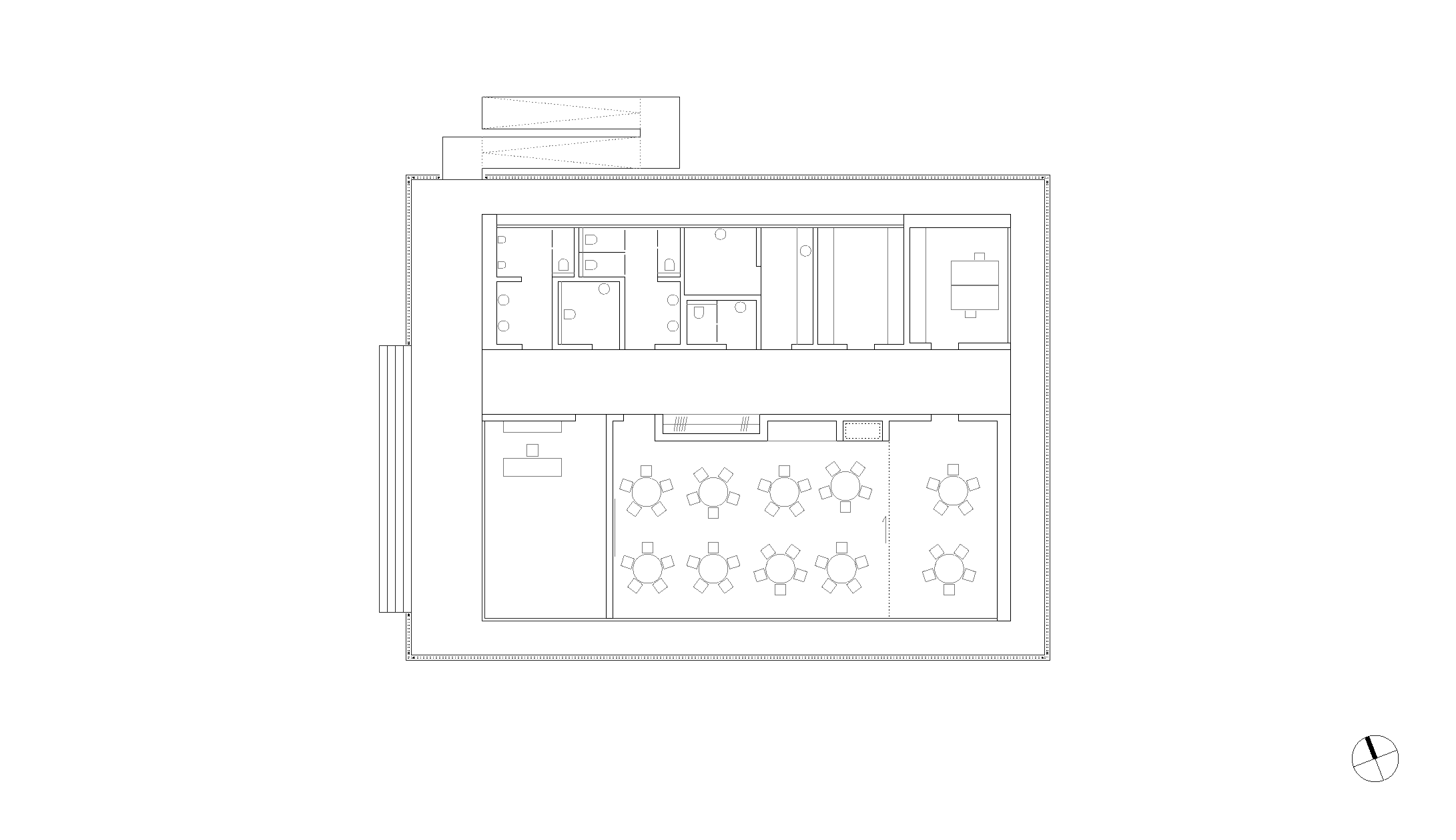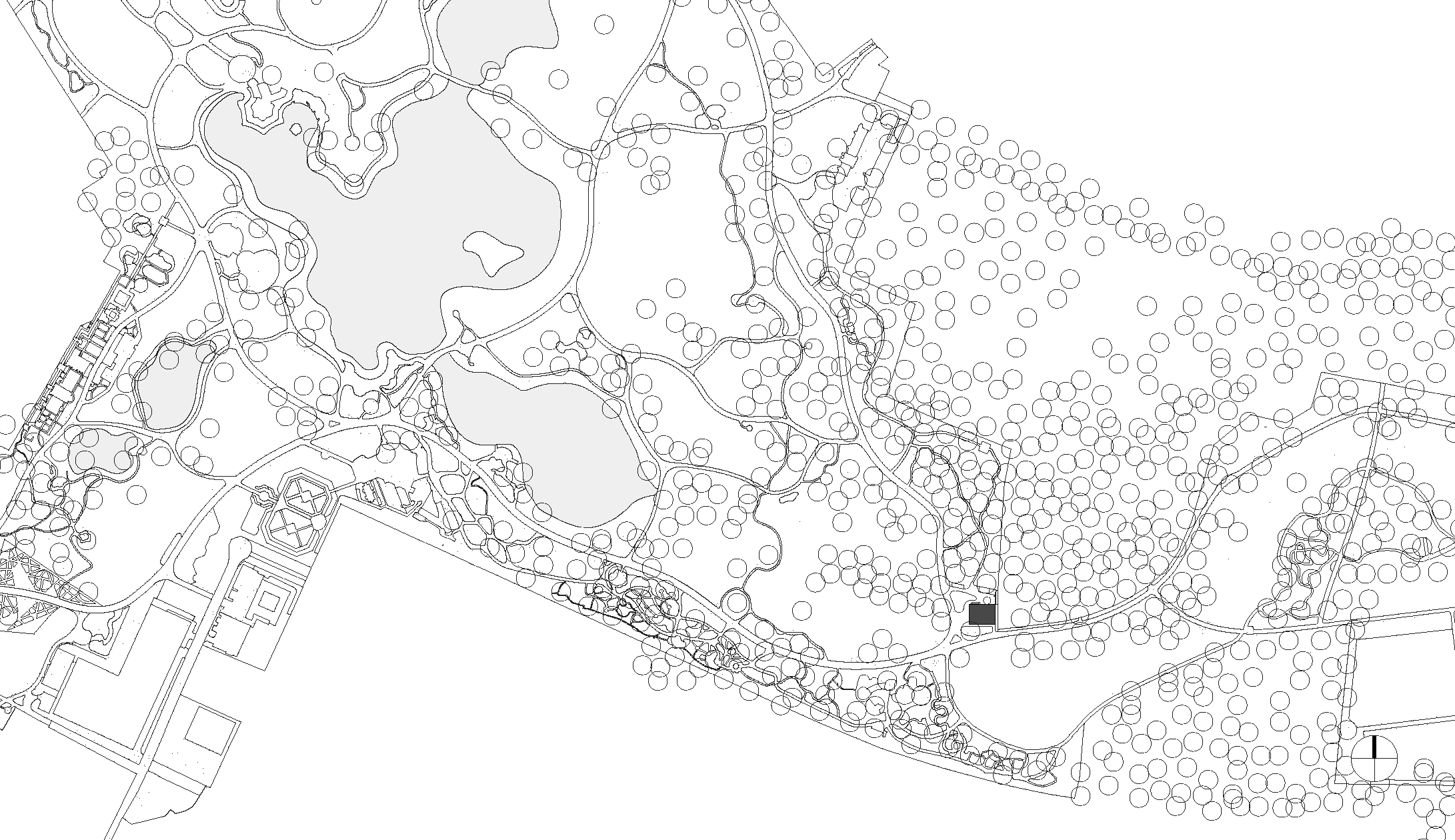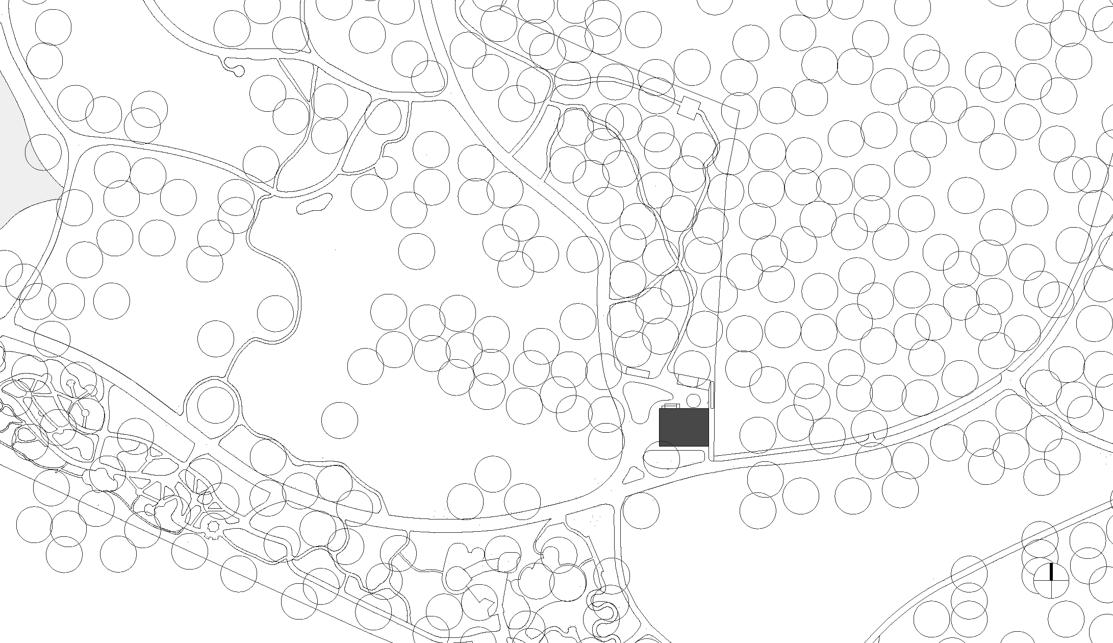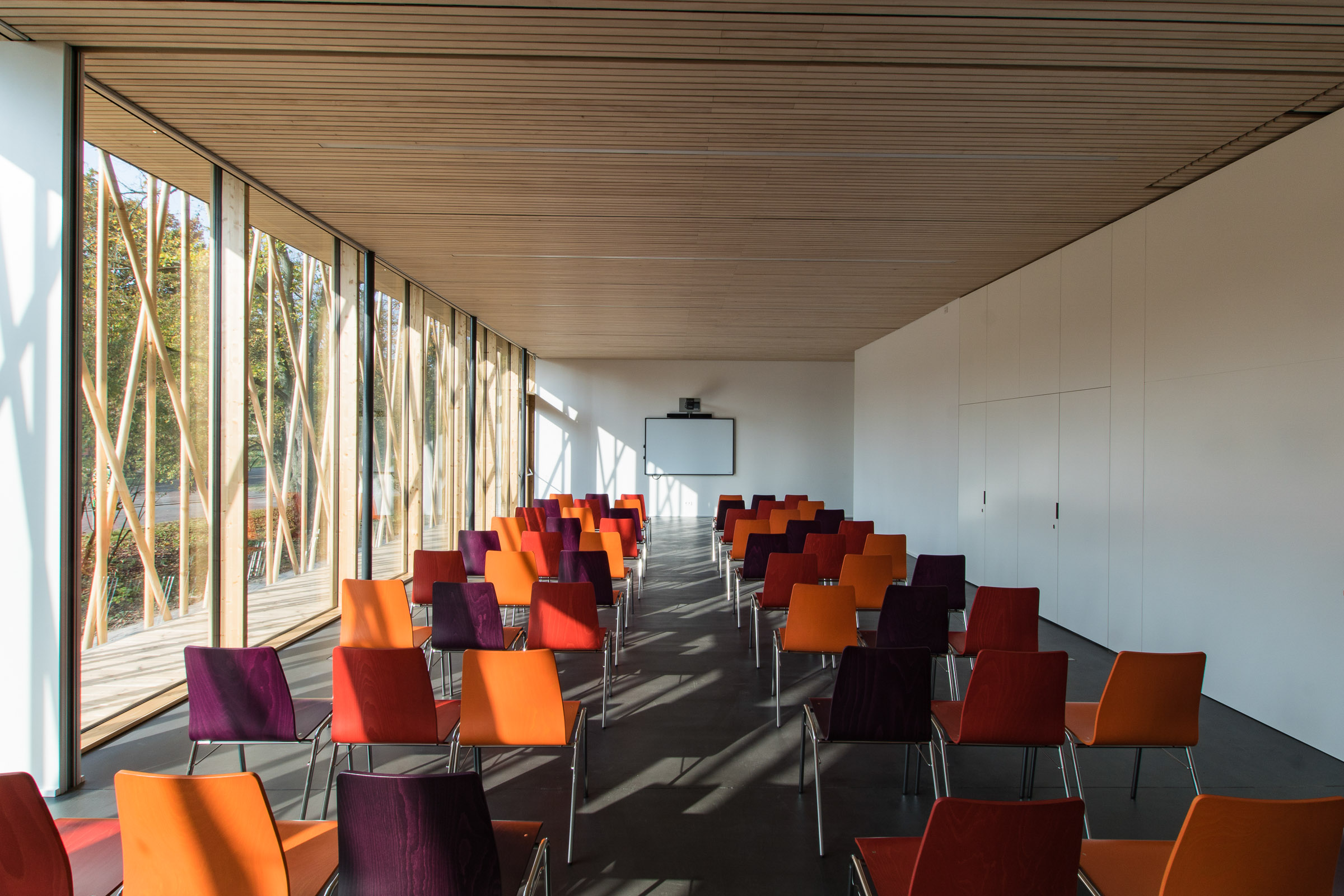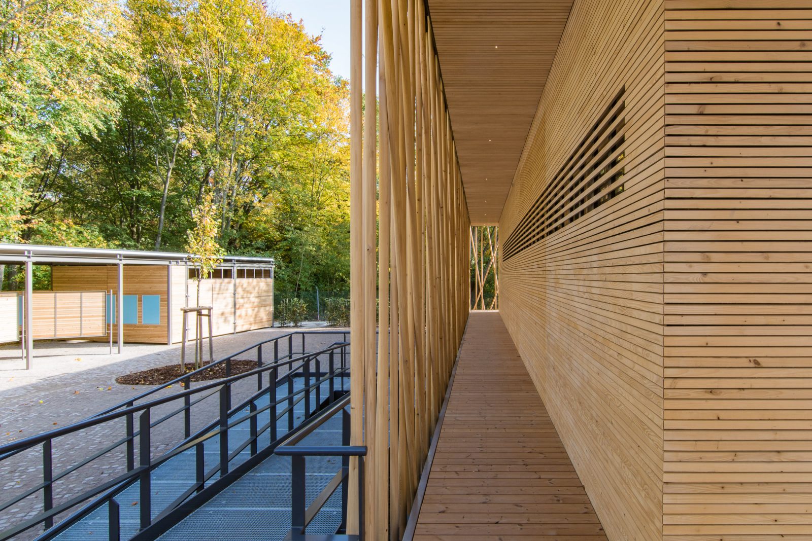 Das eingeschossige Bauwerk wurde als schwebender Pavillon im alten Baumbestand konzipiert. Während sich der nördliche Teil des Gebäudes als geschlossener Büro- und Infrastrukturblock nach innen orientiert, öffnen sich der Ausstellungsbereich und ein teilbarer Seminarraum durch bodentiefen Glasfenster nach Südwesten zum Park. Dieser Kernstruktur ist eine umlaufende Raumschicht vorgelagert, die durch ein filigran geflochtenes Band aus Rundhölzern gefasst wird, um Licht und Blicke zu filtern.