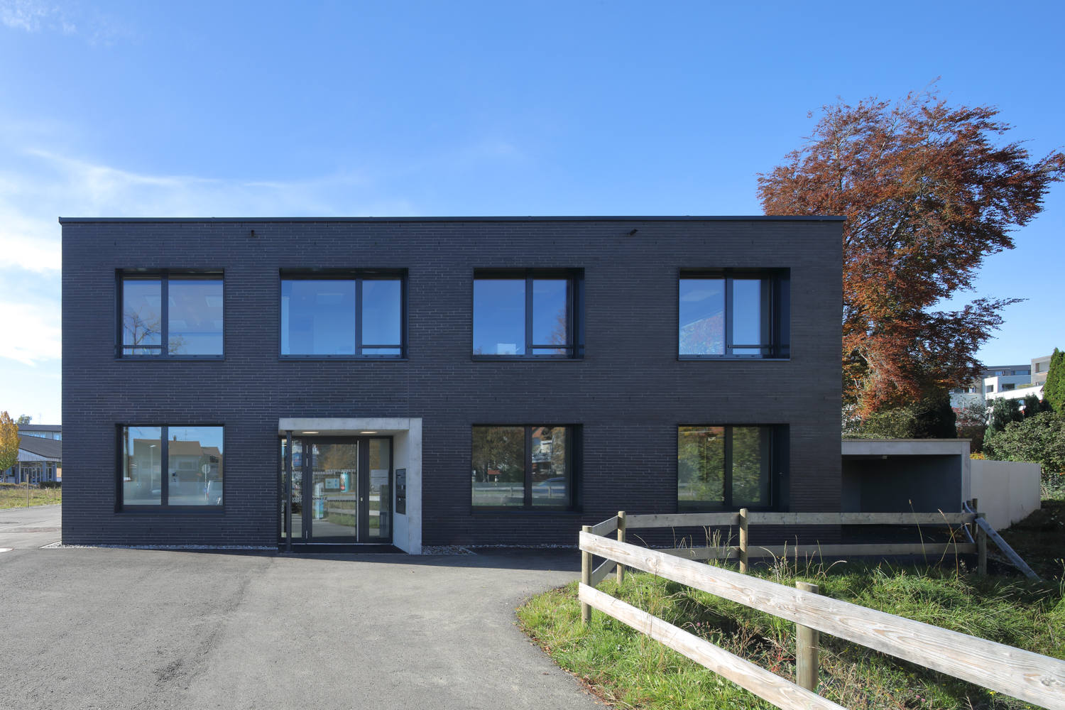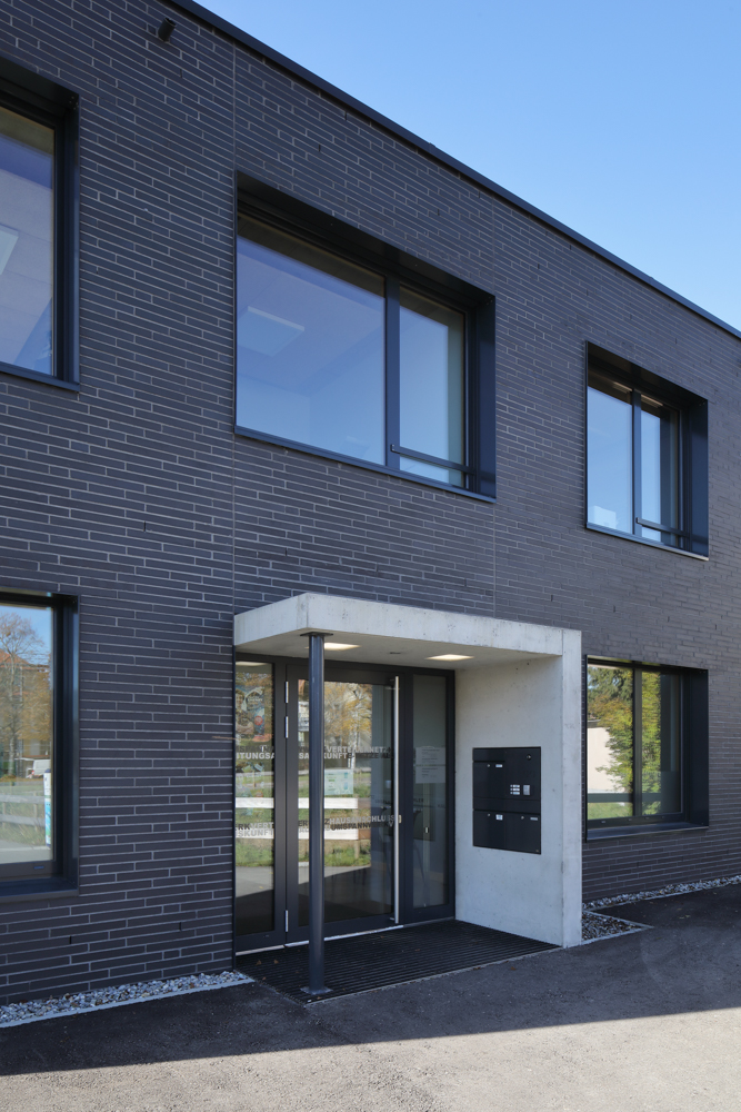 Ein zweigeschossig überhöhtes Volumen bildet den Kopfbau, welcher neben Büroräumen für die Verwaltung auch ein öffentlich zugängliches Kundenzentrum beherbergt. Das klar strukturierte Gebäude ist barrierefrei organisiert und öffnet sich durch großflächige Fenster zum städtischen Raum. Um eine möglichst hohe Flexibilität zu gewährleisten, sind die Innenwände in Trockenbauweise errichtet, während die statischen Lasten über den Erschließungskern und die Außenwände aus Stahlbeton abgeleitet werden. Diese sind mit einer Kerndämmung versehen und in ortstypischer Konstruktionsweise durch eine dunkle, matt schimmernde Klinkerfassade verblendet.