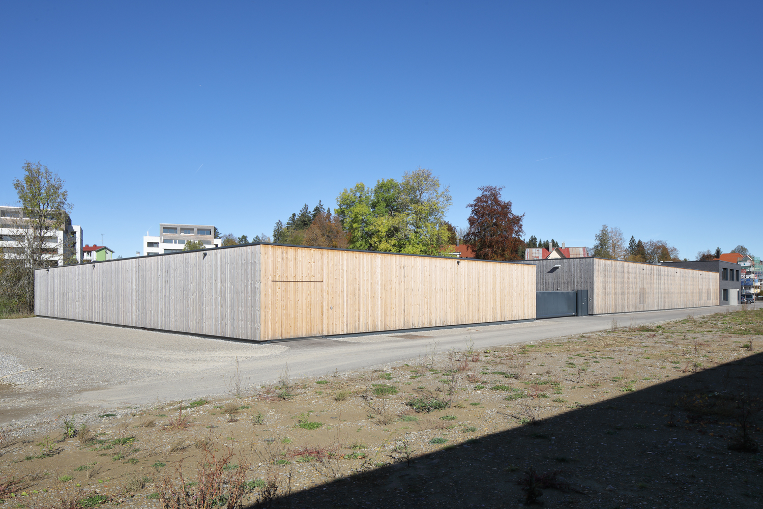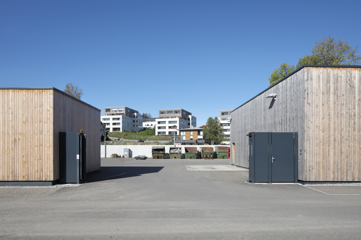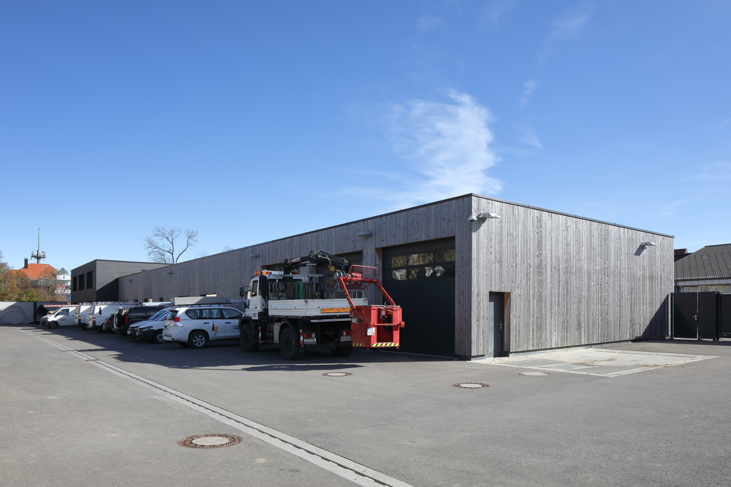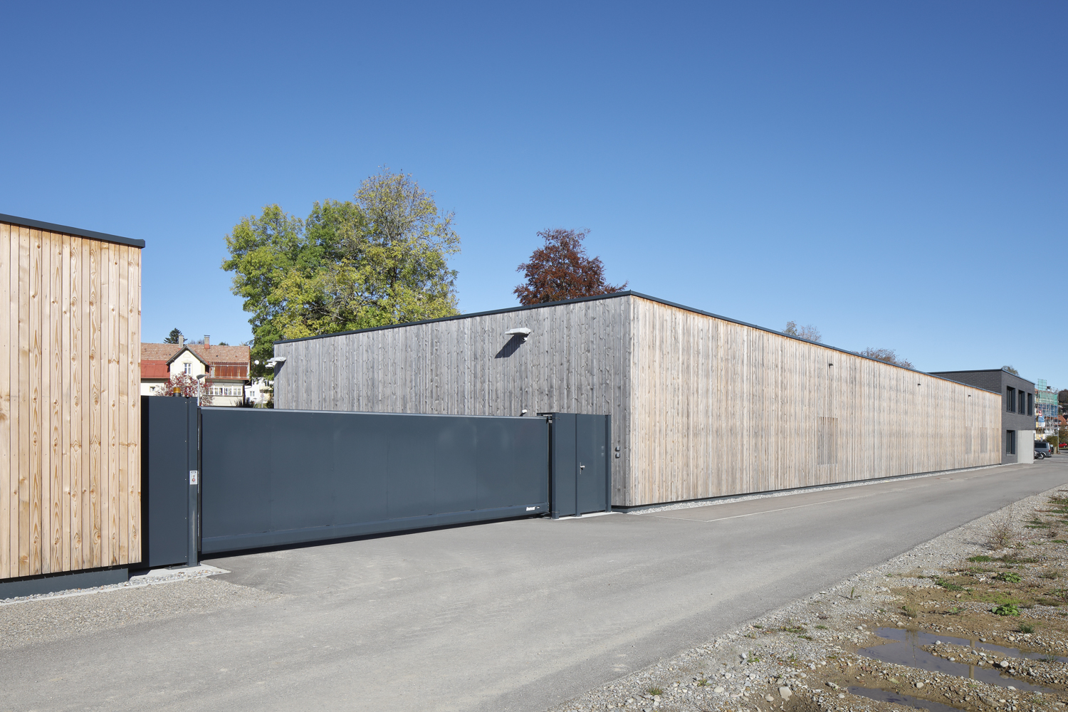 Der betriebliche Teil der Anlage nimmt sich in seiner Formensprache und Materialität gegenüber dem Verwaltungsgebäude deutlich zurück und ist als schlichte Holzkonstruktion ausgeführt. Sein geschlossener Innenhof grenzt sich durch den langgestreckten eingeschossigen Wirtschaftsbau mit Werkstätten, Garagen und Lagern vom Straßenraum ab und wird gegen Südwesten von einem L-förmigen Flugdach zur Unterbringung der Betriebsfahrzeuge gefasst. Beide Strukturen sind in Ständerbauweise errichtet und von Massivholzdächern gedeckt, die Außenhülle ist mit einer feinen Vertikalschalung aus sägerauer Weißtanne belegt.