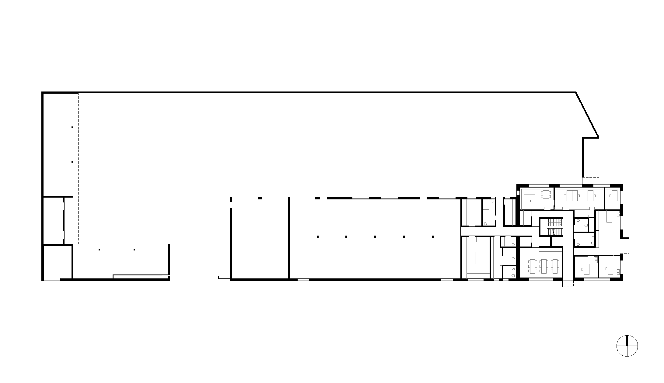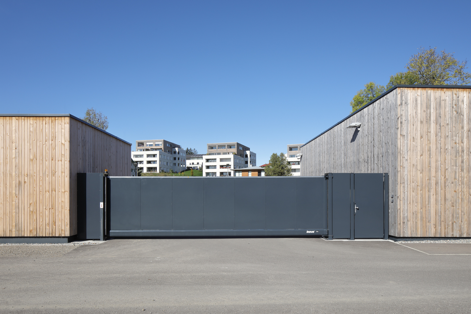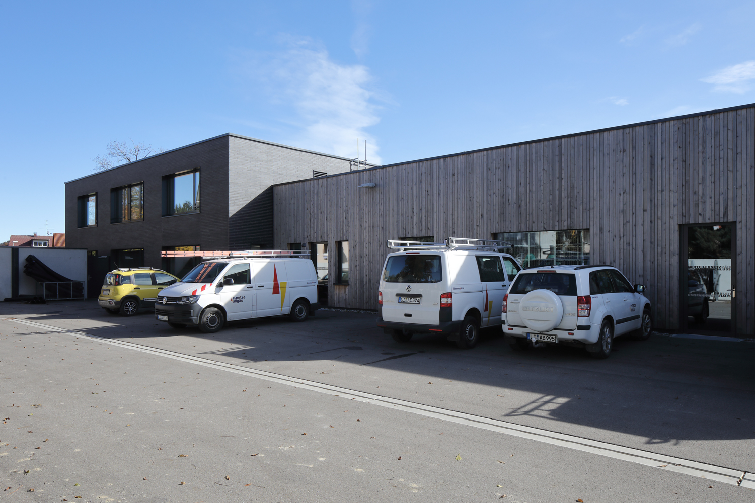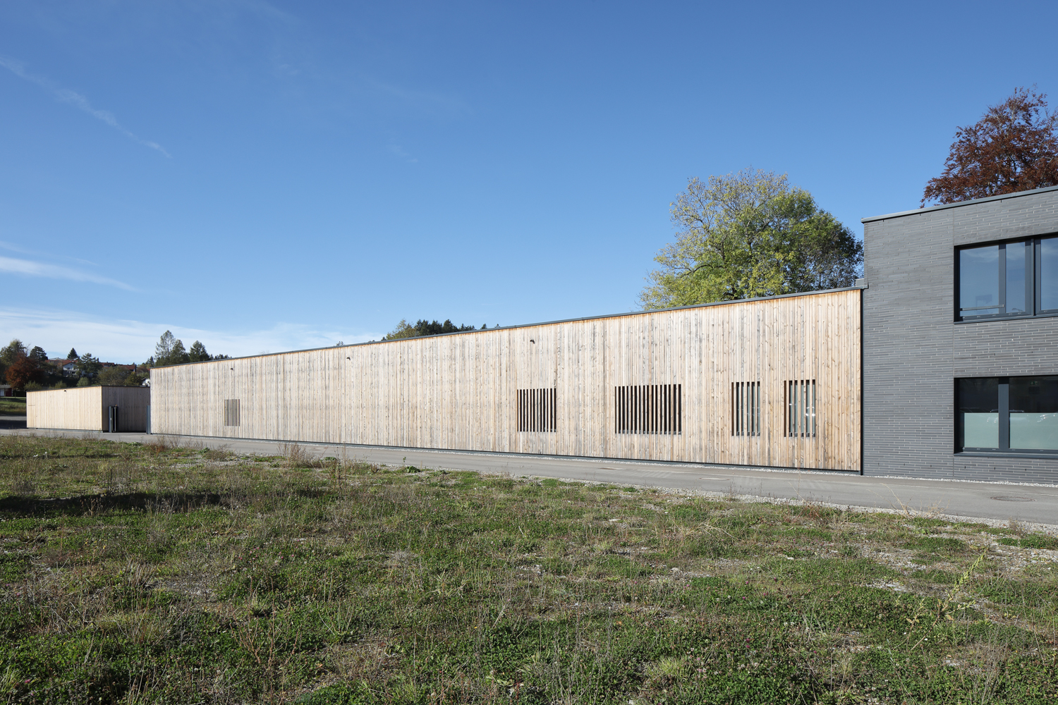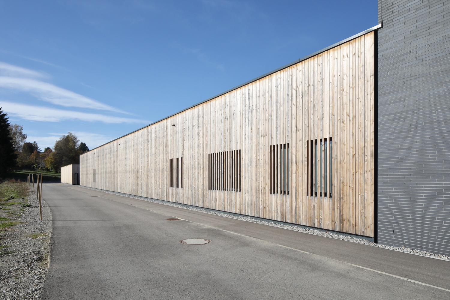 Der betriebliche Teil der Anlage nimmt sich in seiner Formensprache und Materialität gegenüber dem Verwaltungsgebäude deutlich zurück und ist als schlichte Holzkonstruktion ausgeführt. Sein geschlossener Innenhof grenzt sich durch den langgestreckten eingeschossigen Wirtschaftsbau mit Werkstätten, Garagen und Lagern vom Straßenraum ab und wird gegen Südwesten von einem L-förmigen Flugdach zur Unterbringung der Betriebsfahrzeuge gefasst. Beide Strukturen sind in Ständerbauweise errichtet und von Massivholzdächern gedeckt, die Außenhülle ist mit einer feinen Vertikalschalung aus sägerauer Weißtanne belegt.