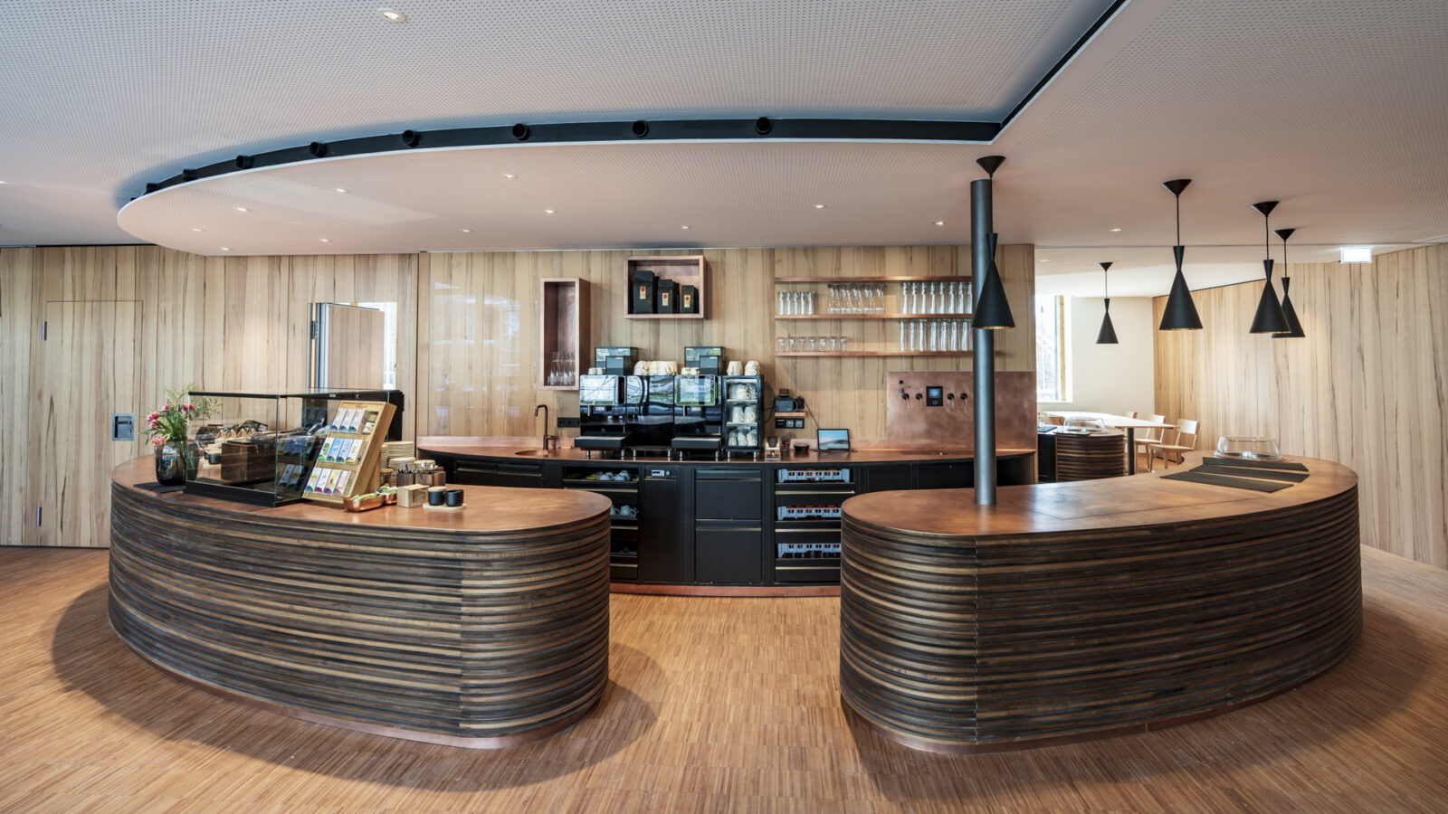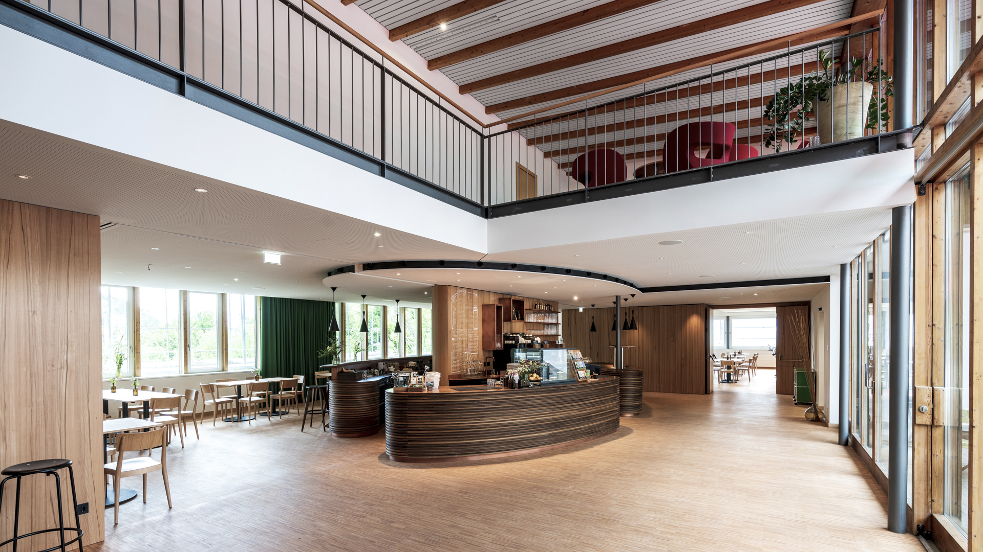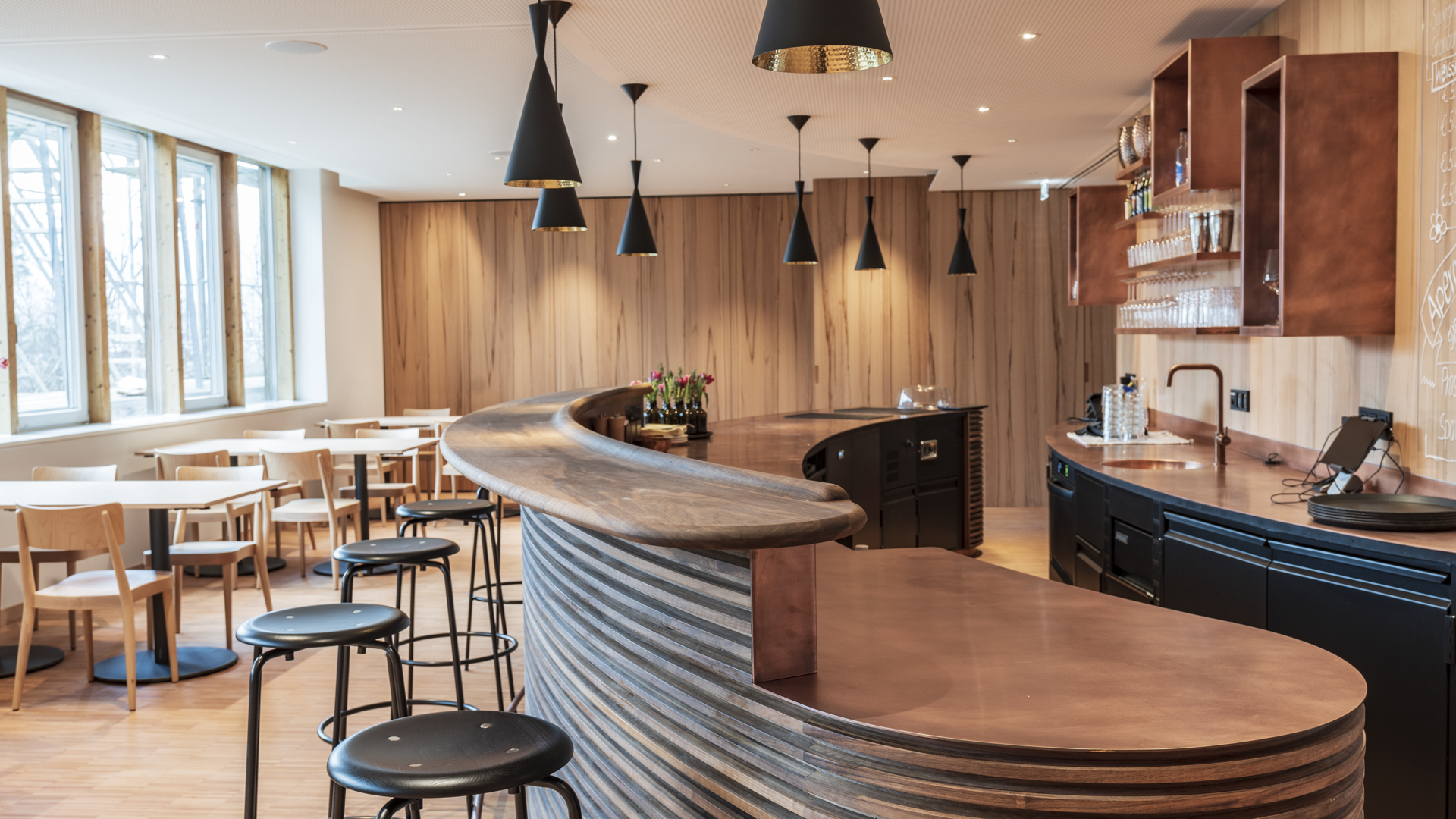 The repositioned reception desk, a drinking fountain, the elliptical bar and a generous table with benches were handcrafted from local walnut, and the Vorarlberg artist Anna-Amanda Steurer designed a curtain with muted motifs and colours for the large south-facing windows of the dining room.