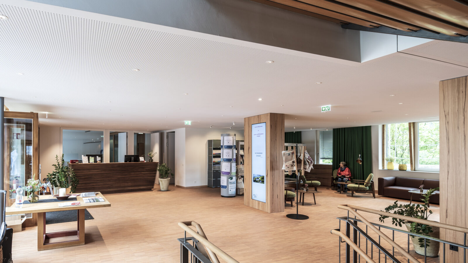 Inviting café and lounge furniture are loosely grouped on the different levels of the central stair hall, which leads to the upper floor. There, the planners extended two of the seminar rooms by raising the roof and integrating the existing balcony, which means that visitors now have two large event halls and 14 other rooms available as meeting places.