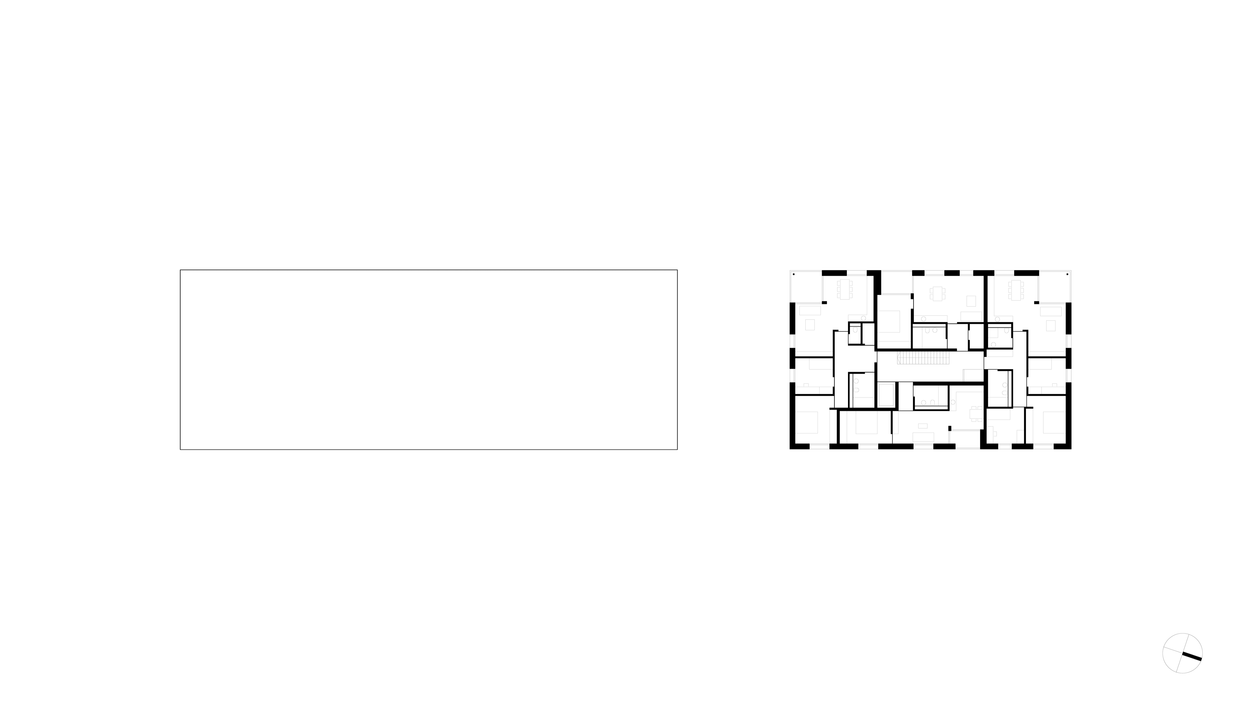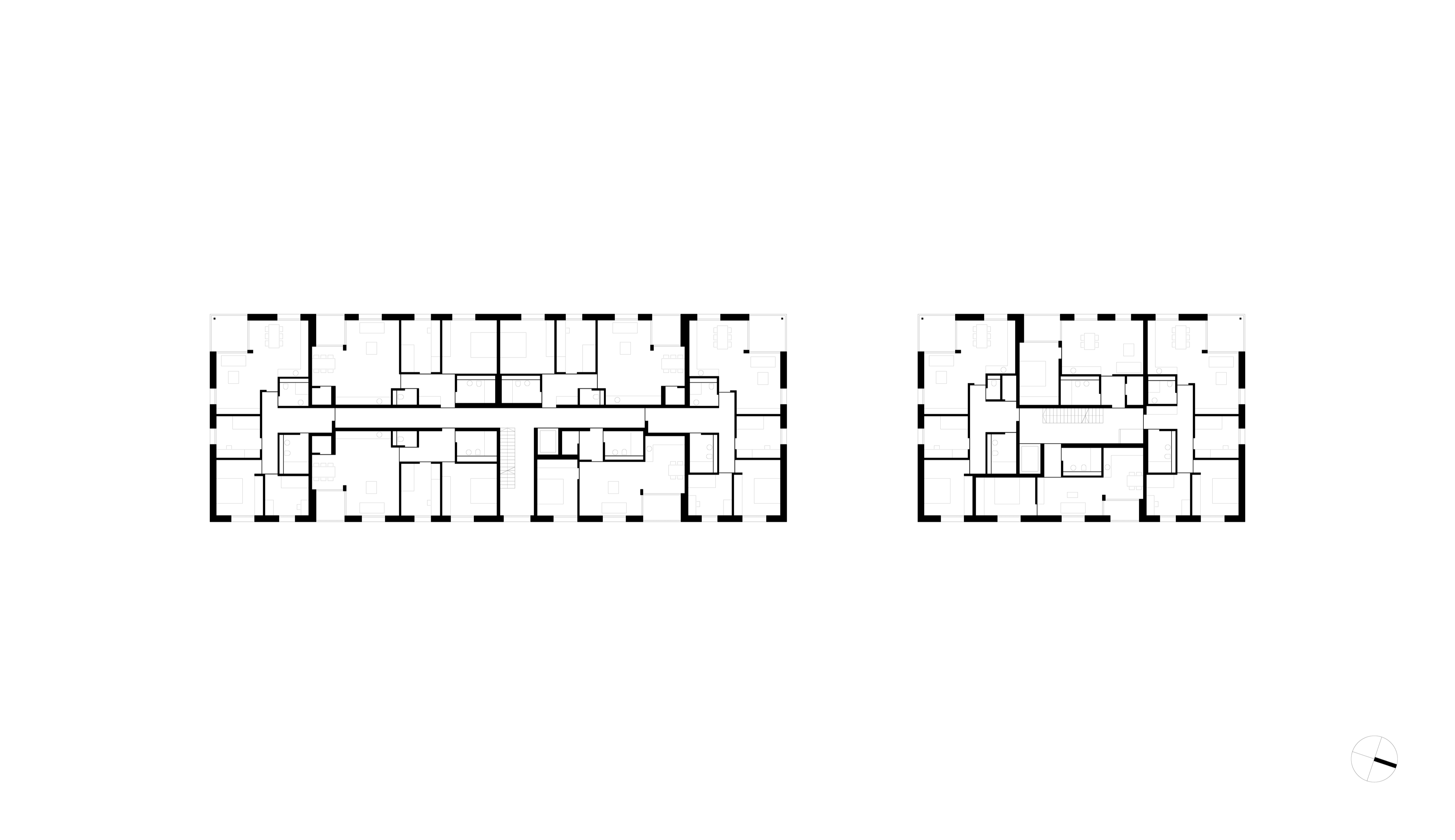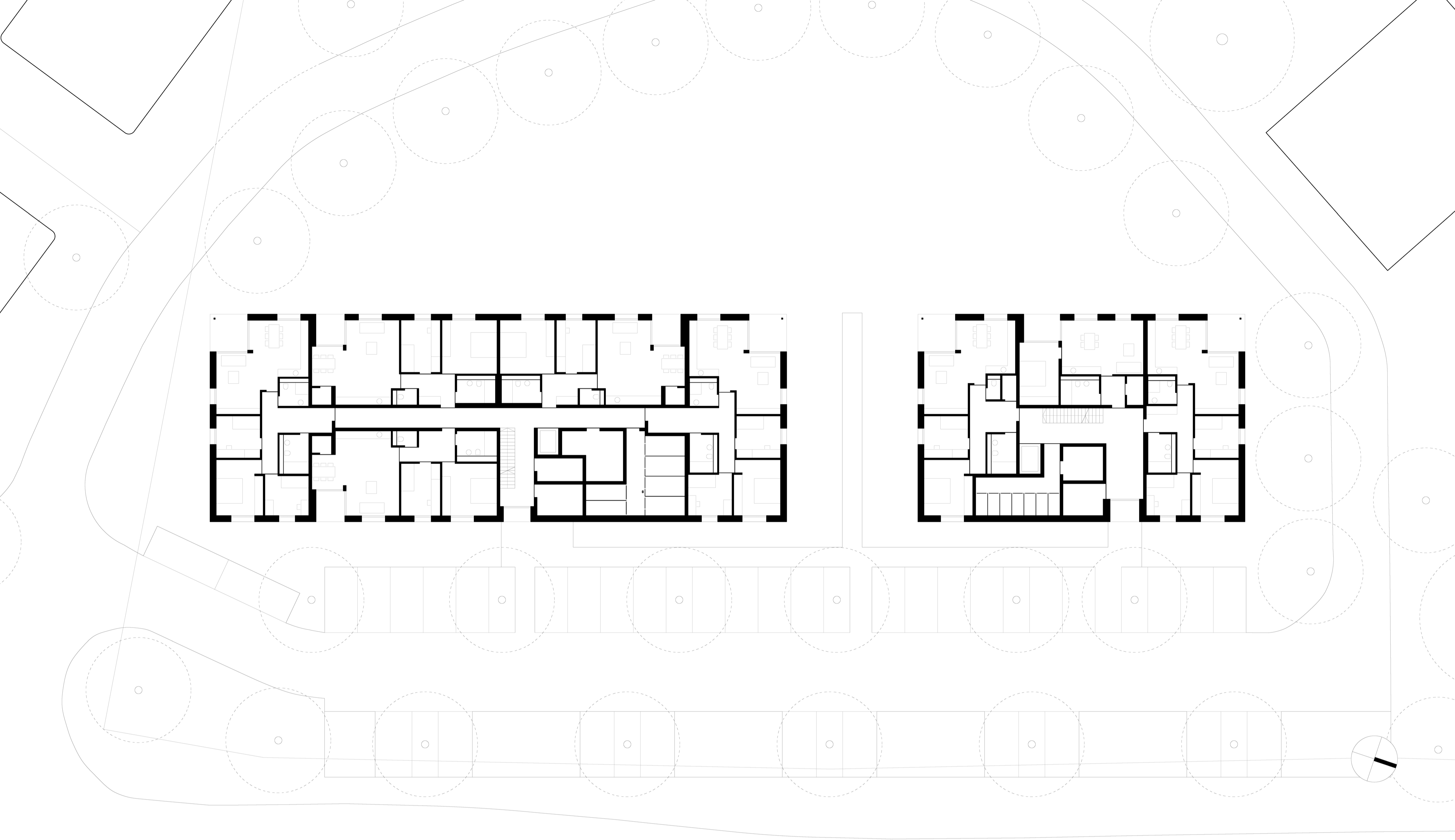 Their construction consists of load-bearing timber frame walls with prefabricated concrete ceilings; for cost reasons, no basement was built. The buildings are designed as efficiency houses 55 and are connected to the estate’s local heating system.