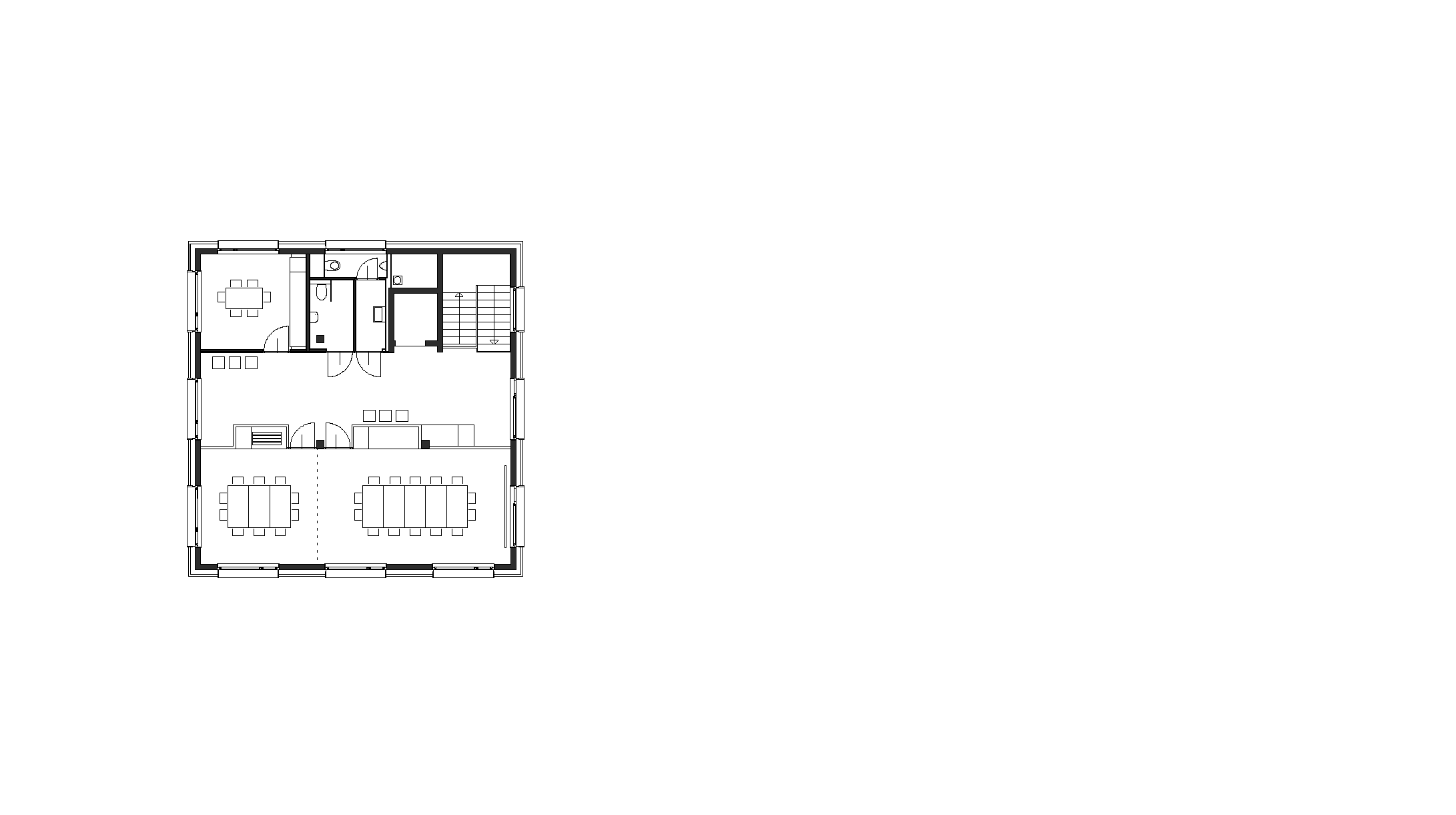 Further developments included a new wing that houses offices and a bakery along the north side of the re-routed Bildsteinstraße, the integration of the underground garage with its staircases to the new buildings, as well as plans for a future village hall on the east. The public square stretches to the foot of the hills in the background and at the front it is screened from the main road by the town hall.