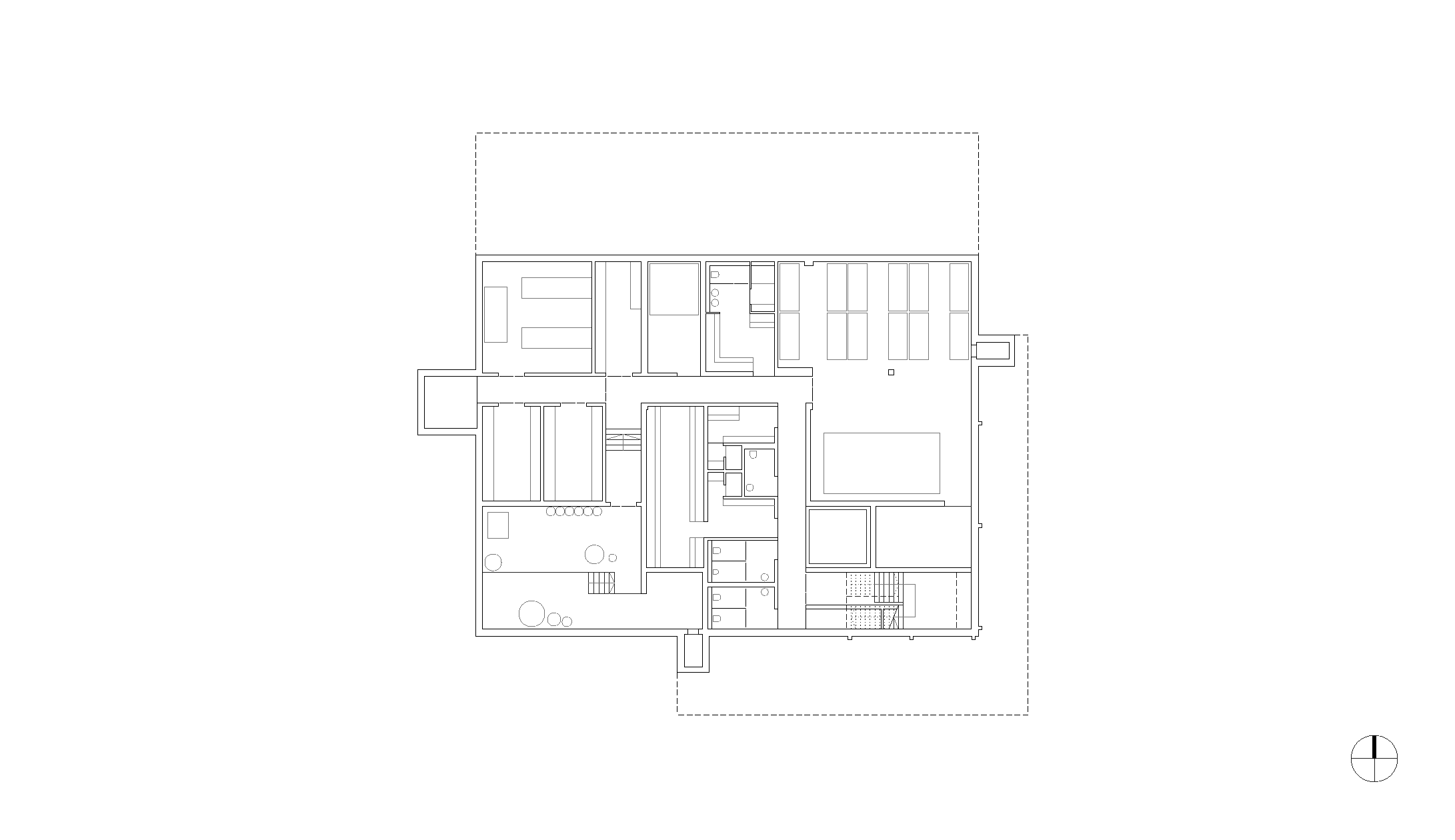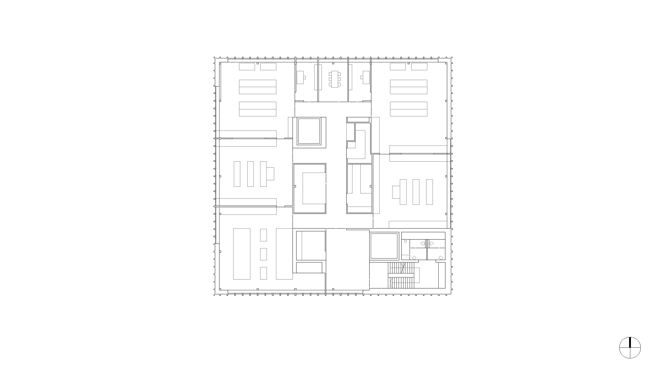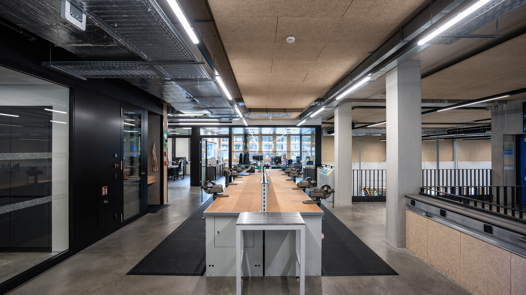 On top of the concrete basement, with technical and service zones, four storeys were built in steel-concrete composite construction. The workrooms of the metal technology training branch occupy the two lower floors. The heart of the building is a two-storey machine hall, which opens extensively to the north and creates visual links and communication axes through extensive gallery areas.