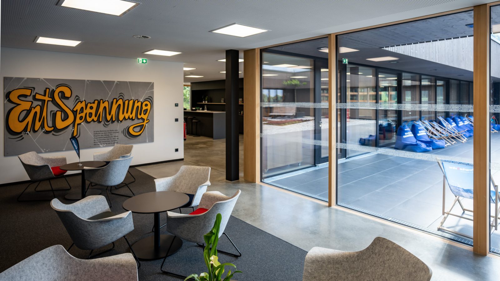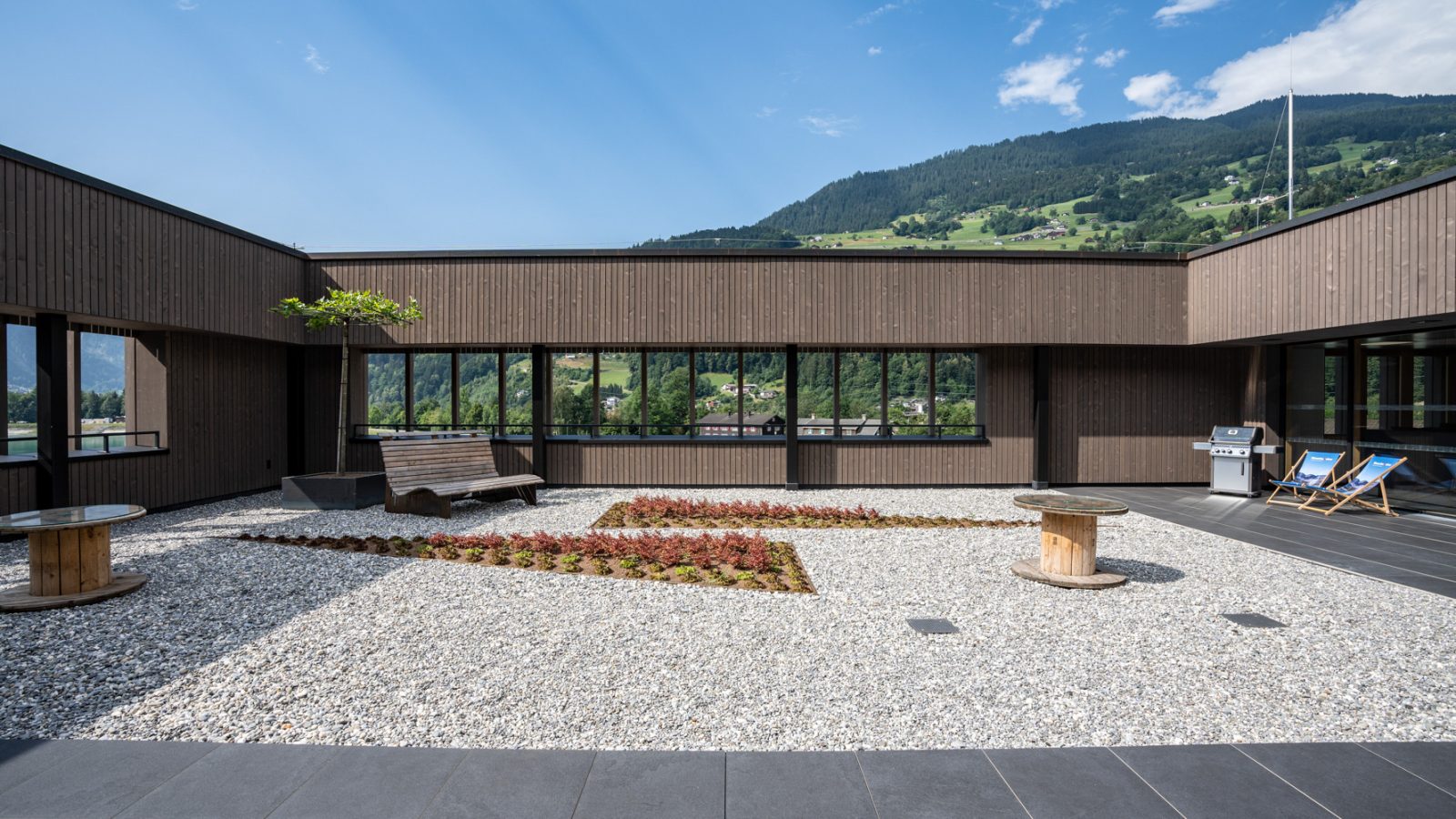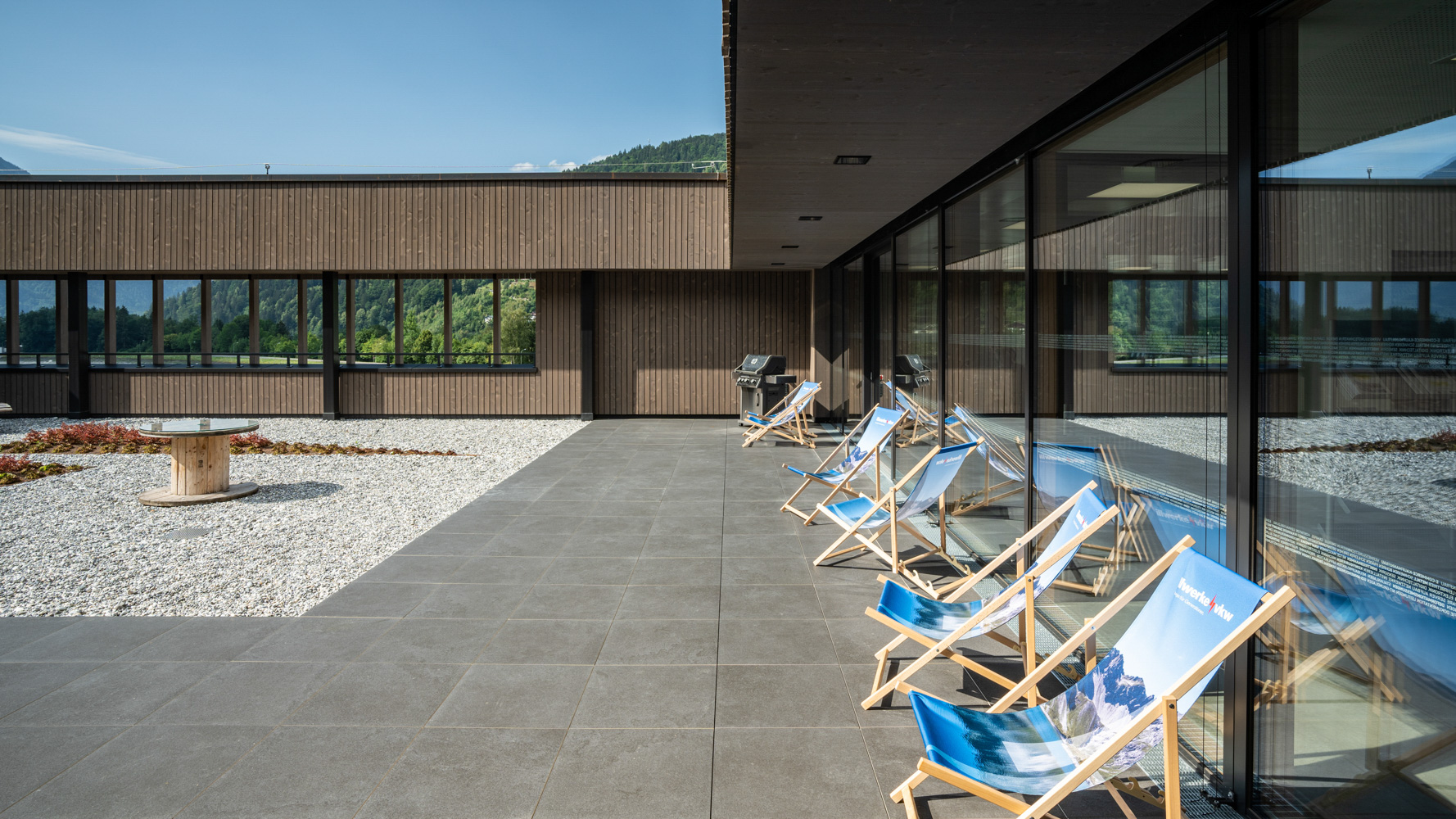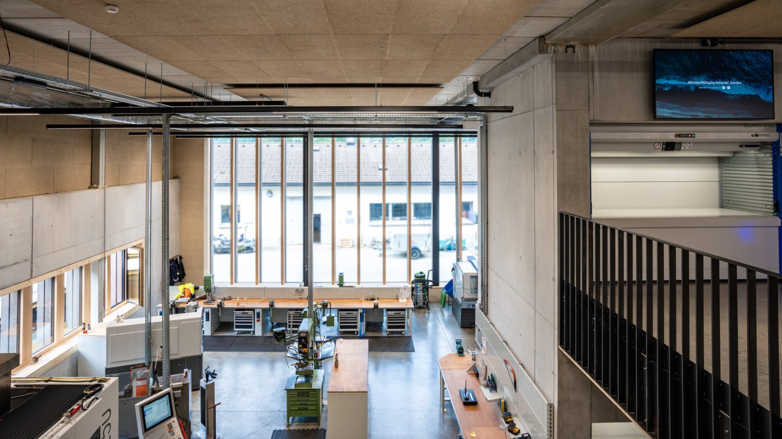 Above this are the training rooms for electrical engineering, IT technology and commercial training. These are functionally structured and clearly organised. On the floor, bright communal areas are arranged around a spacious roof terrace, which allows unobstructed views of the mountain landscape. In the design of the interior areas, the choice of high-quality, robust and durable materials emphasises the workshop character of the building. These are processed according to the best tradition of craftsmanship. Some of them are left raw and untreated in order to consciously show traces of manufacture and use.