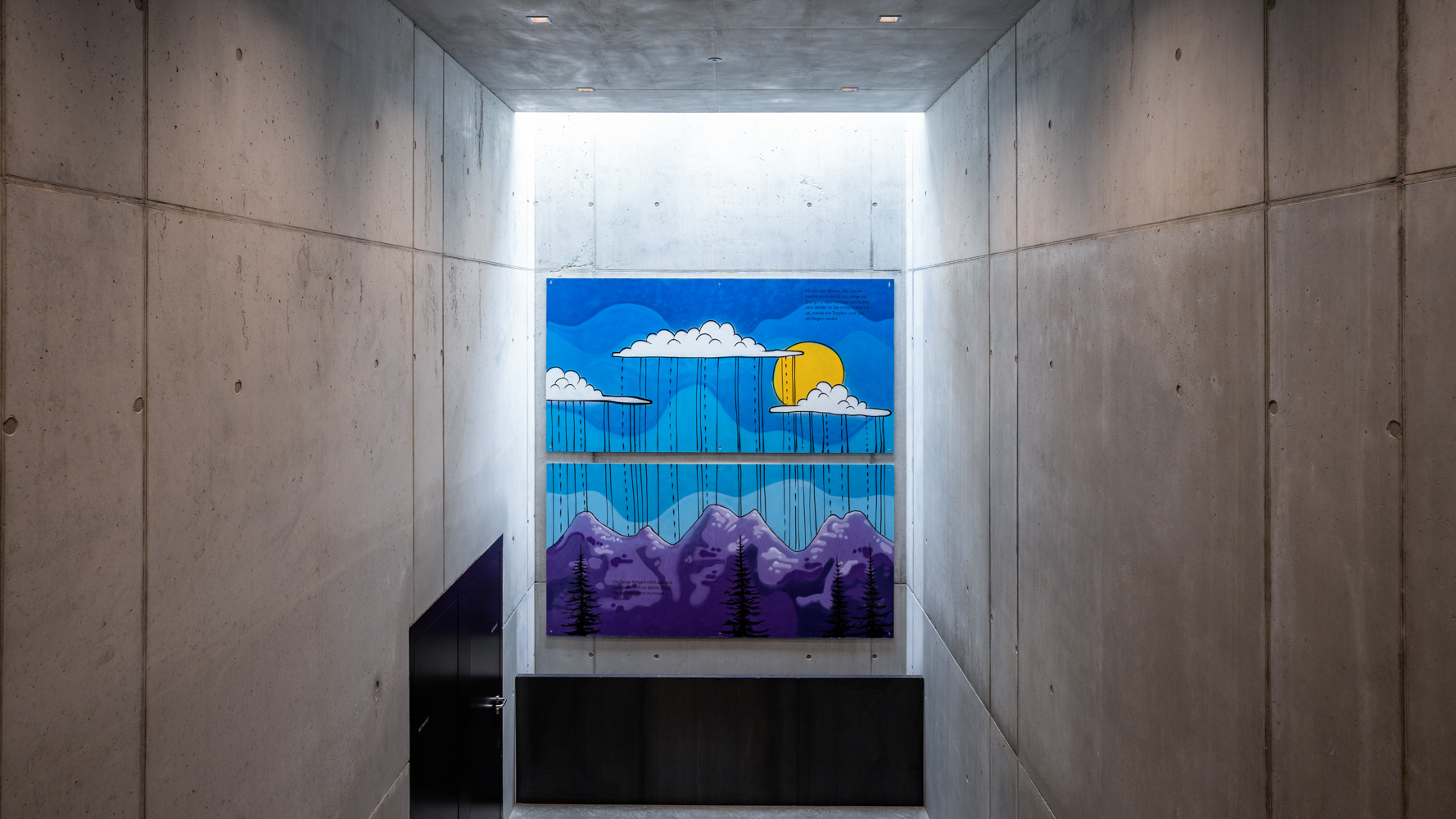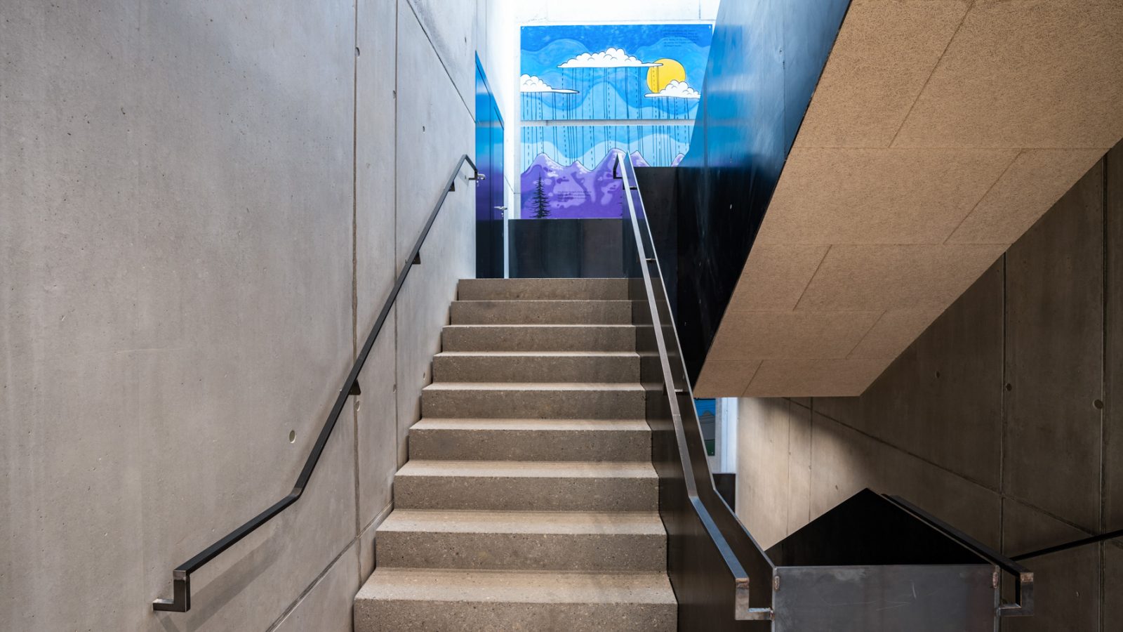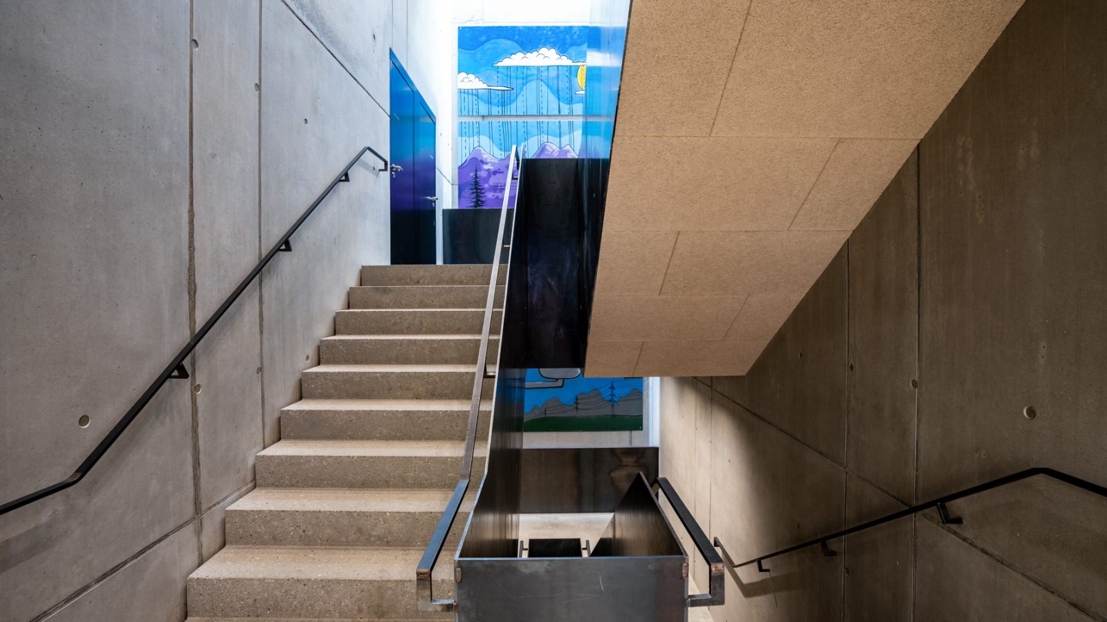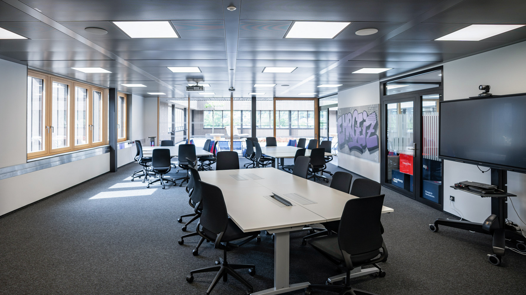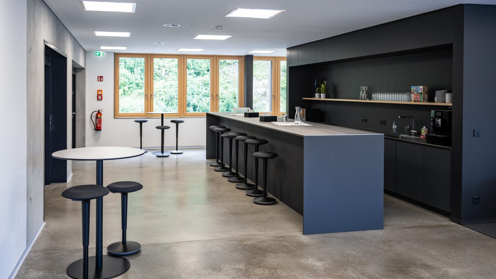 Above this are the training rooms for electrical engineering, IT technology and commercial training. These are functionally structured and clearly organised. On the floor, bright communal areas are arranged around a spacious roof terrace, which allows unobstructed views of the mountain landscape. In the design of the interior areas, the choice of high-quality, robust and durable materials emphasises the workshop character of the building. These are processed according to the best tradition of craftsmanship. Some of them are left raw and untreated in order to consciously show traces of manufacture and use.