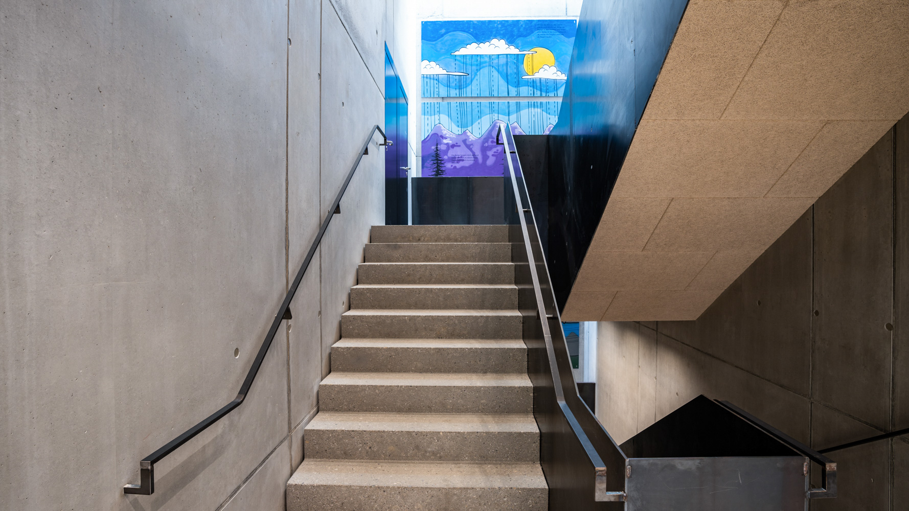The outer skin is made of timber elements and covered with a vertical formwork of pre-greyed spruce boards. Continuous pilaster strips of glulam add rhythm to the simple façades; while the inserted exposed concrete body emphasises the access zone and formulates a clear location. The trainees were able to participate in smaller tasks and were actively involved in a graffiti project as part of “Kunst am Bau”.
