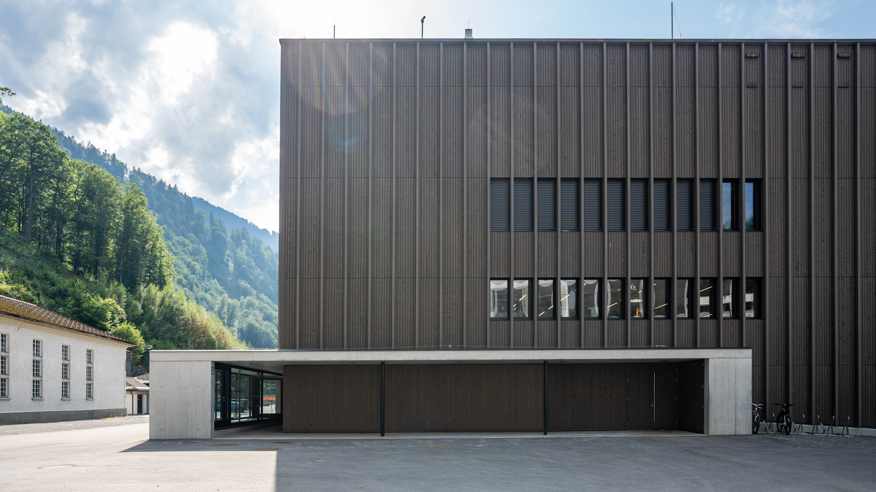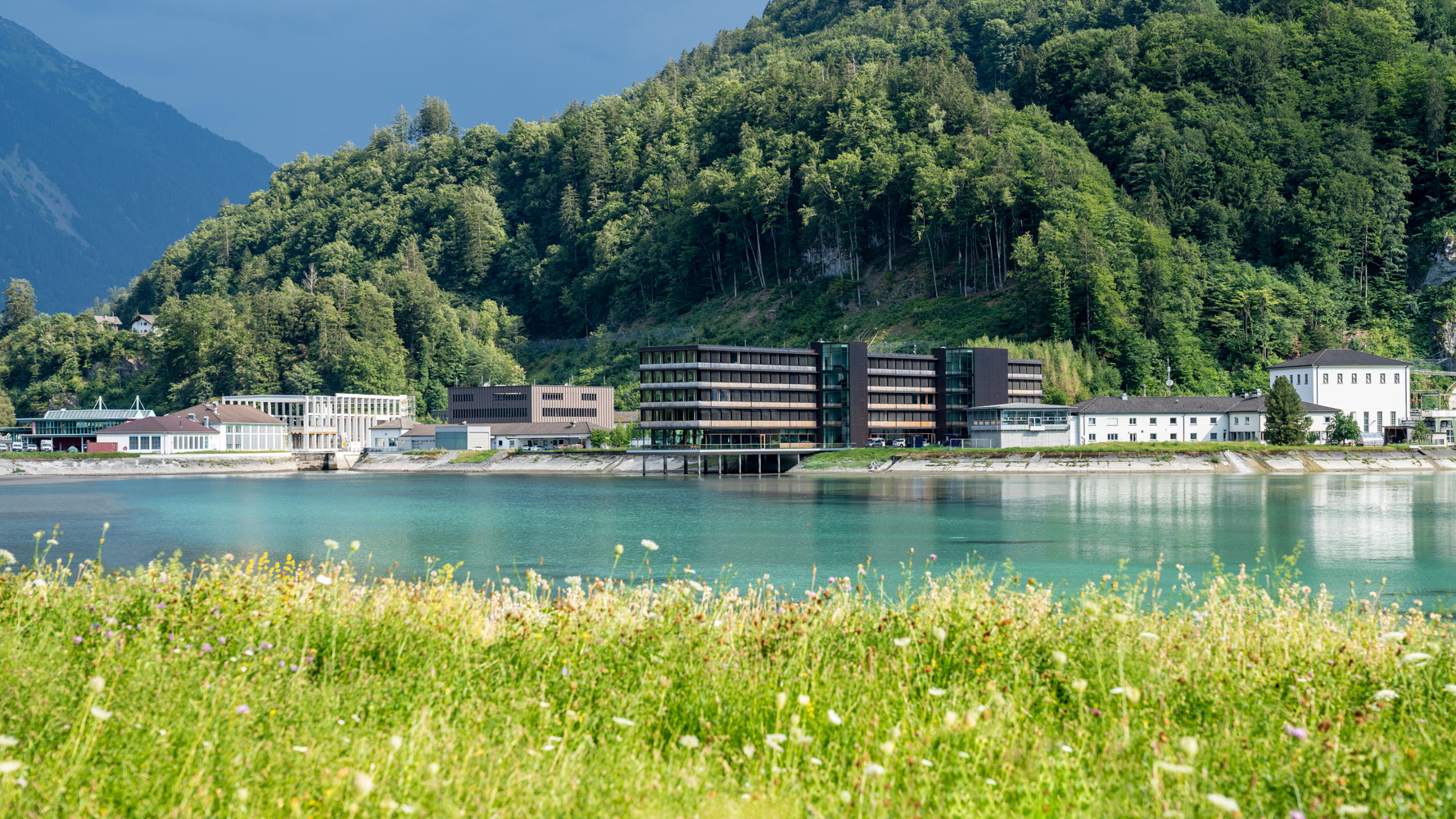The Illwerke premises on the southern shore of the reservoir in Vandans are being continuously renewed and expanded. Existing vehicle halls and workshops are giving way to a building entirely dedicated to the next generation and serves as a training centre for apprentices. The compact building blends into the growing ensemble and is connected to the central administration building by a carefully landscaped park.