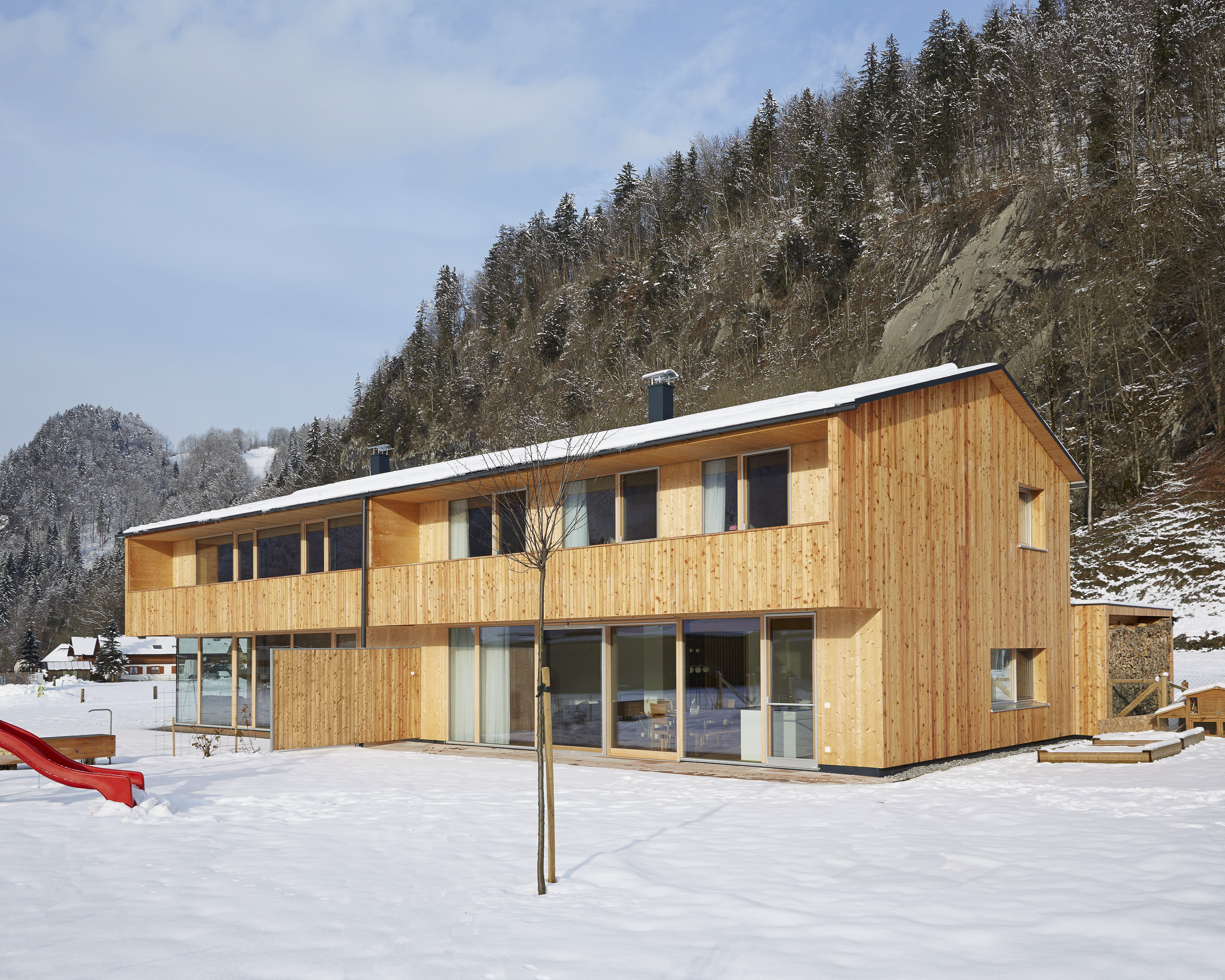 On the outskirts of Bezau, in the Bregenzerwald, three brothers found the perfect opportunity to create a home for all their families, and they set about developing an old duplex building. It was important for the brothers to save costs by limiting the new development to only the most essential of room needs. The one half of the house is inhabited by the family of five of the eldest brother, while the other half consists of two two-room flats in which the other two brothers live. The project is firmly in the family hands: the two uncles, the architect and the carpenter, planned and built the semidetached house for their nephews.