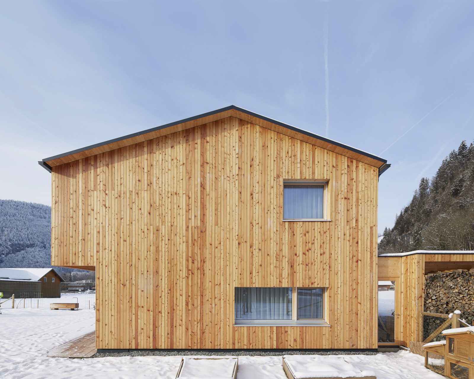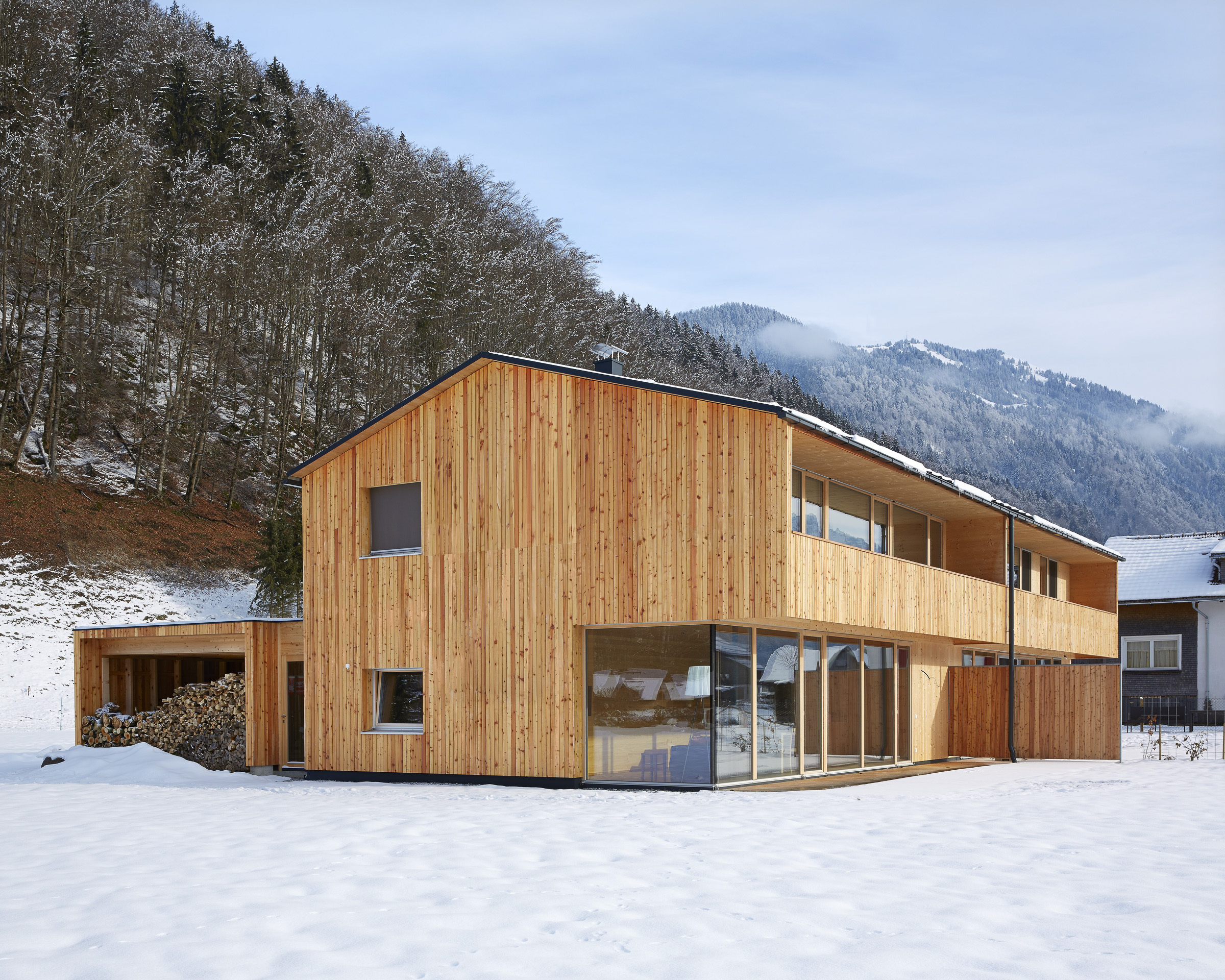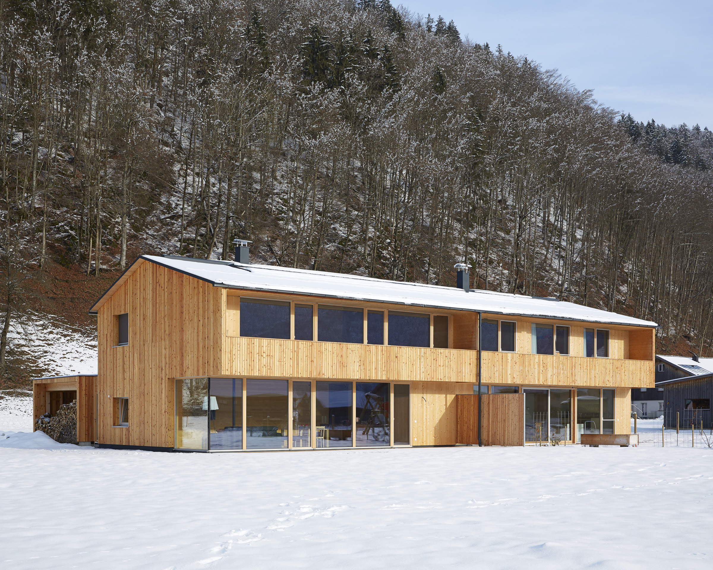 The house was built with a timber frame construction with prefabricated elements, and enveloped with timber – inside with knot-less silver fir and outside with larch. Based on the typical Bregenzerwald house, the balcony is concealed to protect against wind and weather. It is completely under the roofs overhang, which in turn protects the terraces below it. Timber dividing walls offer secluded, private outdoor areas, while the garden can be shared by all.