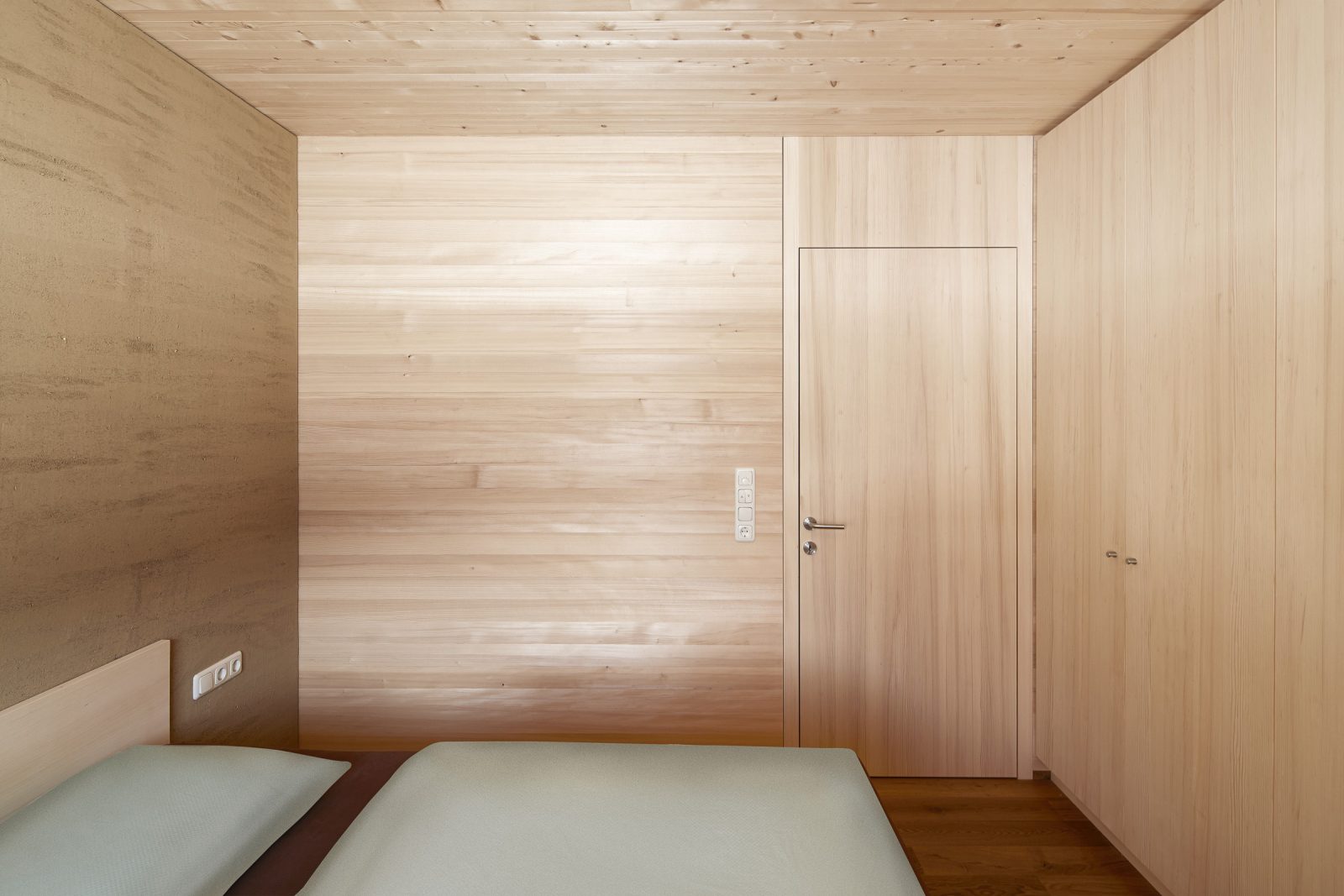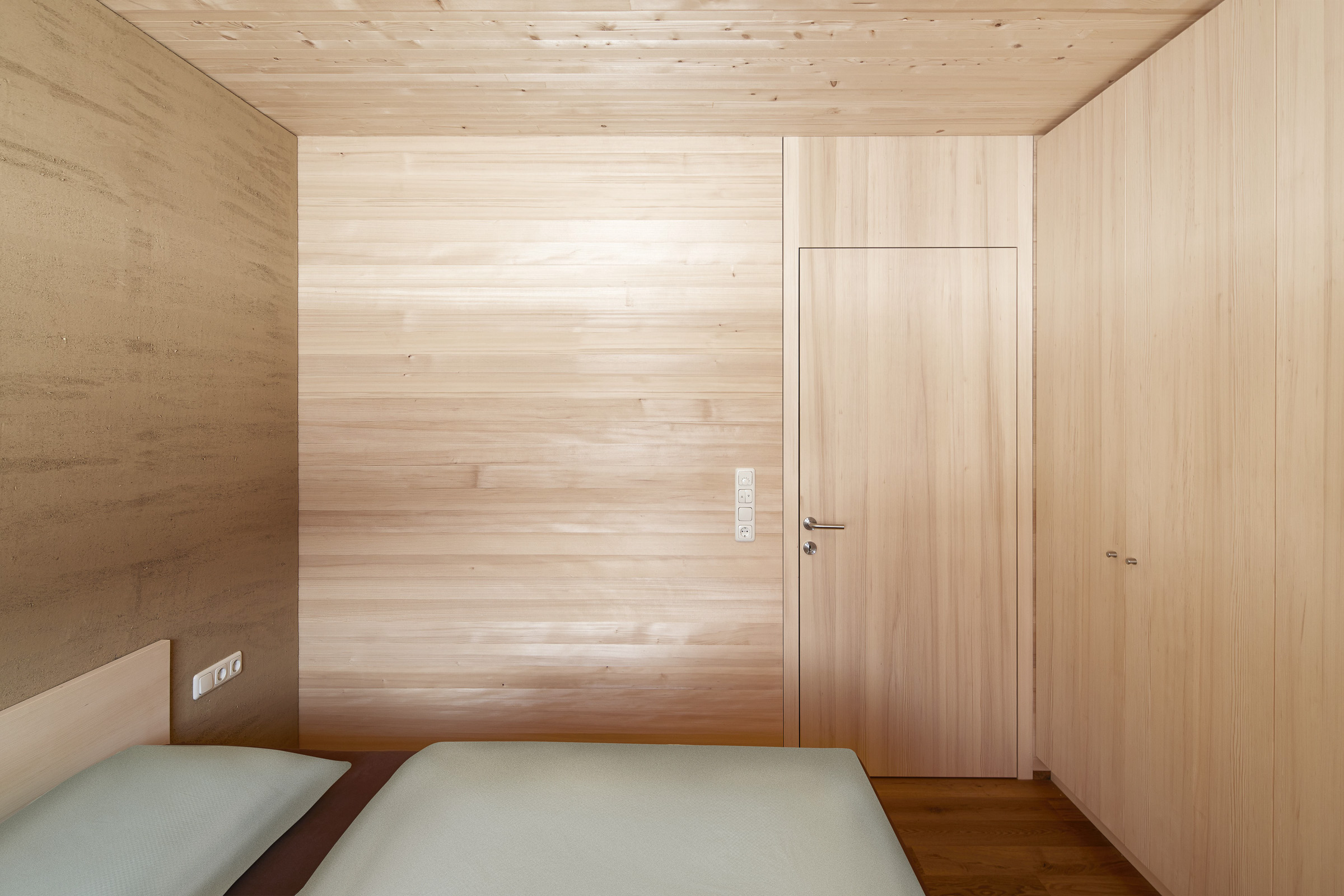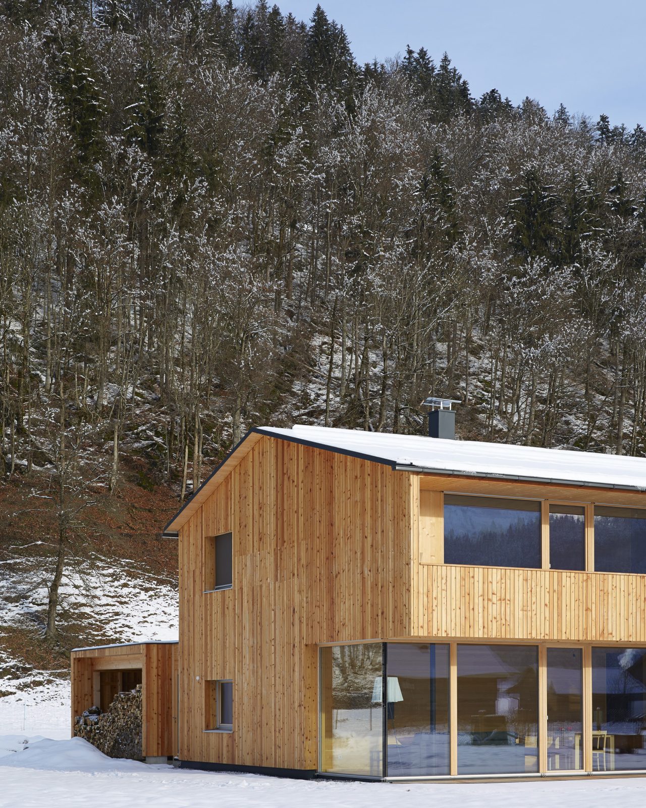 The house was built with a timber frame construction with prefabricated elements, and enveloped with timber – inside with knot-less silver fir and outside with larch. Based on the typical Bregenzerwald house, the balcony is concealed to protect against wind and weather. It is completely under the roofs overhang, which in turn protects the terraces below it. Timber dividing walls offer secluded, private outdoor areas, while the garden can be shared by all.
