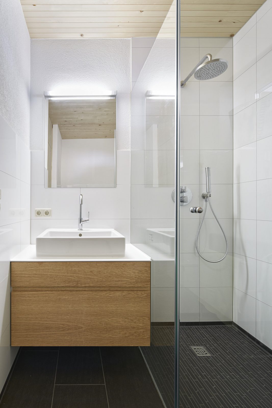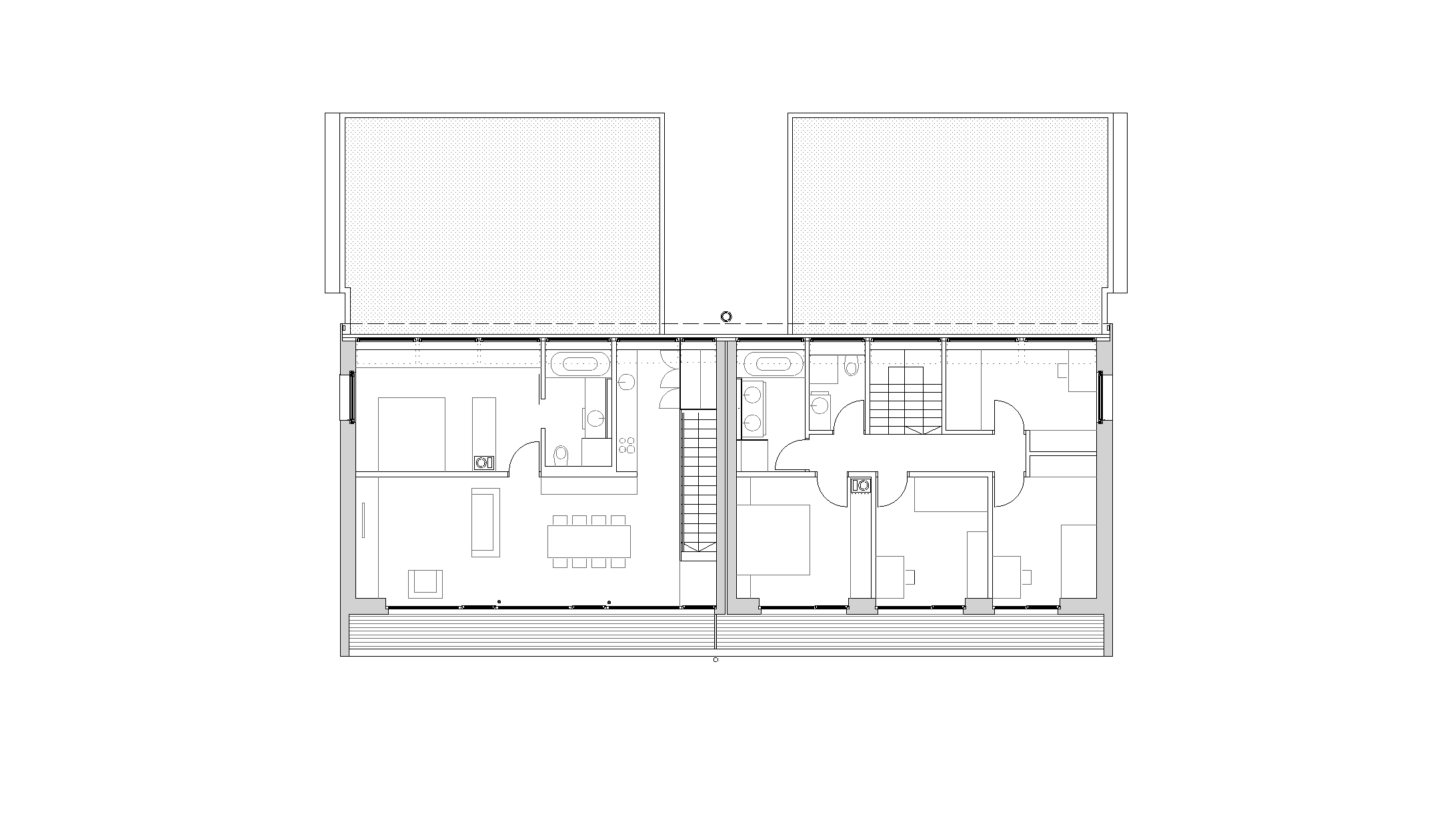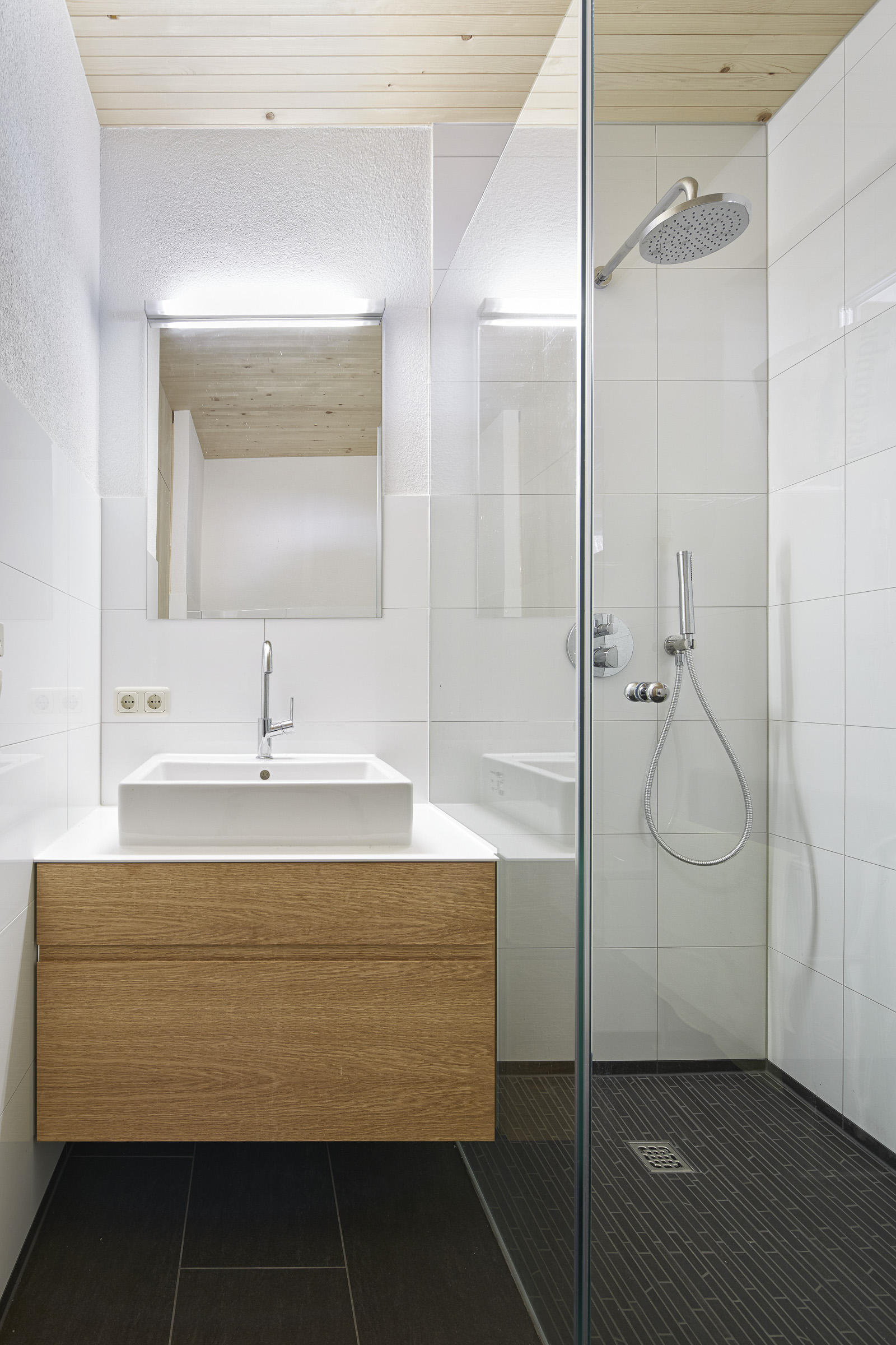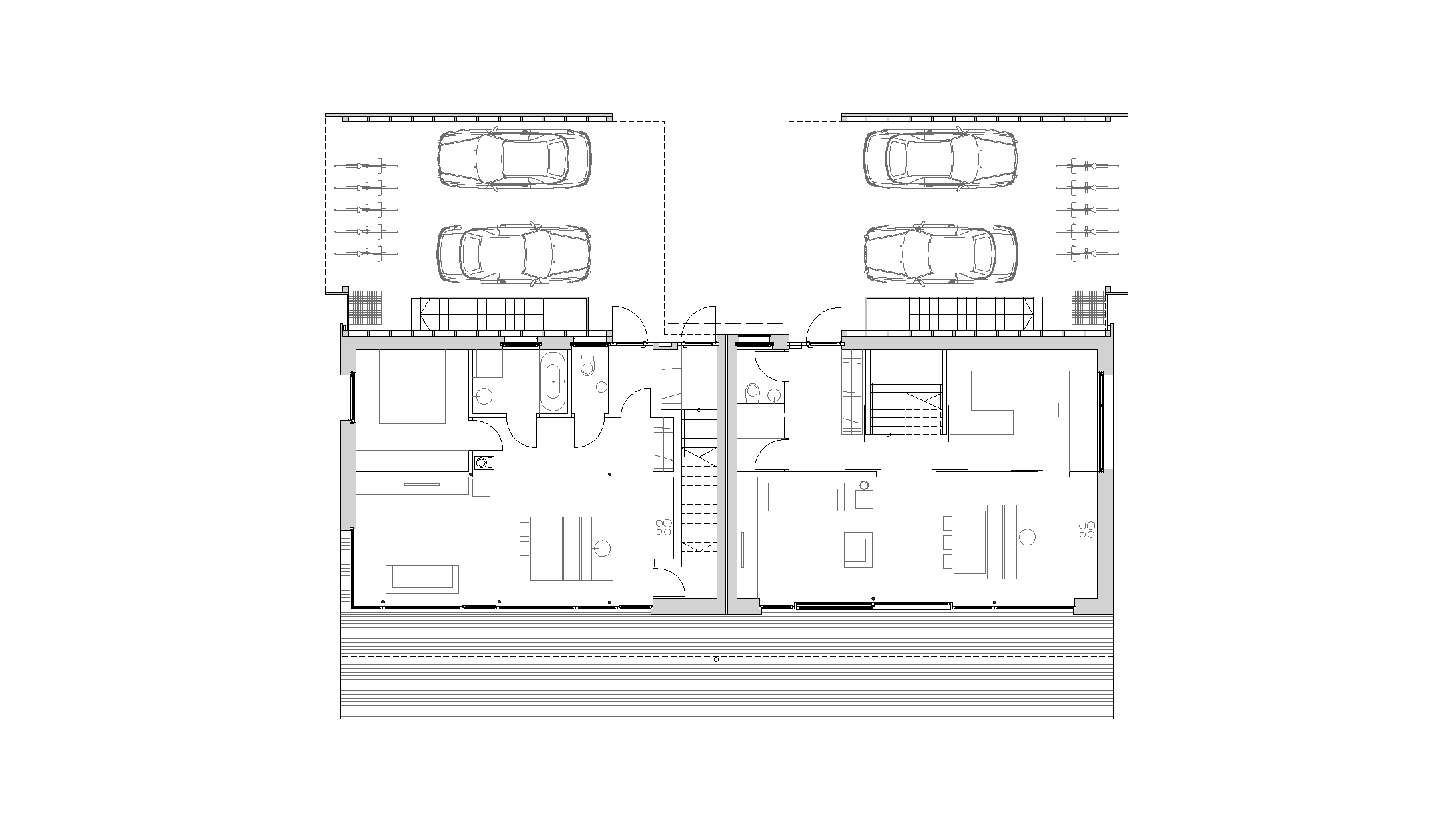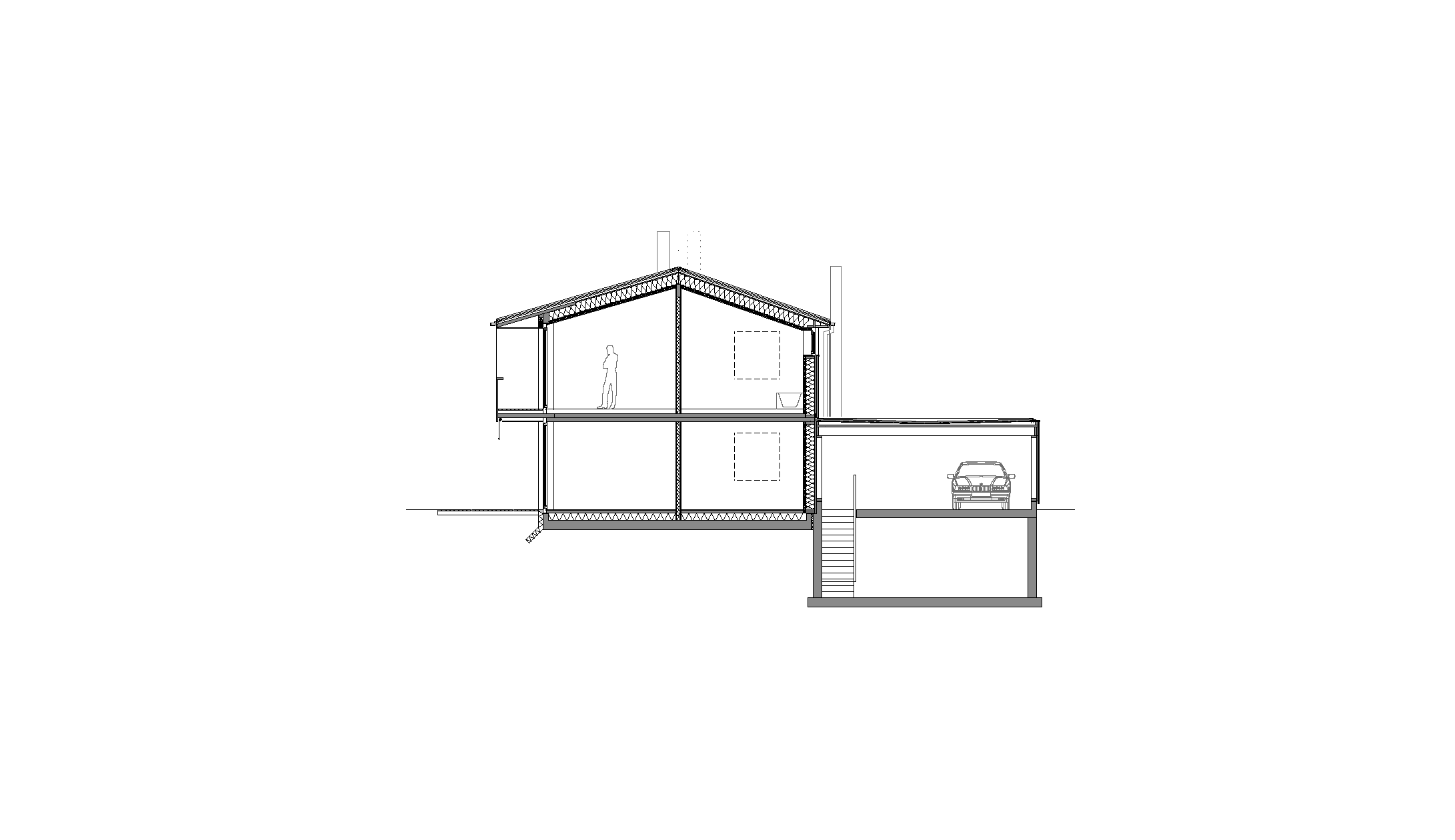 The firewood is stored in the carports from where it can be transported via a chute, if required, directly into the cellar which is underneath it. Unheated and accessible only by an external staircase, the cellar serves as a storage and boiler room, with log burner and storage tank. Unheated cellars and carports reduce construction costs considerably.