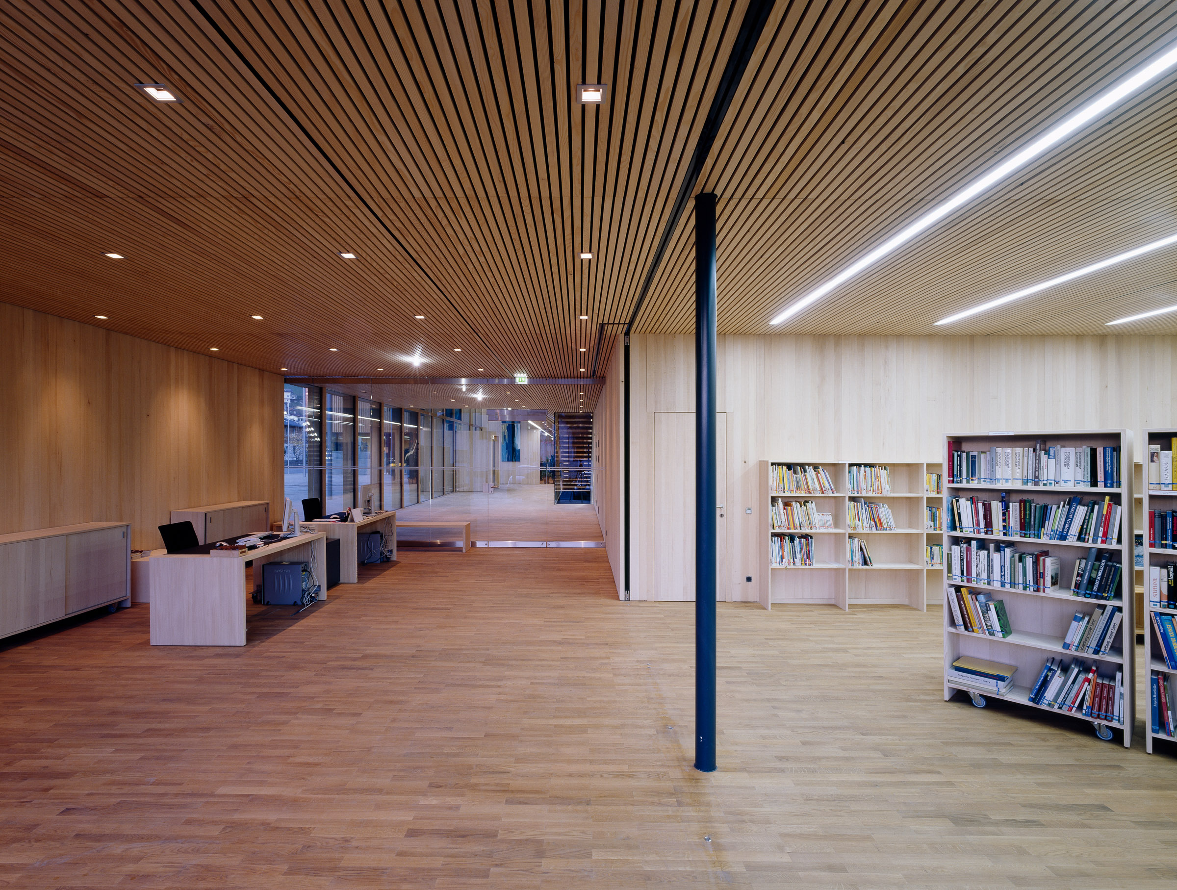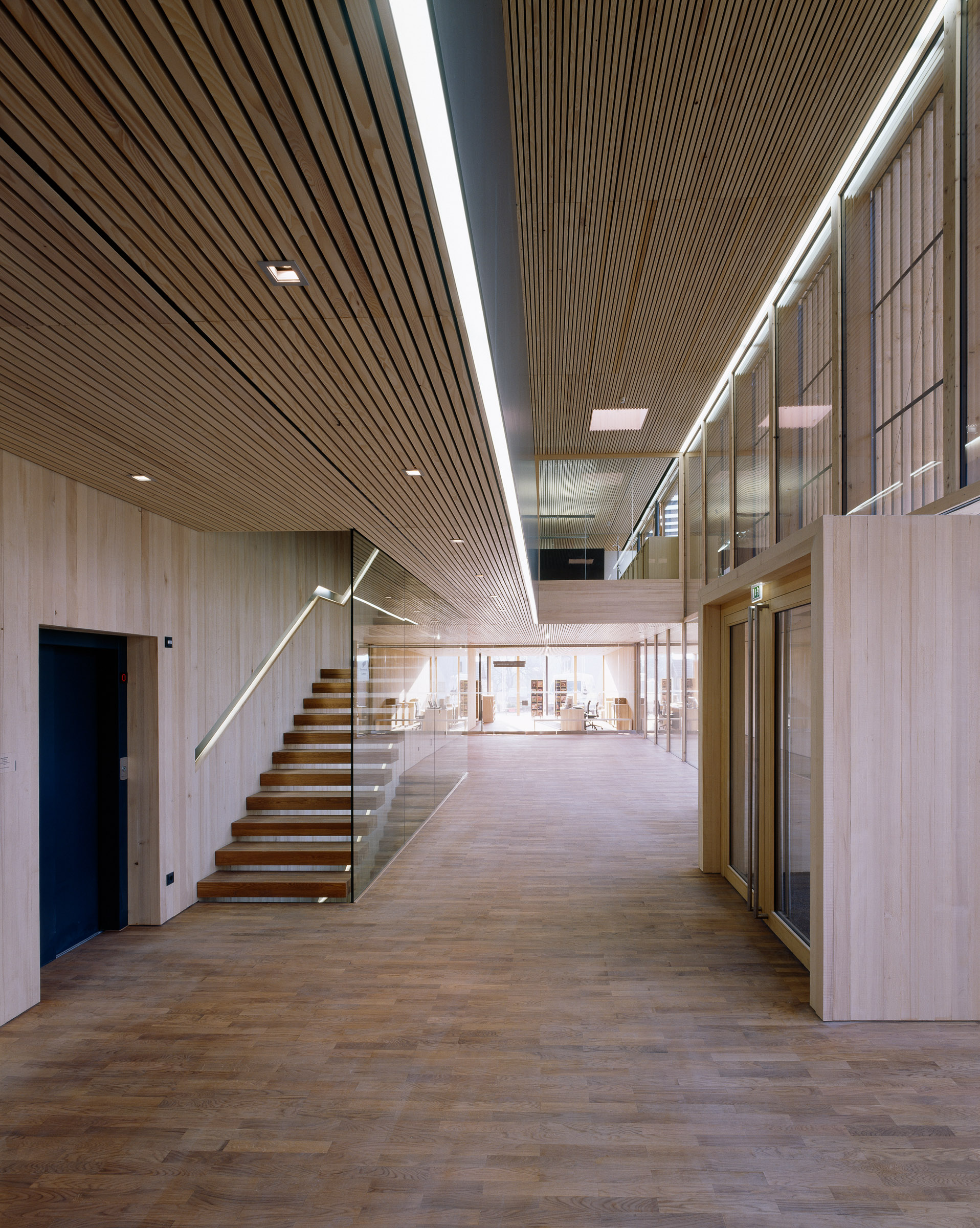 The timber construction elements were prefabricated by two local companies and assembled on site. Concrete anchors, screws and adhesive tapes were used for assembly in place of glue. Meticulous attention was paid to the sealing of the construction to avoid the use of substances that could, during both construction and after completion, negatively impact the indoor environment and its users. One result was the development of PVC-free sealing strips, which the manufacturer has since added to their standard product range. The selection and processing of the materials was subject to continuous inspection. Data sheets for each and every one of the project’s 214 products give detailed descriptions of their composition and ecological quality.