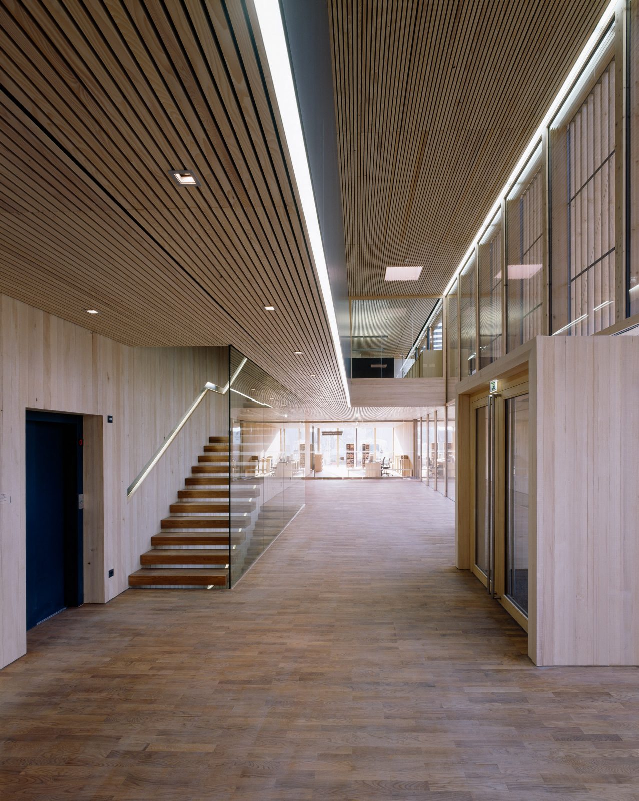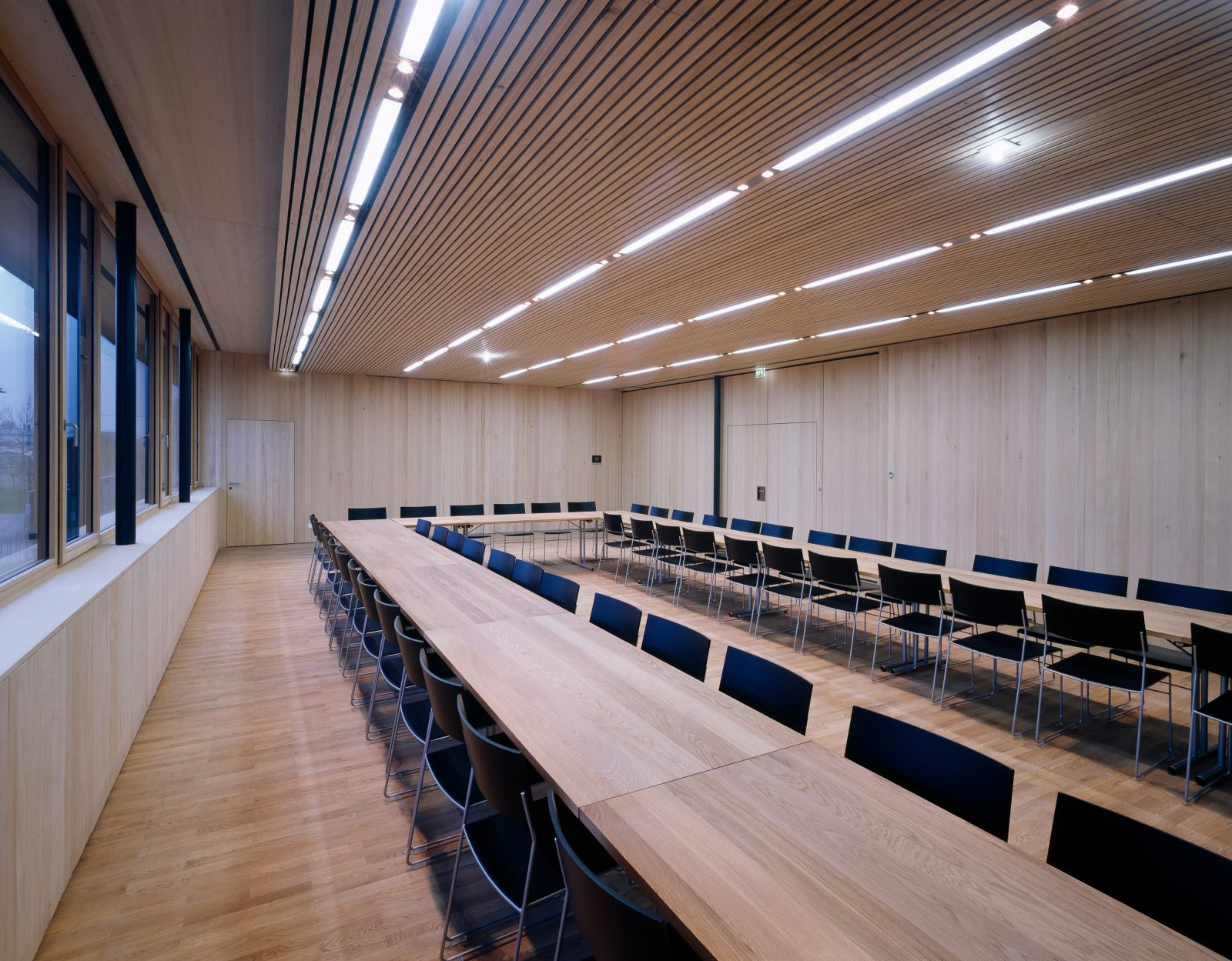 The two-story timber construction was erected over a reinforced concrete basement. The walls and ceilings are prefabricated box beams. The facades, as well as the interior walls and ceilings, are clad in silver fir. Depending on its particular use, the cladding is rough-sawn, wire-brushed or smoothly planed. The flooring of dark-oiled oak adds an element of contrast in the design. The timber used for the structure and the facade was grown locally. The interior was built of timber from the Schwarzwald region (80%) and Vosges, in the Alsace (20 %). The exterior walls were insulated with cellulose, and sheep wool was used as the insulation material for the fit-out and finishes.